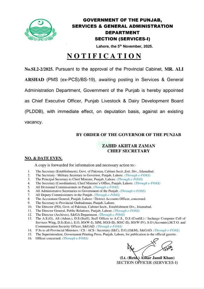صوبائی کابینہ کی منظوری کے بعد علی ارشد کو چیف ایگزیکٹو آفیسر پنجاب لائیوسٹاک اینڈ ڈیری ڈویلپمنٹ بورڈ تعینات کر دیا گیا