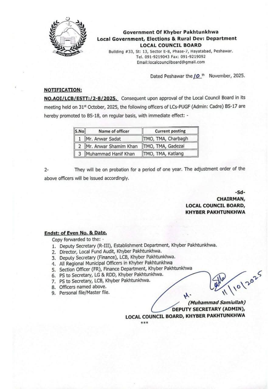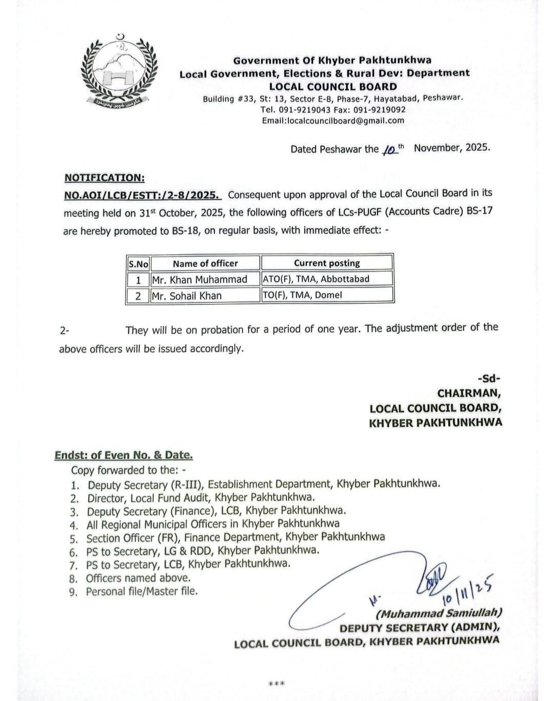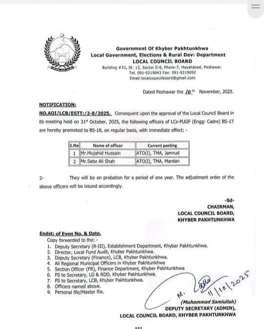 محکمہ بلدیات خیبرپختونخوا نے 7 افسران کو گریڈ 18 میں ترقی دے دی ہے۔محکمہ لوکل گورنمنٹ، الیکشنز و دیہی ترقی خیبرپختونخوا کی جانب سے جاری نوٹیفکیشن کے مطابق لوکل کونسل بورڈ کی 31 اکتوبر 2025 کی میٹنگ میں ترقیوں کے کیسیز کی منظوری کے بعد گریڈ 17 کے ایڈمن کیڈر کے افسران کو گریڈ 18 میں ترقی کا نوٹیفکیشن جاری کر دیا گیا ہے۔