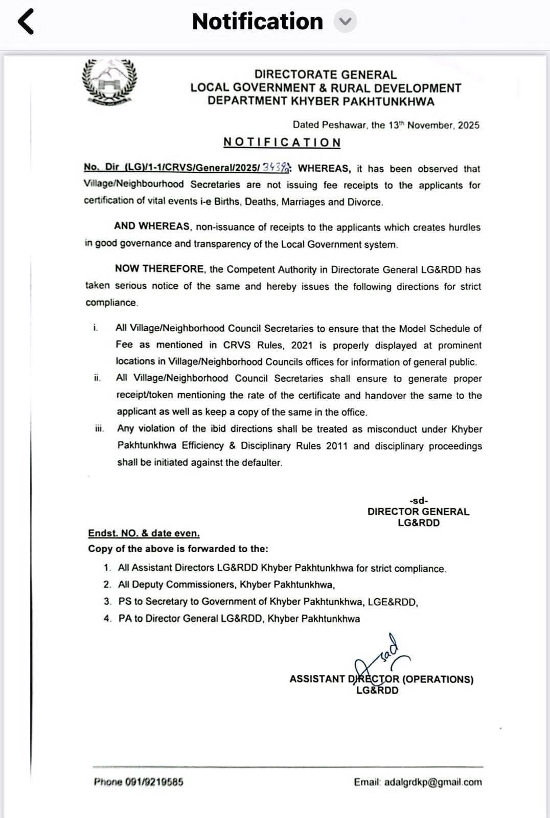 اسسٹنٹ ڈائریکٹر محکمہ بلدیات و دیہی ترقی تحصیل حسن خیل پشاور ملک ارشد خان کی جانب سے تمام ویلیج کونسل سیکرٹریز کو ہدایت جاری