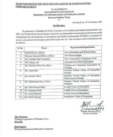 وفاقی حکومت نے کمیشن فار پروٹیکشن آف جنرنلسٹس اینڈ میڈیا پروفیشنلز تشکیل دے دی ۔۔۔۔۔کمیشن 12 ارکان پر مشتمل ہے