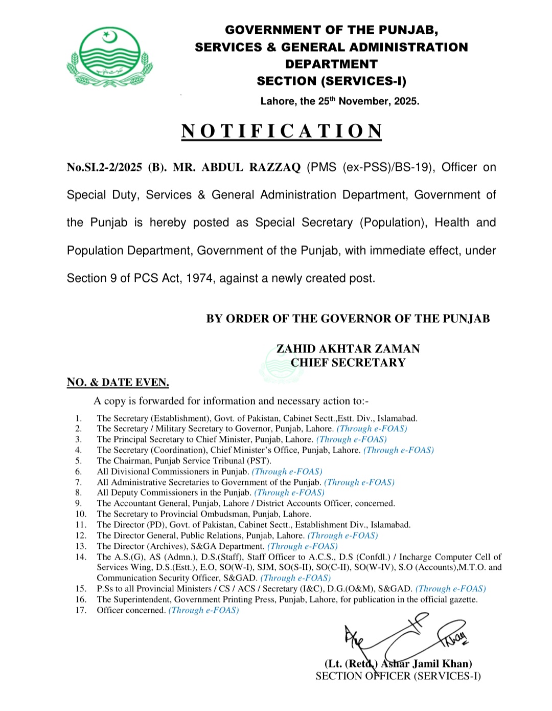 تقرری کے منتظر عبدالرزاق کو سپیشل سیکرٹری پاپولیشن ڈیپارٹمنٹ پنجاب تعینات کیا گیا ہے
