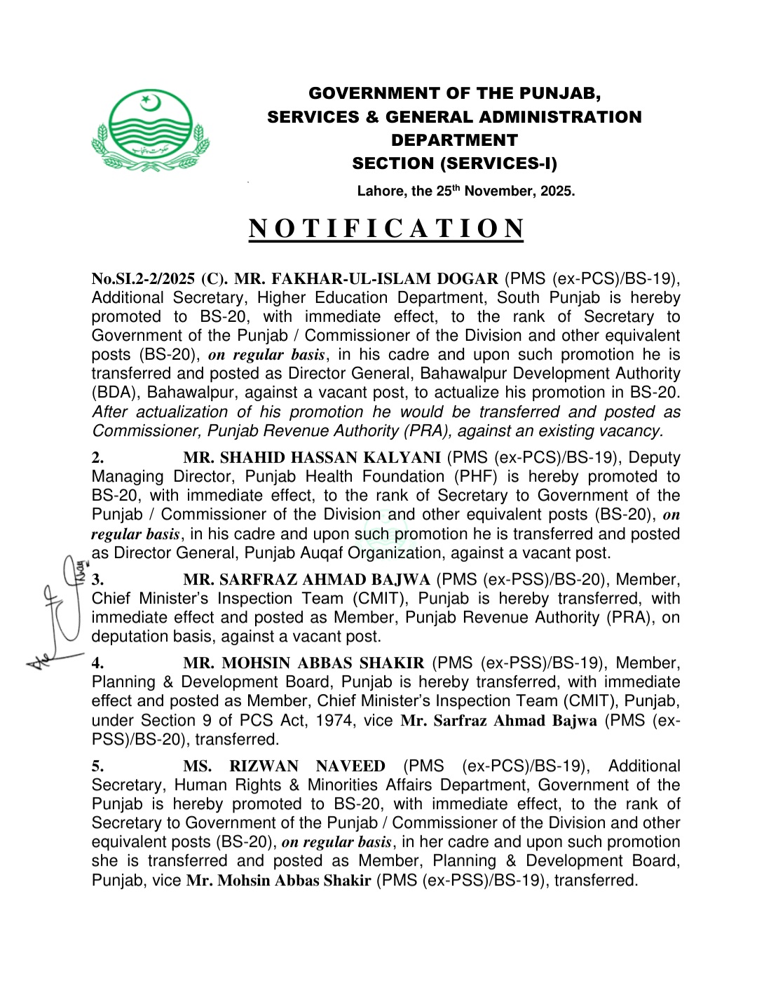 حکومت پنجاب نے سات افسران کو گریڈ 20 میں ترقی دے کر تقرریوں کے احکامات جاری کر دیئے ہیں۔فخر السلام ڈوگر ایڈیشنل سیکرٹری ہائر ایجوکیشن ڈیپارٹمنٹ جنوبی پنجاب کو گریڈ 20 میں ترقی دے کر ڈائریکٹر جنرل بہاولپور ڈویلپمنٹ اتھارٹی تعینات کردیا گیا ہے۔ڈپٹی منیجنگ ڈائریکٹر پنجاب ہیلتھ فاؤنڈیشن شاہد حسن کلیانی کو بھی گریڈ 20 میں مستقل بنیادوں پر ترقی دے کر ڈائریکٹر جنرل اوقاف تعینات کیا گیا ہے۔سرفراز احمد باجوہ ممبر چیف منسٹر انسپکشن ٹیم کو ممبر پنجاب ریونیو اتھارٹی لگا دیا گیا ہے۔محسن عباس شاکر ممبر پی اینڈ ڈی بورڈ کو ممبر چیف منسٹر انسپکشن ٹیم،رضوان نوید ایڈیشنل سیکرٹری ہیومن رائٹس اینڈ مینارٹیز آفیئر کو گریڈ 20 میں ترقی دے کرممبر پی اینڈ ڈی بورڈ تعینات کردیا گیا ہے۔نوید شہزاد مرزا جو تقرری کے منتظر تھے کو گریڈ 20 میں ترقی دے کر ایم ڈی پنجاب سیڈ کارپوریشن تعینات کیا گیا ہے۔صدف ظفر ایڈیشنل سیکرٹری سیاحت کو گریڈ 20 میں ترقی کے بعد ڈائریکٹر جنرل PILAC تعینات کردیا گیا ہے۔