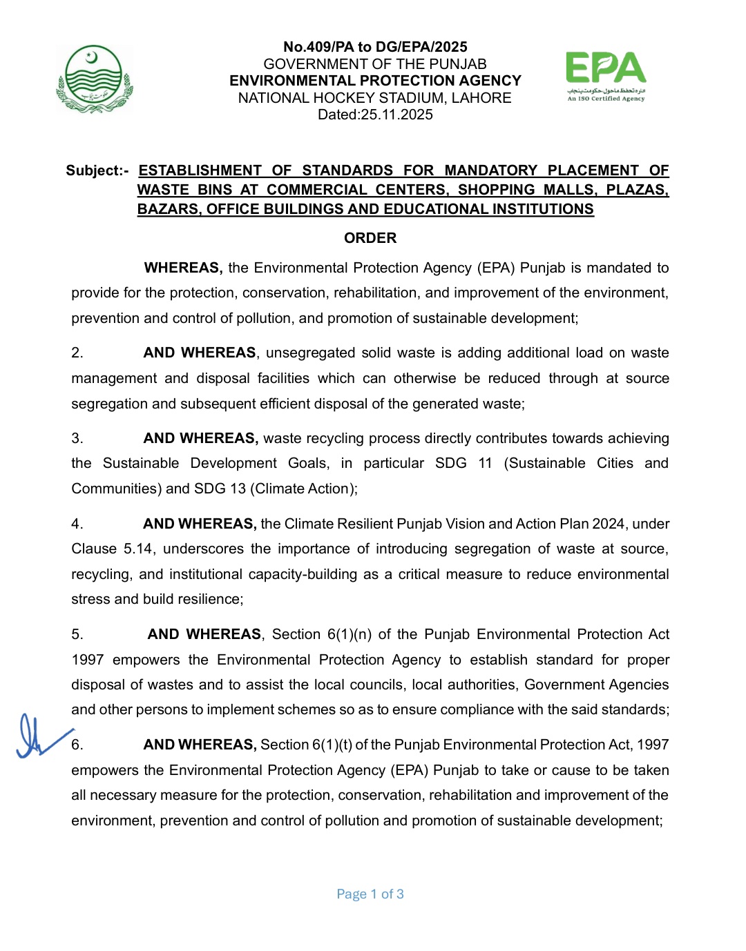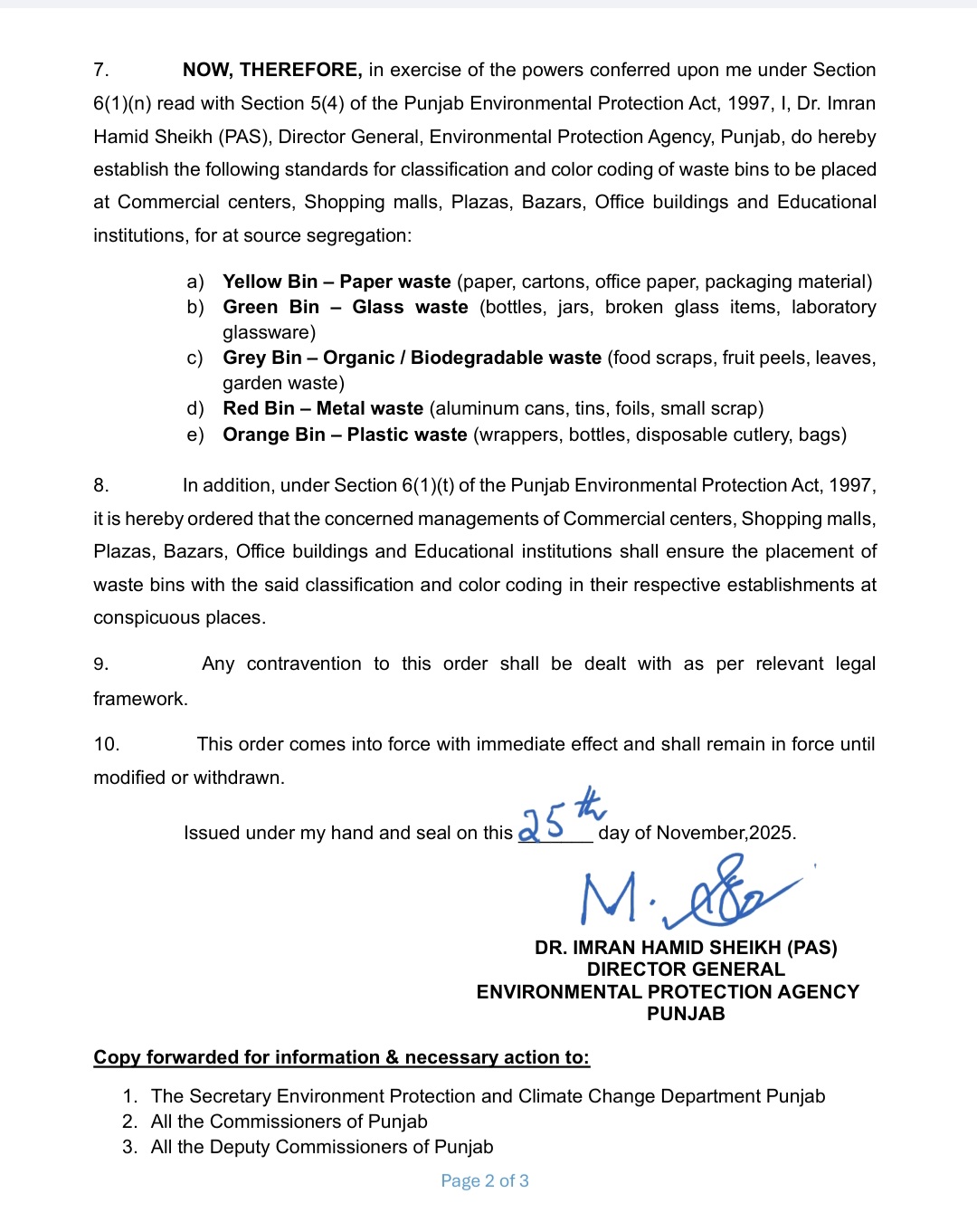 وزیراعلیٰ پنجاب مریم نواز شریف کی ہدایت پر صوبے بھر کے کمرشل مراکز، شاپنگ مالز، پلازوں اور دفاتر میں پانچ رنگوں کے ویسٹ بِن لازمی قرار دے دیئے گئے ہیں — ڈی جی ماحولیات پنجاب عمران حامد شیخ نے کہا ہے کہ وزیراعلیٰ پنجاب کے احکامات پر ای پی اے پنجاب کا بڑا اقدام ہے۔ویسٹ بِن نہ رکھنے والے تمام مراکز کے خلاف سخت کارروائی کا فیصلہ کیا گیا ہے۔وزیر اعلٰی مریم نواز شریف کی ڈائریکشن پر پیپر، گلاس، آرگینک، میٹل اور پلاسٹک کے لیے الگ بِن لازمی قرار دیئے گئے ہیں۔خلاف ورزی پر فوری قانونی کارروائی عمل میں لائی جائے گی۔ تمام تجارتی مقامات اور تعلیمی اداروں میں نمایاں مقامات پر بِن لگانے کا حکم بھی دیا جا چکا ہے— یہ فیصلہ فوری نافذ العمل ہو گا —