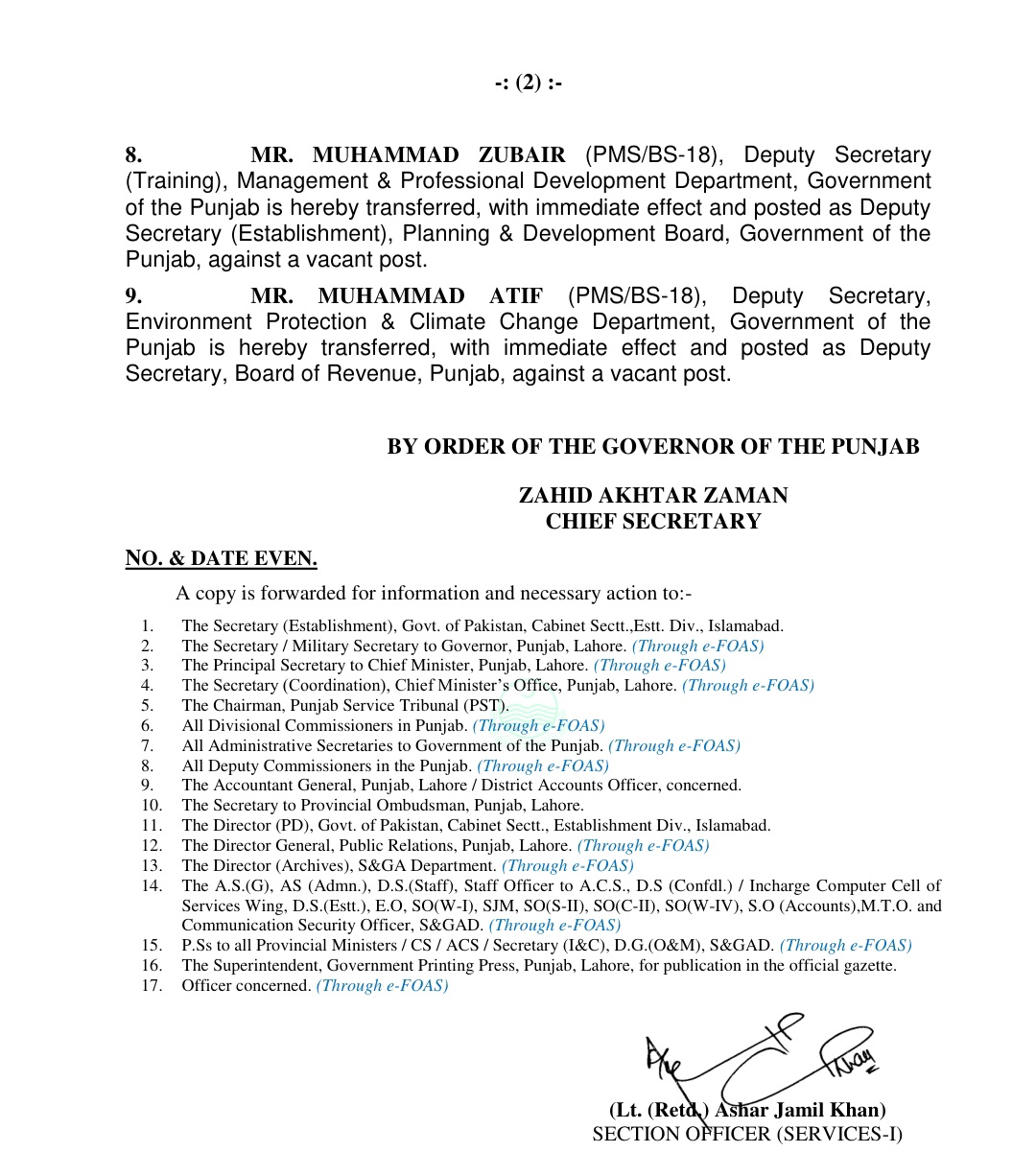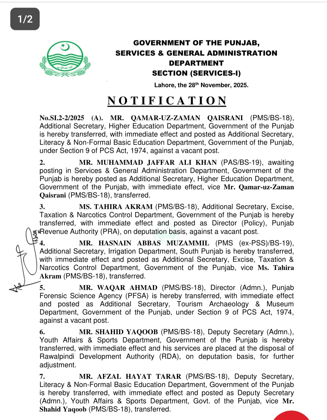 محمد جعفر علی خان کو ایڈیشنل سیکرٹری محکمہ ہائیر ایجوکیشن تعینات کردیا گیا ہے۔طاہرہ اکرام کو ڈائریکٹر پالیسی پنجاب ریونیو اتھارٹی تعینات کردیا گیا ہے۔حسنین عباس مزمل کو ایڈیشنل سیکرٹری محکمہ ایکسائز ٹیکسیشن تعینات کرنے کے احکامات جاری کئے گئے ہیں۔وقار احمد کو ایڈیشنل سیکرٹری محکمہ سیاحت تعینات کردیا گیا ہے۔افضل حیات تارڑ کو ڈپٹی سیکرٹری ایڈمن محکمہ یوتھ افئیرز اینڈ سپورٹس تعینات کردیا گیا ہے۔محمد زبیر کو ڈپٹی سیکرٹری اسٹیبلشمنٹ پلاننگ اینڈ ڈوپلپمنٹ بورڈ تعینات کردیا گیا ہے۔محمد عاطف کو ڈپٹی سیکرٹری بورڈ آف ریونیو تعینات کردیا گیا ہے۔