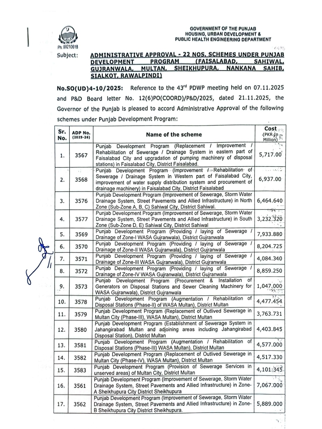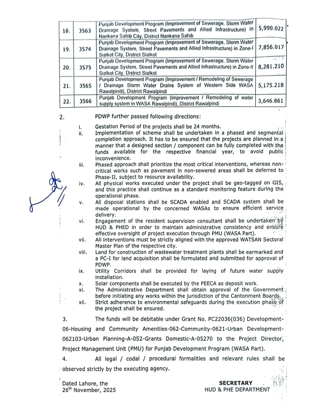 ترقیاتی منصوبوں کے تحت سیوریج اور واٹر سپلائی نظام جدید خطوط پر استوار کیا جائے گا،ترجمان محکمہ ہاؤسنگ کے مطابق منصوبوں کی تکمیل سے اربن فلڈنگ جیسے دیرینہ مسئلے کا حل ممکن بنایا جا سکے گامنصوبوں کی جلد از جلد تکمیل کو یقینی بنایا جائے گا۔تمام منصوبوں کو دو سال میں مکمل کیا جائے گا،ترجمان محکمہ ہاؤسنگ کے مطابق سمارٹ ایگزیکیوشن پلان کے تحت مرحلہ وار ترقیاتی کاموں کو مکمل کیا جائے گا۔سیکرٹری ہاؤسنگ کی ہدایت پر سمارٹ ایگزیکیوشن پلان کا مقصد وسائل کا موثر استعمال یقینی بنانا ہے۔پنجاب ڈویلپمنٹ پروگرام کے تحت تمام ترقیاتی کاموں کی موثر مانیٹرنگ کے لیے جیو ٹیگنگ کی جائے گی۔تمام ڈسپوزل اسٹیشنز پر سکاڈا سسٹم تعینات کیا جائے گا۔تمام ترقیاتی کام WATSAN کے تحت منظور شدہ ماسٹر پلانز کے مطابق کیے جائیں گے۔ویسٹ واٹر ٹریٹمنٹ پلانٹس کی تعمیر کےلیے درکار زمین خریدی جائے گی۔وسائل کی بچت کے لیے یوٹیلٹی سروسز کے لیے خصوصی انڈرگراؤنڈ کوریڈور بنایا جائے گا۔