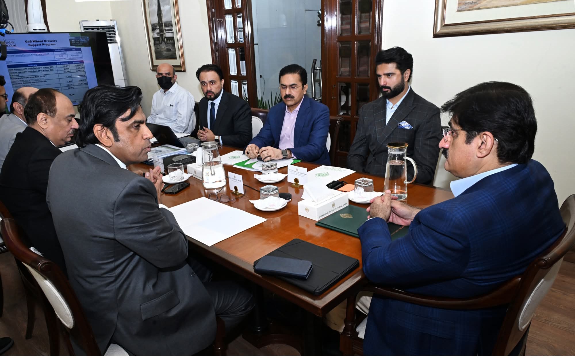 وزیراعلیٰ سندھ سید مراد علی شاہ نے 2025ء کے لیے گندم کاشتکاروں کی معاونت کے پروگرام کے جائزہ اجلاس کی صدارت کرتے ہوئے کسانوں کو فوری معاونت فراہم کرنے کی ضرورت پر زور دیا اور اکاؤنٹس کی تیز تر فعالیت اور فنڈز کی منتقلی کی ہدایت کی۔وزیراعلیٰ نے سندھ بینک کو اکاؤنٹس کی تصدیق، فعال بنانے اور ادائیگیوں کے اجرا کے عمل کو تیز کرنے کی سخت ہدایت دیتے ہوئے کہا کہ ڈائی امونیم فاسفیٹ (ڈی اے پی) کھاد کی سبسڈی میں تاخیر کے باعث کئی کسان بوائی کا اہم وقت گنوا چکے ہیں۔یہ اجلاس وزیراعلیٰ ہاؤس میں منعقد ہوا جس میں وزیر زراعت سردار محمد بخش خان مہر، چیف سیکریٹری آصف حیدر شاہ، سیکریٹری برائے وزیراعلیٰ عبدالرحیم شیخ، سیکریٹری زراعت محمد زمان ناریجو، سندھ بینک کے صدر انور شیخ اور دیگر اہم حکام شریک تھے۔پروگرام کے تحت سندھ بھر میں ایک سے پچیس ایکڑ کے مالک 4,00,875 کسانوں نے فیلڈ افسران کی مدد سے رجسٹریشن کرائی ہے۔ ان میں سے 3,38,192 رجسٹریشنز منظور ہو چکی ہیں جو پروگرام کے وسیع اثرات کو ظاہر کرتی ہیں۔نومبر کے آخر تک اکاؤنٹس کھولنے اور فنڈز کی منتقلی کا عمل جاری تھا جبکہ دسیوں ہزار اکاؤنٹس کھولے جا چکے تھے۔ سندھ بینک کو اکاؤنٹس کی فعال کرنے میں تیزی لانے، فنڈز کی فوری منتقلی، حق داروں کو بروقت آگاہی، فراہمی کی باقاعدہ معلومات اور محکمہ زراعت کو روزانہ کی بنیاد پر ڈیٹا دینے کی ہدایت کی گئی۔پروگرام کو مزید موثر بنانے کے لیے بینکوں اور محکمہ زراعت کے درمیان روزانہ کی بنیاد پر ڈیٹا کا تبادلہ اب معمول کا حصہ بن گیا ہے۔ وزیراعلیٰ نے ایک ریئل ٹائم مانیٹرنگ ڈیش بورڈ کا بھی جائزہ لیا اور پروگرام پر بروقت عملدرآمد یقینی بنانے کے لیے ذاتی نگرانی کے عزم کا اظہار کیا۔سید مراد علی شاہ نے 2025ء کے سندھ گندم کاشتکار معاونت پروگرام کو ایک اہم منصوبہ قرار دیتے ہوئے صوبائی حکومت کے اس عزم کا اعادہ کیا کہ وہ اہم بوائی کے موسم میں کسانوں کو کھاد خریدنے میں مدد فراہم کرے گی۔ تمام متعلقہ حکام کو ہدایت کی گئی کہ وہ منصوبے کے مقاصد مقررہ وقت میں حاصل کرنے کے لیے توجہ مرکوز رکھیں اور بروقت پیش رفت رپورٹ جمع کرائیں۔