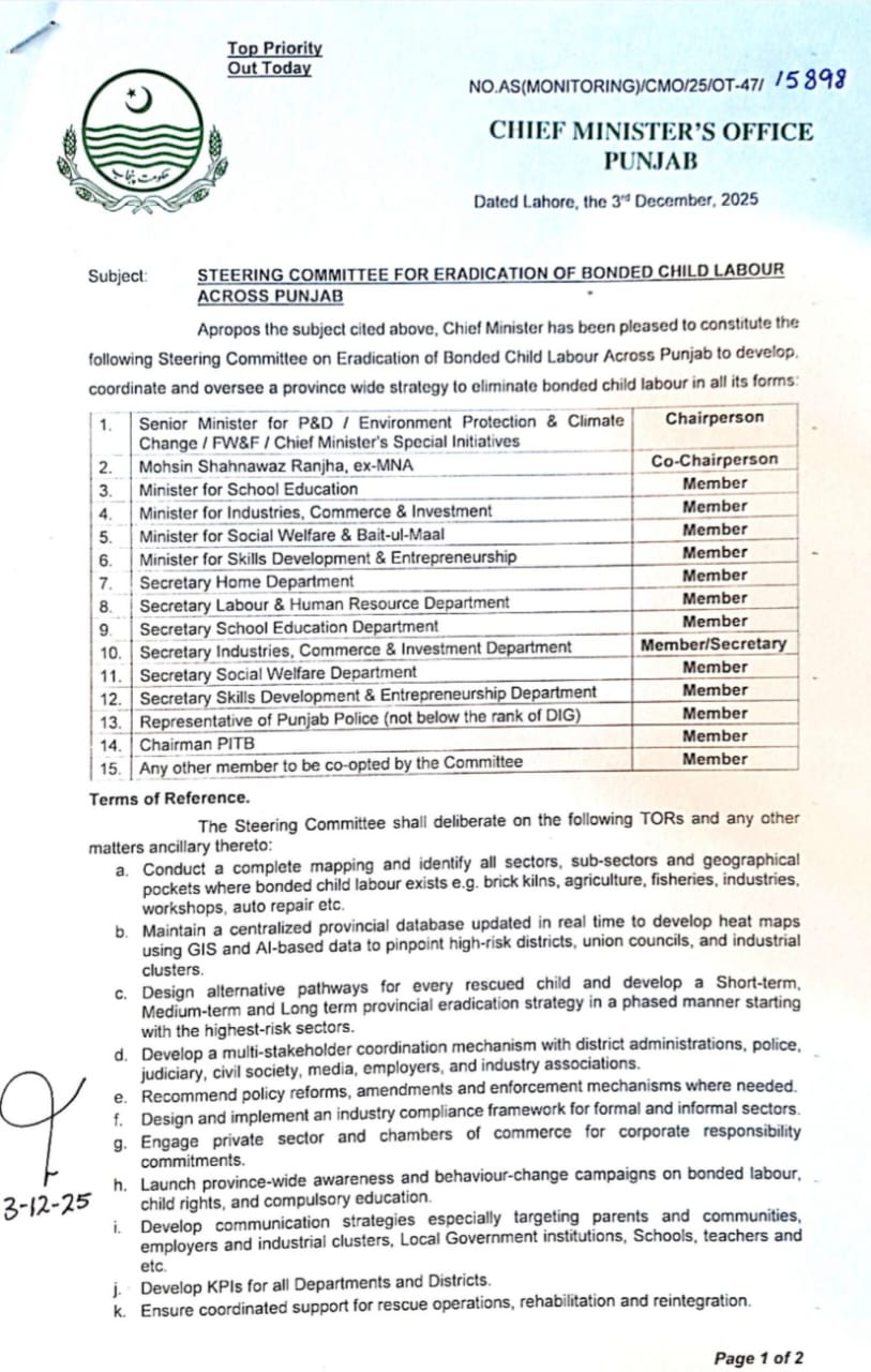 سابق رکن قومی اسمبلی محسن شاہنواز رانجھا سٹیرنگ کمیٹی کے شریک چیئرمین ہوں گے۔نوٹیفیکیشن جاری کر دیا گیا جس کے مطابق سکول ایجوکیشن، سرمایہ کاری و کامرس، صنعت و تجارت، سوشل ویلفیئر و بیت المال اور ہنرمندی و چھوٹے کاروبار کی ترقی کے صوبائی وزرا کمیٹی کے ارکان ہوں گے۔داخلہ، محنت و افرادی، سکول ایجوکیشن، صنعت و تجارت، سوشل ویلفیئر، سکل ڈویلپمنٹ اینڈ اینٹرپرینیور کی وزارتوں کے صوبائی سیکریٹری، چیئرمین پی ٹی آئی بی اور ڈی آئی جی پولیس بھی کمیٹی کے ارکان ہوں گے۔کمیٹی تمام شعبوں کی میپنگ کرے گی، جبری مشقت لینے والے شعبوں کا تعین کرے گی۔ صنعتوں، بھٹوں، زراعت، ماہی گیری، ورکشاپس اور آٹو ری پئیر کے شعبوں کا خاص طور پر ڈیٹا جمع کیا جائے گا۔اے آئی اور ‘جی-آئی-ایس’ سے منسلک صوبائی سطح پر مرکزی ڈیٹا بینک بنایا جائے گا۔کمیٹی بچوں سے جبری مشقت کے حوالے سے نمایاں اضلاع، شعبوں اور علاقوں کا بھی تعین کرے گی۔کمیٹی جبری مشقت کے شکار بچوں کے لیے متبادل طریقے بھی وضع کرے گی۔کمیٹی فوری، وسط اور طویل مدتی بنیادوں پر بچوں سے جبری مشقت کے خاتمے کی حکمت عملی تیار کرے گی۔کمیٹی اپنی تجاویز کے ساتھ ان پر عملدرآمد کی حکمت عملی بھی تیار کرے گی۔والدین، اساتذہ اور معاشرے کے تمام طبقات کو اس معاملے میں آگاہ کرنے کی حکمت عملی اور اداروں کی اس ضمن میں کارکردگی جانچنے کے معیار کی تیاری بھی کمیٹی کے فرائض میں شامل ہے ۔صوبہ پنجاب بچوں سے جبری مشقت کے خاتمے کے لیے اس نوعیت کے جامع اقدامات کرنے والا پہلا صوبہ ہے ۔بچوں سے جبری مشقت کے خاتمے کے اقدامات کے نتیجے میں صوبہ پنجاب کی عالمی سطح پر رینکنگ بھی بہتر ہوگی۔