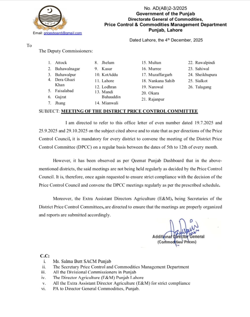 ترجمان پرائس کنٹرول کموڈٹیز مینجمنٹ کے مطابق تمام اضلاع کے ڈپٹی کمشنرز تواتر سےہر ماہ کی5 سے 12 تاریخ کو ڈسٹرکٹ پرائس کنٹرول کمیٹی کا اجلاس منعقد کرانے کے پابند ہوں گے-جن کو مراسلہ جاری کیا گیا ہے ان میں ڈپٹی کمشنر اٹک، ،ہاولپور بہاولنگر، ڈی جی خان ،فیصل اباد،گجرات ،جھنگ ،