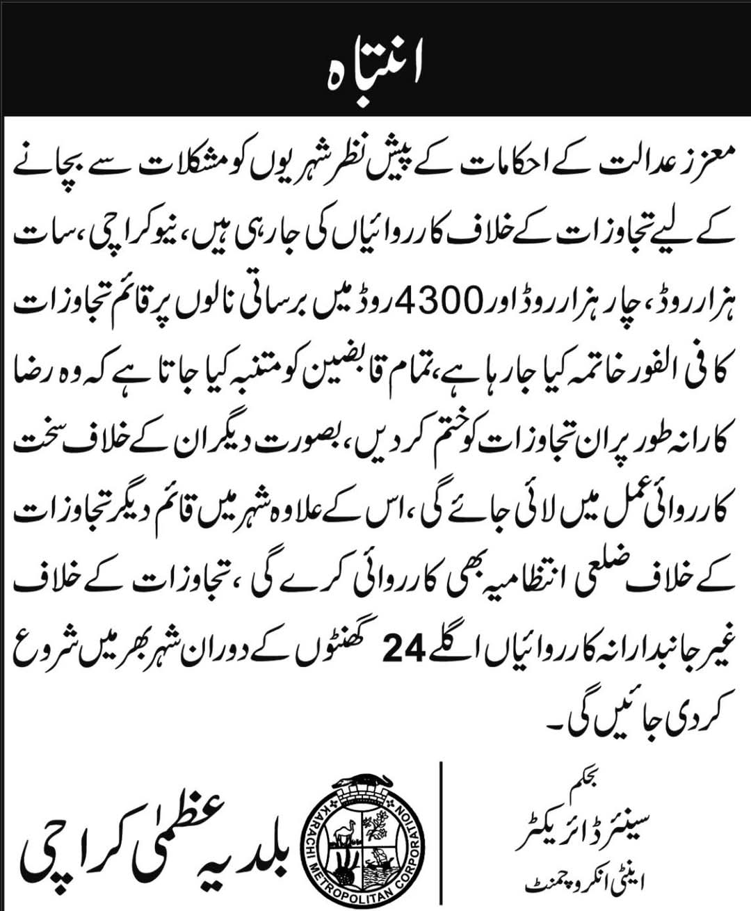 میٹرو پولیٹن کارپوریشن کراچی کی جانب سےگرینڈ آپریشن کے اعلان اور زیرو ٹولیرنس پالیسی کے بعد ٹیم نے کاروائیاں تیز کردی ہے اور رات کو ڈبل شفٹ سینئر ڈائریکٹر عمار خان کی نگرانی میں آپریشن جاری ہیں۔ ناظم آباد میں میٹرک بورڈ آفس کے سامنے لگا غیر قانونی بازار کو مسمار کرنے کے ساتھ سامان بھی ضبط کرلیا گیا ہے اور دوبارہ بازار لگانے پر کیس داخل کرنے کا فیصلہ کیا گیا ہے ۔