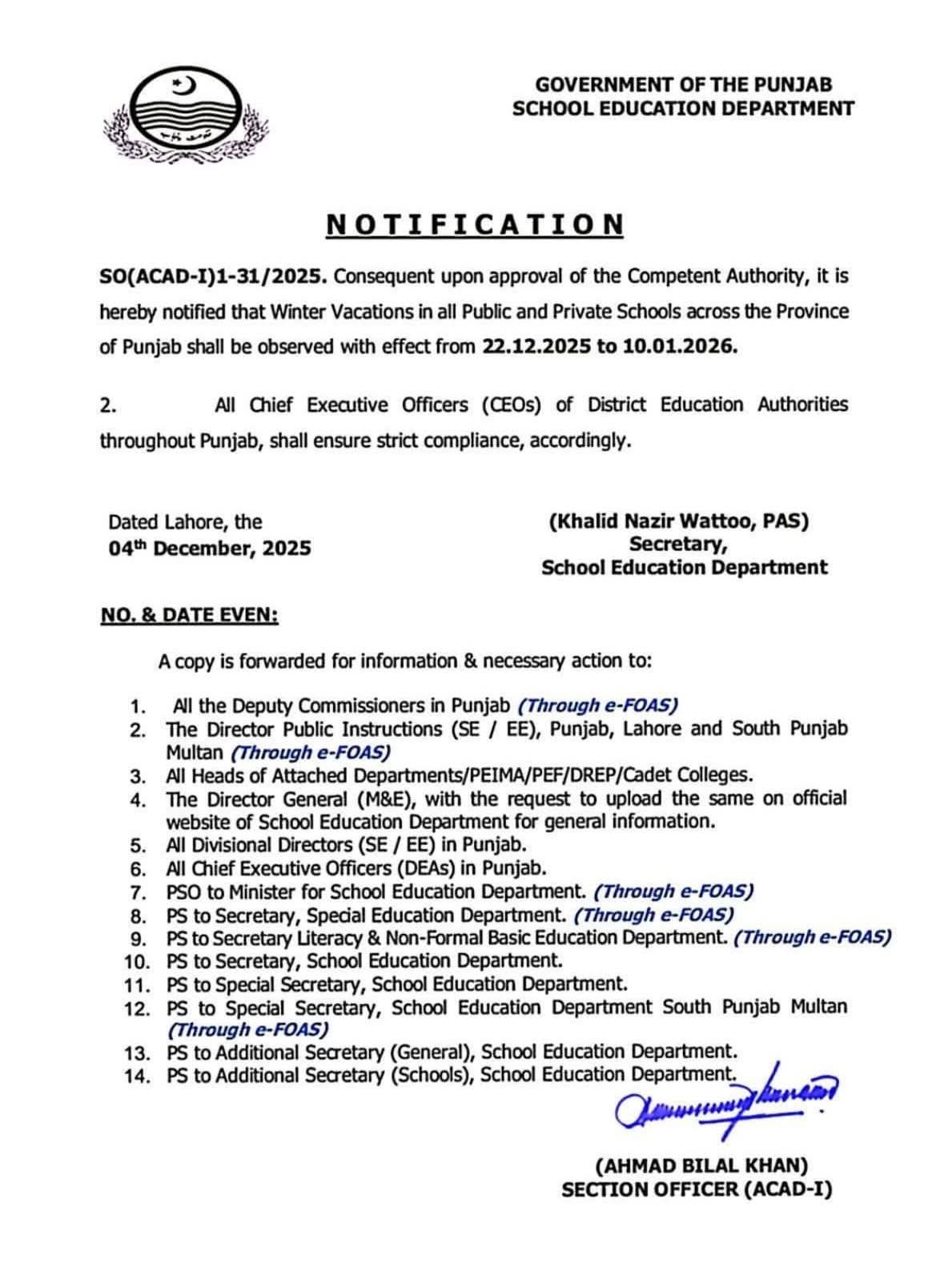 پنجاب کے سکولوں میں موسم سرما کی چھٹیاں 22 دسمبر سے ہونگی .موسم سرما کی چھٹیاں 10 جنوری 2026