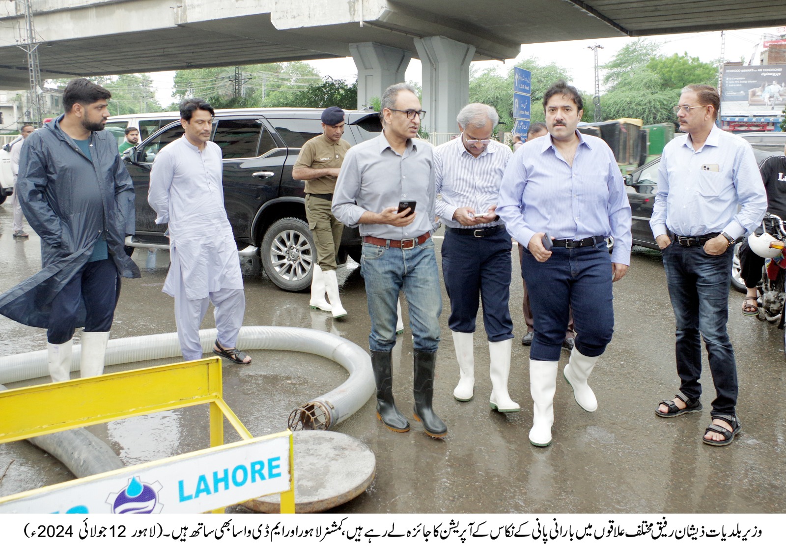 وزیراعلٰی پنجاب مریم نواز شریف کی ہدایت پر وزیر بلدیات ذیشان رفیق نے لاہور کے مختلف علاقوں کا دورہ کر کے طوفانی بارش کے بعد نکاسی آب کی کارروائیوں کا جائزہ لیا۔ کمشنر لاہور زید بن مقصود اور ایم ڈی واسا غفران احمد بھی صوبائی وزیر کے ساتھ تھے۔ صوبائی وزیر پہلے مرحلے میں لکشمی چوک اور عابد مارکیٹ گئے جہاں انہوں نے واسا حکام کو جلد از جلد پانی کے نکاس کی ہدایت کی۔ بعدازاں وزیر بلدیات نے تاجپورہ سکیم کا دورہ کیا