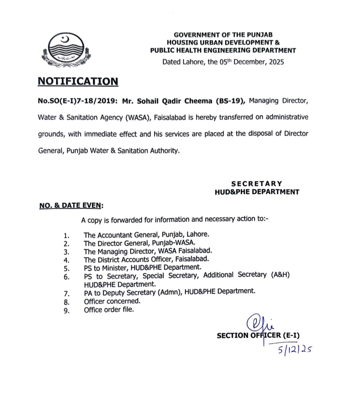 ایم ڈی واسا فیصل آباد سہیل قادر چیمہ کو تبدیل کر دیا گیا ہے۔سیکرٹری ہاؤسنگ نوراالامین مینگل کی ہدایت پر نوٹیفکیشن جاری کر دیا گیا ہے۔سہیل قادر چیمہ کو ڈی جی واسا پنجاب کے ڈسپوزل پر دے دیا گیا ہے۔محکمہ ہاؤسنگ کے مطابق نئے ایم ڈی واسا فیصل آباد کی تعیناتی کا فیصلہ سرچ کمیٹی کرے گی۔اہلیت اور میرٹ کی بنیاد پر اہم عہدے پر تعیناتی کی جائے گی۔سہیل قادر چیمہ گریڈ 19 کے سینئر آفیسر ہیں جن کے تبادلے کے بعد محکمہ ہاؤسنگ اربن ڈویلپمنٹ،پبلک ہیلتھ اینڈ انجینئرنگ کے افسران نے اعلٰی حکام کی توجہ ایم ڈی واسا سیالکوٹ کی غیر قانونی تقرری جانب دلائی ہے جو لوکل گورنمنٹ سروس کے گریڈ 17 کے آفیسر ہیں۔اور ضلع کونسل سیالکوٹ کے میں ڈسٹرکٹ آفیسر ریگولیشنز تعینات ہیں جنھیں چیف آفیسر کا اضافی چارج دینے کے ساتھ ایم ڈی واسا سیالکوٹ کو بھی اضافی چارج دے کر نوازا گیا ہے۔افسران کی جانب سے تشویش کا اظہار کرتے ہوئے مطالبہ کیا گیا ہے کہ محکمہ کے سنئیر آفیسر کو ریگولر بنیاد پر تعینات کیا جائے۔