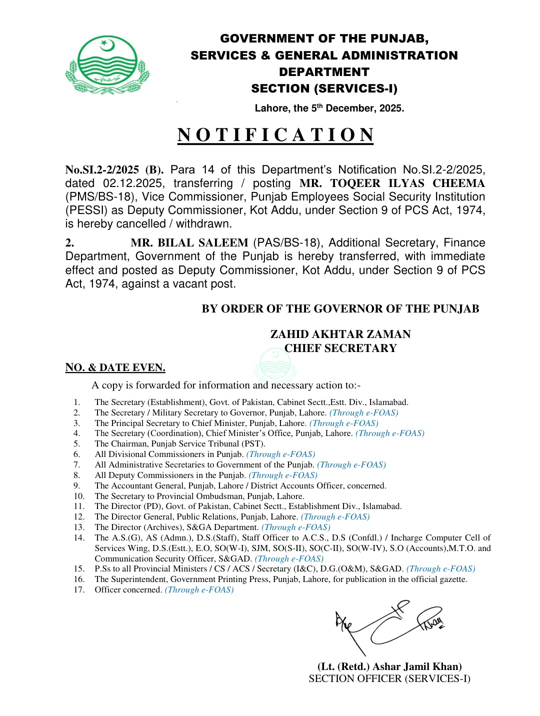 حکومت پنجاب نے توقیر الیاس چیمہ کا بطور ڈپٹی کمشنر کوٹ ادو تبادلہ منسوخ کر دیا ہے۔ایڈیشنل سیکرٹری فنانس بلال سلیم کو ڈپٹی کمشنر کوٹ ادو تعینات کردیا گیا۔چیف سیکرٹری پنجاب کی جانب سے نوٹیفکیشن جاری کر دیا گیا ہے۔