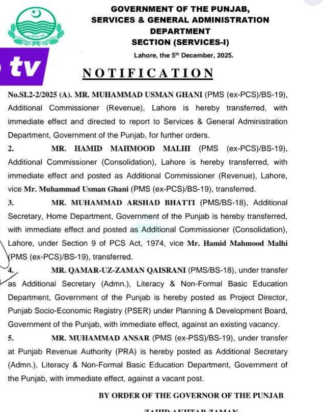 ایڈیشنل کمشنر کونسولیڈیشن لاہور حامد محمود ملہی کو ایڈیشنل کمشنر ریونیو لاہور تعینات کردیا گیا ہے۔ایڈیشنل سیکرٹری ہوم ڈیپارٹمنٹ محمد ارشد بھٹی کو ایڈیشنل کمشنر کونسولیڈیشن لاہور تعینات کردیا گیا ہے۔محمد عنصر کو ایڈیشنل سیکرٹری ایڈمن محکمہ لٹریسی اینڈ نان فارمل بیسک ایجوکیشن تعینات کردیا گیا ہے۔