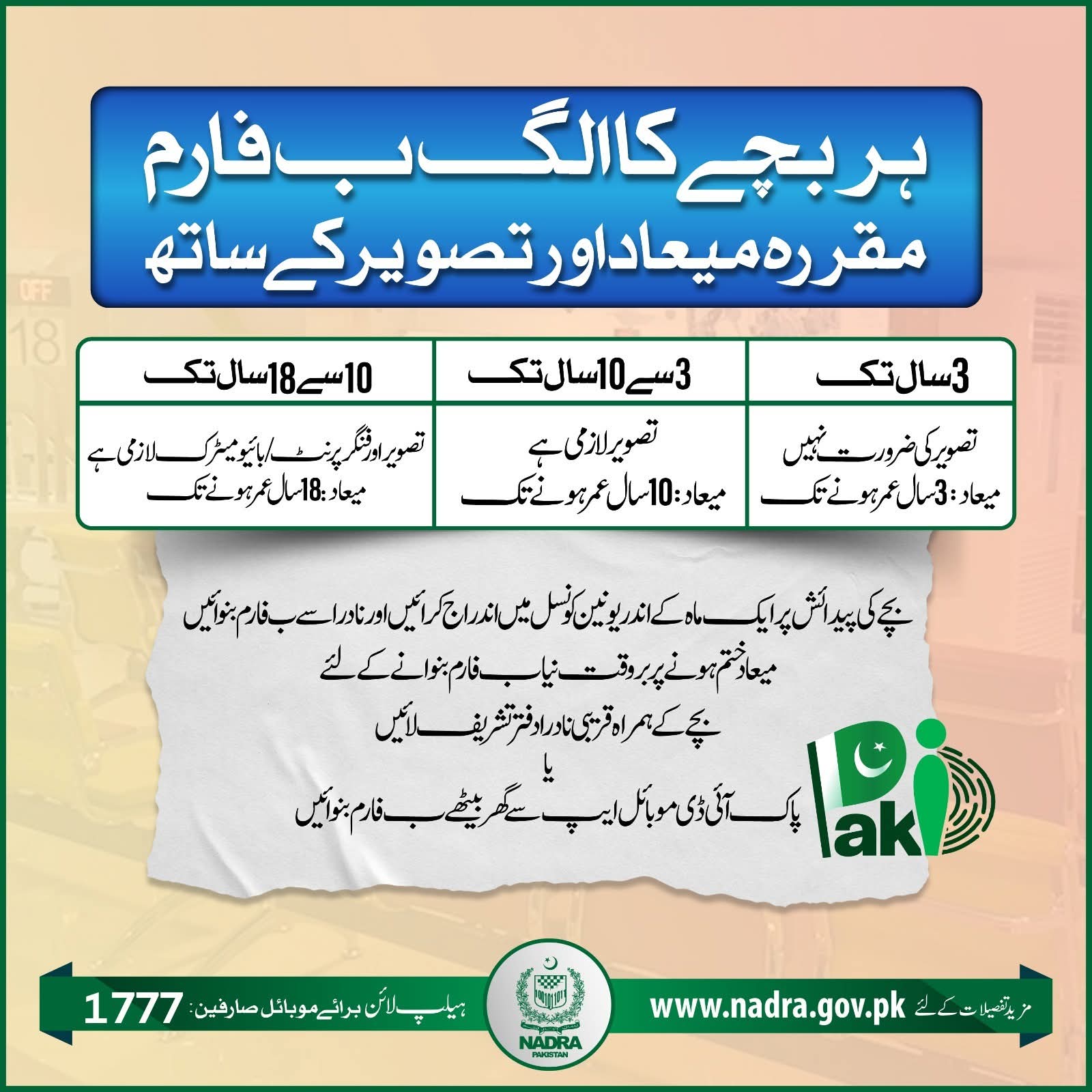 میعاد ختم ہونے پر بروقت نیا ب فارم بنوانے کے لئے بچے کے ہمراہ قریبی نادرا دفتر تشریف لائیں یا