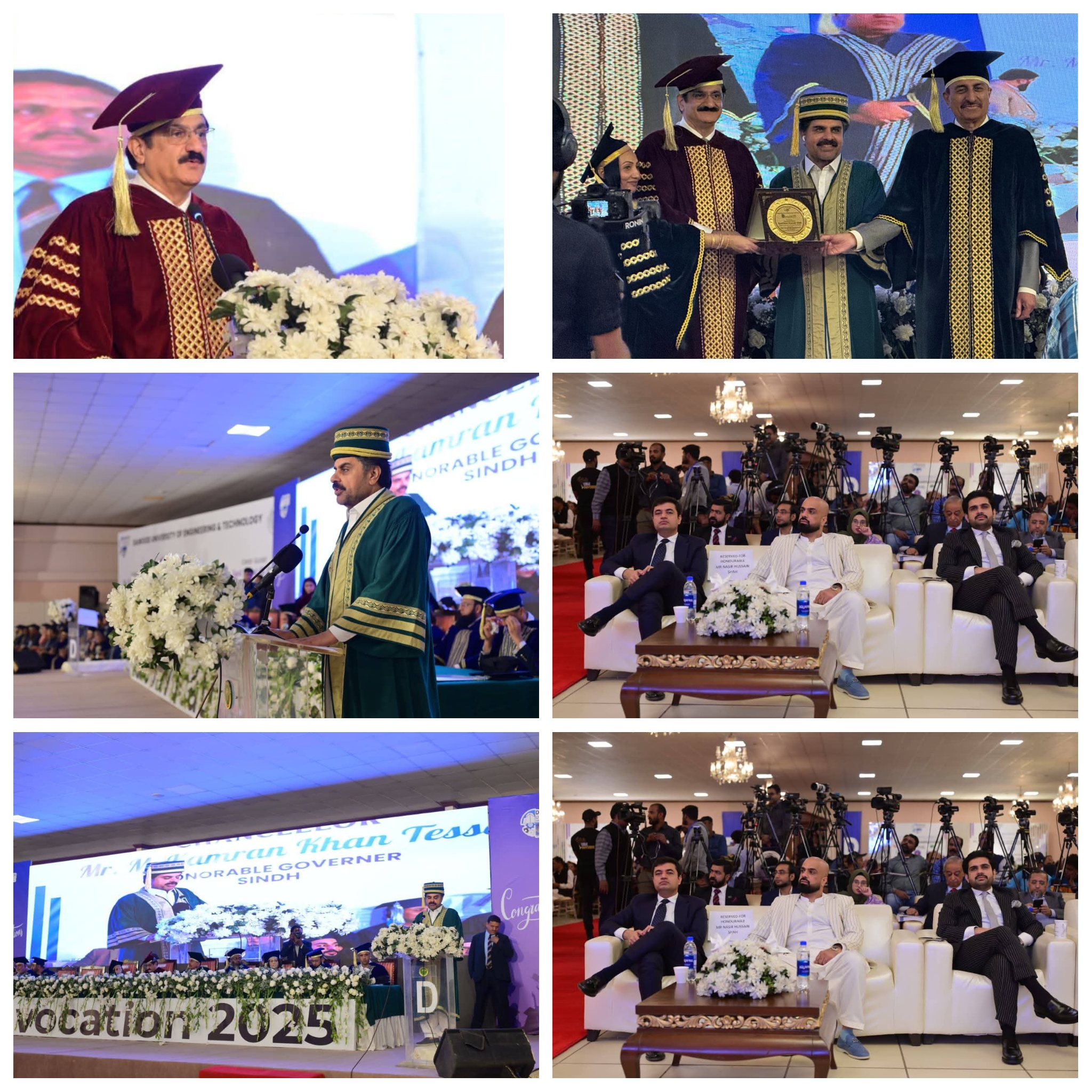 تقریب کے دوران وزیرِ اعلیٰ نے سندھ کے وزیرِ بلدیات اور ڈی یو ای ٹی کے گریجویٹ ڈاکٹر سید ناصر حسین شاہ کو عوامی خدمت میں ان کی خدمات اور یونیورسٹی سے دیرینہ وابستگی کے اعتراف میں اعزازی ڈاکٹریٹ کی ڈگری بھی عطا کی۔ تقریب میں وزیرِ بلدیات ڈاکٹر سید ناصر حسین شاہ، وزیر یو اینڈ بی اسماعیل راہو، چیئرمین ہائر ایجوکیشن کمیشن پروفیسر طارق رفی، ارکانِ حکومت، سفارتکار، فیکلٹی، والدین اور گریجویٹس نے شرکت کی۔اپنے خطاب میں مراد علی شاہ نے گریجویٹس کو مبارکباد دی اور فروری 2023 سے ڈی یو ای ٹی کی تبدیلی کو قابلِ قیادت اور ادارہ جاتی نظم و ضبط کا نتیجہ قرار دیا۔ انہوں نے کہا کہ یہ ادارہ وسائل کی کمی اور خسارے میں چلنے والے ادارے سے ایک مالی طور پر مستحکم یونیورسٹی بن چکا ہے جو اپنے مستقبل میں اعتماد کے ساتھ سرمایہ کاری کر رہا ہے۔انہوں نے بتایا کہ محدود جگہ اور دیرینہ مالی مشکلات کے باوجود ڈی یو ای ٹی نے اپنی ہی وسائل سے 75 کروڑ روپے اہم سہولیات کی بہتری پر خرچ کیے ہیں۔ ان میں جدید طرز کا مکمل طور پر نیا آڈیٹوریم، پویلین کے ساتھ نیا اسپورٹس گراؤنڈ، اپ گریڈ شدہ ہاسٹلز، میٹیریل انجینئرنگ، پیٹرولیم انجینئرنگ اور انرجی و ماحولیات کی خصوصی لیبارٹریز، اور گلبرگ میں فیکلٹی آف انفارمیشن اینڈ کمپیوٹنگ سائنسز کے لیے جدید اے وی آر لیبز سمیت توسیع شدہ سہولیات شامل ہیں۔ انہوں نے کہا کہ یہ بہتریاں ایک ایسے ادارے کی عکاسی کرتی ہیں جس نے شفافیت، مالی نظم و ضبط اور جدت پسند حکمتِ عملی کو اپنا کر طلبہ کے لیے نئے راستے کھولے ہیں۔وزیرِ اعلیٰ نے ڈی یو ای ٹی کی تیز رفتار تعلیمی ترقی کو بھی اجاگر کیا جس میں کیو ایس ایشیا رینکنگ میں بہتری، یوتھ ڈیولپمنٹ پروگرام کے اسکور میں 53 فیصد سے 84.13 فیصد اضافہ، اور ٹائمز ہائر ایجوکیشن کے ایس ڈی جی اشاریوں میں پیش رفت شامل ہے۔ مراد شاہ نے پاکستان کی تاریخ میں پہلی خاتون انجینئرنگ وائس چانسلر، انجینئر پروفیسر ڈاکٹر ثمرین حسین کی ادارہ جاتی اصلاحات پر تعریف کی۔وزیرِ اعلیٰ نے ڈی یو ای ٹی کے نئے ریسرچ پروجیکٹ ڈیولپمنٹ یونٹ ناستپ سلیکون ویلی میں، صنعتی روزگار پروگرامز جن کی ملازمت کی شرح 80 فیصد ہے اور مائیکرو ڈگری و کاروباری پروگرامز کا بھی ذکر کیا جن کی بدولت طلبہ ڈگری مکمل کرنے سے پہلے روزگار حاصل کر رہے ہیں۔620 امیدواروں میں سے اس سال 413 طلبہ نے گریجویشن کی، جن میں سے 66 فیصد پہلے ہی ملازمت حاصل کر چکے ہیں۔ وزیرِ اعلیٰ نے کہا کہ یہ ڈی یو ای ٹی کے صنعت سے بڑھتے ہوئے روابط اور مارکیٹ پر مبنی تعلیم کے عزم کا ثبوت ہے۔گریجویٹس سے خطاب میں وزیرِ اعلیٰ نے کہا کہ وہ جدت، دیانت اور خدمت کے راستے پر چلیں اور ایک تیزی سے بدلتی دنیا میں مثبت کردار ادا کریں۔ انہوں نے نصیحت کی کہ ہمیشہ سیکھتے رہیں، جرات کے ساتھ ڈھلیں اور معاشرے کو آگے بڑھائیں۔ مراد شاہ نے والدین کی غیر متزلزل حمایت اور یونیورسٹی کے فیکلٹی و عملے کی محنت کا بھی اعتراف کیا۔کانووکیشن کا آغاز صبح تعلیمی جلوس سے ہوا جس کے بعد قرآن کی تلاوت، قومی ترانہ، اور چانسلر کی جانب سے باقاعدہ افتتاح کیا گیا۔ وائس چانسلر نے سالانہ رپورٹ پیش کی جس کے بعد اعزازی ڈاکٹریٹ، پی ایچ ڈی، ماسٹرز اور بیچلرز ڈگریاں، اور گولڈ و سلور میڈلز تفویض کیے گئے۔ وزیر ناصر شاہ اور وزیرِ اعلیٰ مراد علی شاہ کے خطابات کے بعد چانسلر نے تقریب کے اختتام کا اعلان کیا۔ بعد ازاں وزیرِ اعلیٰ نے معزز مہمانوں کو یادگاری شیلڈز پیش کیں۔