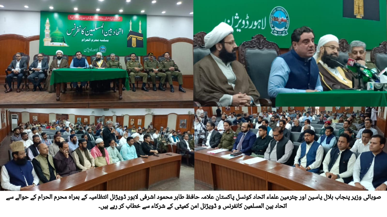 صوبائی وزیر ہاؤسنگ پنجاب بلال یاسین اور چئرمین علماء اتحاد کونسل پاکستان علامہ حافظ طاہر محمود اشرفی کی زیر صدارت محرم الحرام کے حوالے سے اتحاد بین المسلمین کانفرنس کا انعقاد کیا گیا۔ کانفرنس میں کمشنر لاہور زید بن مقصود، سی سی پی او لاہور بلال صدیق کمیانہ، آر پی او شیخوپورہ اطہر اسماعیل، ڈی سی لاہور سید موسی رضا، ڈی آئی جی آپریشنز ڈاکٹر فیصل کامران، سی ٹی او لاہور ڈاکٹر اطہر وحید اور لاہور سمیت پوری لاہور ڈویژن اضلاع کے جید علماء اکرام، آئمہ عظام، امن کمیٹیوں کے اراکین اور ضلعی انتظامیہ کی افسران نے شرکت کی۔صوبائی وزیر ہاؤسنگ پنجاب بلال یاسین نے کانفرنس کے شرکاء سے خطاب کرتے ہوئے کہا ہے کہ محرم کے تقدس کے احترام اور بین المسالک ہم آہنگی فروغ کیلئے علماء و آئمہ کا کردار روز روشن کیطرح نمایاں ہے، ہمیں یکجہتی کی سوچ سے آگے بڑھنا ہے، انہوں نے کہا کہ افواہوں پر کان نہ دھریں، کسی بھی خبر کی ضلعی انتظامیہ کے ساتھ فوری تصدیق کریں، لاہور ڈویژن انتظامیہ نے محرم الحرام کیلئے بہترین انتظامات کیے ہیں اور بہترین ٹیم کام کررہی ہے۔چیئرمین علماء اتحاد کونسل پاکستان علامہ حافظ طاہر محمود اشرفی نے اپنے خطاب میں کہا کہ پاکستان دنیائے اسلام کی واحد ایٹمی طاقت ہے، پاکستان میں اتحاد و یکجہتی کی فضاء ہر سطح پر موجود ہے، انہوں نے کہا کہ بطور مسلمان اور پاکستانی ہمیں اپنی صفوں میں اتحاد پیدا کرکے اسلام کی طاقت بننا ہے۔کمشنر لاہور ڈویژن زید بن مقصود نے کانفرنس کے شرکاء سے مخاطب ہو کر امن و یکجہتی کا پیغام دیتے ہوئے کہا ہے کہ تمام مکاتب کے علماء کرام کا جذبہ امن لائق تحسین ہے، قیام ِ امن اور مذہبی رواداری کا فروغ ہماری مشترکہ ذمہ داری ہے۔ کمشنر لاہور نے کہا کہ محراب ومنبر سے دیا جانے والا باہمی احترام کا پیغام ہی انتظامیہ کا مقصد ہے، اپنی صفوں میں نفاق سے بچاو کیلئے کسی بھی خبر یا اطلاع کی انتظامیہ سے تصدیق کریں اور افواہوں کی بیخ کنی کریں، انہوں نے کہا ہے جلوسوں کے روٹس و مجالس کے مقامات پر ضلعی انتظامیہ کی طرف سے ہر ممکن سہولیات فراہم کی جائیں گی۔پولیس انتظامیہ کی جانب سے سی۔سی۔پی۔او لاہور بلال صدیق کمیانہ اور آر پی او شیخوپورہ اطہر اسماعیل نے محرم الحرام میں سکیورٹی انتظامات کے حوالے سے کہا کہ محرم الحرام کے دوران جلوسوں اور مجالس کیلئے بھرپور سکیورٹی فراہم کی جائے گی، لاہور پولیس و انتظامیہ محرم الحرام میں قیام ِامن کے لئے پر عزم ہے، سکیورٹی کیلئے تمام پلانز کو حتمی شکل دی جا چکی ہے۔ انہوں نے علماء کرام و آئمہ عظام سے مخاطب ہو کر کہا کہ منبر و محراب سے پیغام دیں کہ محرم الحرام کی حرمت پر کوئی آنچ نہیں آنے دینگے، خاص طور پر ساؤنڈایکٹ، مجالس و جلوسوں کے اوقات کار اور روٹ کی پابندی پر عملدرآمد ہر صورت یقینی بنایا جائے گا، پولیس انتظامیہ مہتممین اور منتظمین محرم مجالس و جلوسوں کیلئے رابطہ میں ہے۔علما کرام و آئمہ عظام اور امن کمیٹیوں کے اراکین نے محرم الحرام کے پر امن انعقاد کیلئے بھر پور تعاون کی یقین دہانی کرائی، انہوں نے کہا کہ علماء و آئمہ اتحاد بین المسلمیں کے علمبردار ہیں کسی فتنہ کو سر نہیں اٹھانے دیں گے۔