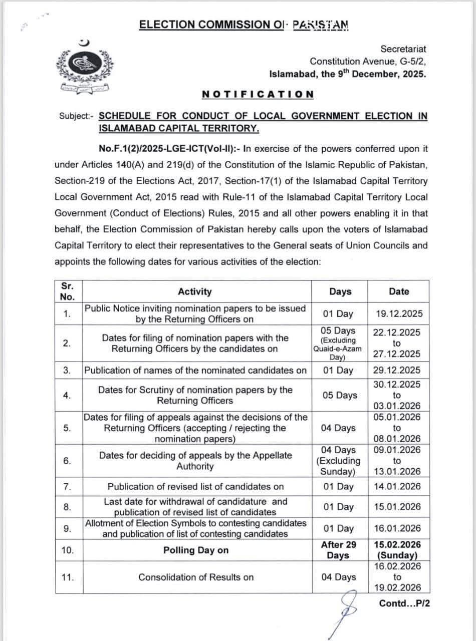 الیکشن کمیشن نے بلدیہ عظمٰی اسلام آباد کے بلدیاتی انتخابات لوکل گورنمنٹ ایکٹ 2015 کے تحت کروانے کا فیصلہ کیا ہے۔الیکشن کمیشن کے مطابق اسلام آباد میں بلدیاتی انتخابات 15 فروری کو ہوں گے۔ پولنگ کا عمل صبح 8 بجے سے شام 4 بجے تک جاری رہے گا۔الیکشن کمیشن کے ترجمان کے مطابق ریٹرننگ افسرز کاغذات نامزدگی کے لیے پبلک نوٹس 19 دسمبر کو آویزاں کریں گے۔انتخابی شیڈول کے مطابق کاغذات نامزدگی 22 دسمبر سے 27 دسمبر تک جمع کرائے جائیں گے، کاغذات نامزدگی کی جانچ پڑتال 30 دسمبر سے 3 جنوری 2026 تک ہوگی۔الیکشن کمیشن کے مطابق ٹربیونلز اپیلیں 5 سے 8 جنوری 2026 تک دائر کی جاسکیں گی جبکہ اپیلیں 9 سے 13 جنوری تک نمٹا دی جائیں گی۔