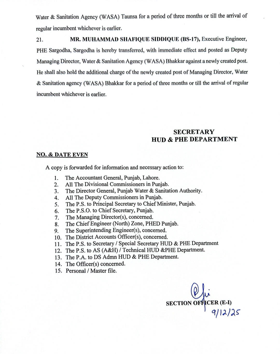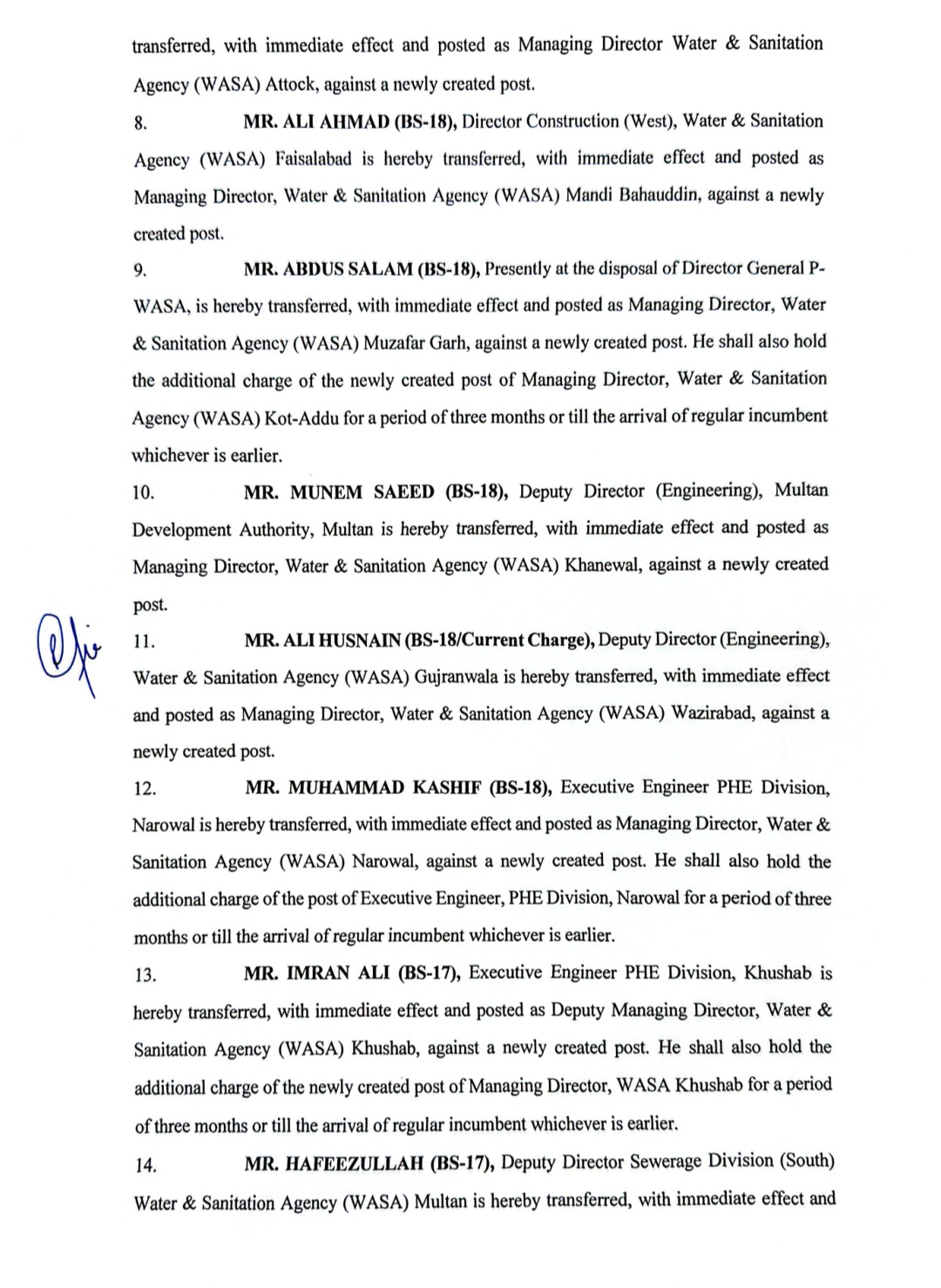 حماد فضل کا محکمہ لوکل گورنمنٹ سے تبادلہ کر کے ایم ڈی واسا اٹک تعینات کیا گیا ہے۔علی احمد، ڈائریکٹر کنسٹرکشن فیصل آباد کا تبادلہ، ایم ڈی واسا منڈی بہاؤالدین کر دیا گیا ہے۔عبدالسلام کو ایم ڈی واسا مظفر گڑھ تعینات کر کے کوٹ ادو کا اضافی چارج دیا گیا ہے۔منیم سعید، ڈپٹی ڈائریکٹر این ڈی اے کا تبادلہ ایم ڈی واسا خانیوال کر دیا گیا ہے۔علی حسنین ڈپٹی ڈائریکٹر واسا گوجرانوالہ کو ایم ڈی واسا وزیر آباد تعینات کیا گیا ہے۔محمد کاشف ایکسیئن پبلک ہیلتھ نارووال کو ایم ڈی واسا نارووال تعینات کیا گیا ہے۔عمران علی ایکسیئن خوشاب کو ڈپٹی ایم ڈی واسا خوشاب تعینات کیا گیا ہے۔تین ماہ کے لیے ایم ڈی خوشاب کا اضافی چارج تفویض بھی کیا گیا ہے۔حفیظ اللہ ڈپٹی ڈائریکٹر واسا ملتان کوڈپٹی ایم ڈی واسا مظفر گڑھ تعینات کر دیا گیا ہے۔سلمان شجاع ایکسیئن ٹوبہ ٹیک سنگھ کو ڈی ایم ڈی واسا ٹوبہ ٹیک سنگھ تعینات کیا گیا ہے اور ایم ڈی واسا ٹوبہ ٹیک سنگھ کا اضافی چارج تفویض کیا گیا ہے ایم ڈی واسا جھنگ کو ایم ڈی واسا چنیوٹ کا اضافی چارج تفویض کر دیا گیا ہے۔محمد عارف ایکسیئن راجن پور کو ڈپٹی ایم ڈی واسا راجن پور تعینات کردیا گیا ہے ساتھ ایم ڈی واسا راجن پور کا اضافی چارج تفویض کیا گیا ہے۔عاصم عباس ایکسیئن وہاڑی کو ڈپٹی ایم ڈی واسا وہاڑی تعینات کر کےایم ڈی واسا وہاڑی کا اضافی چارج تفویض کیا گیا ہے۔عامر مسعود ایکسیئن ڈی جی خان کوایم ڈی واسا تونسہ کا اضافی چارج تفویض کیا گیا ہے۔شفیق صدیق ایکسیئن پبلک ہیلتھ سرگودھا کو ڈپٹی ایم ڈی واسا بھکر تعینات کردیا گیا ہے ایم ڈی واسا بھکر کا اضافی چارج بھی تفویض کرنے کے احکامات جاری کئے گئے ہیں۔