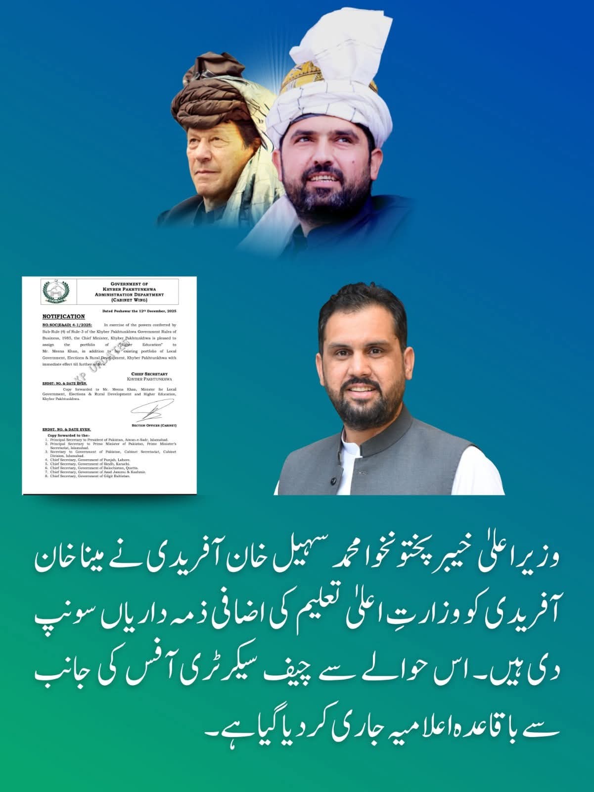 وزیر اعلٰی خیبر پختونخوا محمد سہیل آفریدی نے صوبائی وزیر بلدیات مینا خان آفریدی کو وزارت اعلٰی تعلیم کی ذمہ داریاں بھی سونپ دی ہیں۔چیف سیکرٹری خیبرپختونخوا کی جانب سے باقاعدہ نوٹیفکیشن جاری کردیا گیا ہے۔