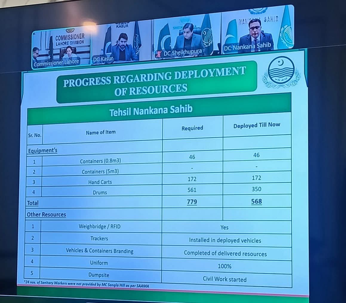 انہوں نے کہا کہ عارضی کلیکشن پوائنٹس واضح کریں، ڈی سلٹنگ آپریشن بھرہور انداز میں مکمل کریں۔ کمشنر لاہور نے کہا کہ صفائی عملہ کی حاضری کو سختی سے چیک کیا جائے، رورل ایریاز میں صفائی شیڈول ہر ایریا میں آویزاں کریں، ضلعی ٹیمز ہدایات پر عملدرآمد کو یقینی بنوائیں۔کمشنرلاہورڈویژن مریم خان کی زیر صدارت صفائی، ستھرا پنجاب، ون ڈش خلاف ورزی کارکردگی کا جائزہ لے حوالے سے ڈویژنل اجلاس منعقد ہوا۔ اجلاس میں لاہور ڈویژن اضلاع کے ڈی سیز، ڈی جی ستھرا پنجاب اتھارٹی و دیگر افسران نے شرکت کی۔ڈی جی ستھرا پنجاب اتھارٹی بابر صاحبدین نے اینٹی لٹرنگ مہم اور انفورسمنٹ پر جامع بریفنگ دی۔ ڈی جی ستھرا پنجاب اتھارٹی نے بریفنگ دیتے ہوئے کہا ہے کہ شہریوں، دکانداروں، صنعتوں کو جامع صفائی آگاہی مہم میں شامل کرکے بھرپور مہم شروع کی جارہی ہے،صفائی انفورسمنٹ کیلئے مختص جگہوں کے علاوہ کوڑا پھینکنے پر باقاعدہ جرمانے بھی ہونگے، غیر اجازت شدہ جگہوں پر لٹرنگ اور کوڑے کو آگ لگانے پر جرمانے و سزائیں بھی ہونگی۔کمشنر لاہور نے ضلعی اور تحصیلی شہروں میں صفائی مشینری و افرادی وسائل دستیابی کا جائزہ لیا۔ انہوں نے کہا کہ وزیراعلی پنجاب کی تمام شہروں میں ”باقاعدہ یکساں صفائی معیار“ ہدایات واضح ہیں، وزیراعلٰی پنجاب کی ترجیح شہریوں کو مکمل خدمات فراہمی ہے۔اجلاس میں ڈی سی لاہور سید موسٰی رضا، ڈی جی ستھرا پنجاب اتھارٹی بابر صاحبدین، ایڈیشنل کمشنر ڈاکٹر محمد اکبر، ڈی سی شیخوپورہ شاہد عمران مارتھ، ڈی سی ننکانہ راو تسلیم اختر، ڈی سی قصور آصف رضا نے شرکت کی۔