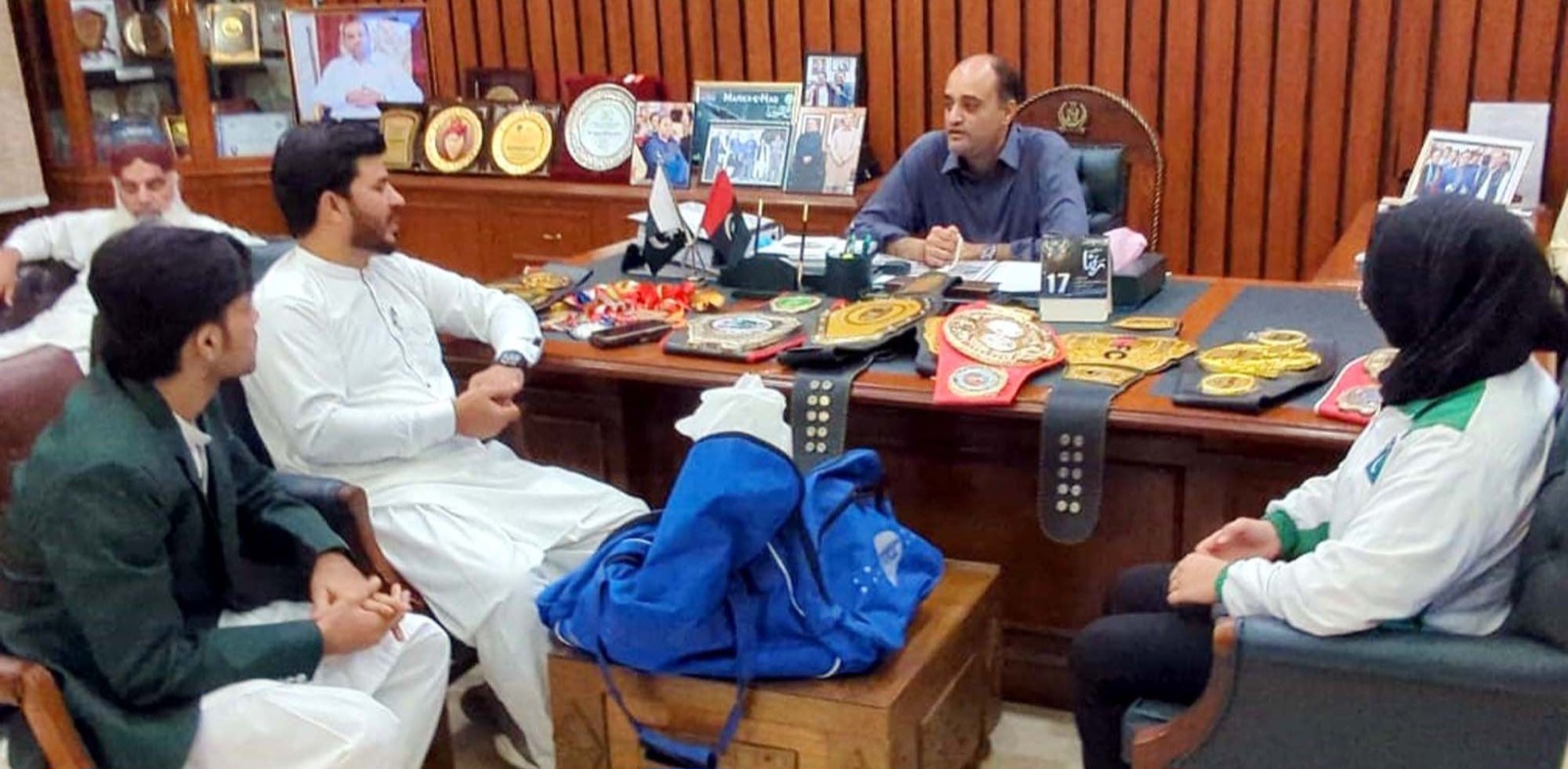 ڈپٹی میئر کراچی سلمان عبداللہ مراد سے پروفیشنل باکسر، ورلڈ اور نیشنل چیمپئن آغا کلیم اور کک باکسنگ فائٹر رابعہ نور نے صدر دفتر بلدیہ عظمیٰ کراچی میں ان کے دفتر میں ملاقات کی، ملاقات میں باکسنگ سمیت شہر میں کھیلوں کے فروغ، نوجوانوں کی حوصلہ افزائی اور سرکاری سرپرستی کے عملی اقدامات پر تفصیلی تبادلہ خیال کیا گیا،ڈپٹی میئر کراچی سلمان عبداللہ مراد نے کہا کہ کھیل نوجوانوں کو مثبت سمت دیتے ہیں اور باصلاحیت کھلاڑی ہمارا قیمتی سرمایہ ہیں،