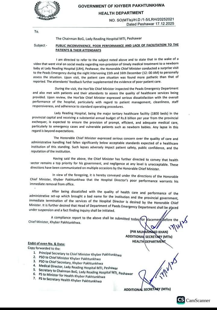 وزیراعلیٰ خیبرپختونخوا محمد سہیل آفریدی کے اچانک دورے کے بعد لیڈی ریڈنگ ہسپتال کے ڈائریکٹر کو ناقص کارکردگی پر فوری طور پر عہدے سے ہٹا دیا گیا ہے۔وزیراعلیٰ کے معائنے کے دوران مریضوں کی دیکھ بھال اور انتظامی امور تشویشناک حد تک کمزور پائے گئے.وزیراعلیٰ کی ہدایت پر پیڈز ایمرجنسی کے سربراہ کو معطل کر کے فیکٹ فائنڈنگ انکوائری شروع کرنے کی بھی ہدایت کی گئی ہے۔نوزائیدہ بچوں اور ایمرجنسی مریضوں کی نگہداشت میں کسی بھی قسم کی غفلت کو ناقابلِ قبول قرار دیا گیا ہے.صوبائی حکومت نے صحت کے شعبے میں ناقص کارکردگی کے خلاف زیرو ٹالرنس پالیسی پر عملدرآمد کا اعادہ کیا ہے.