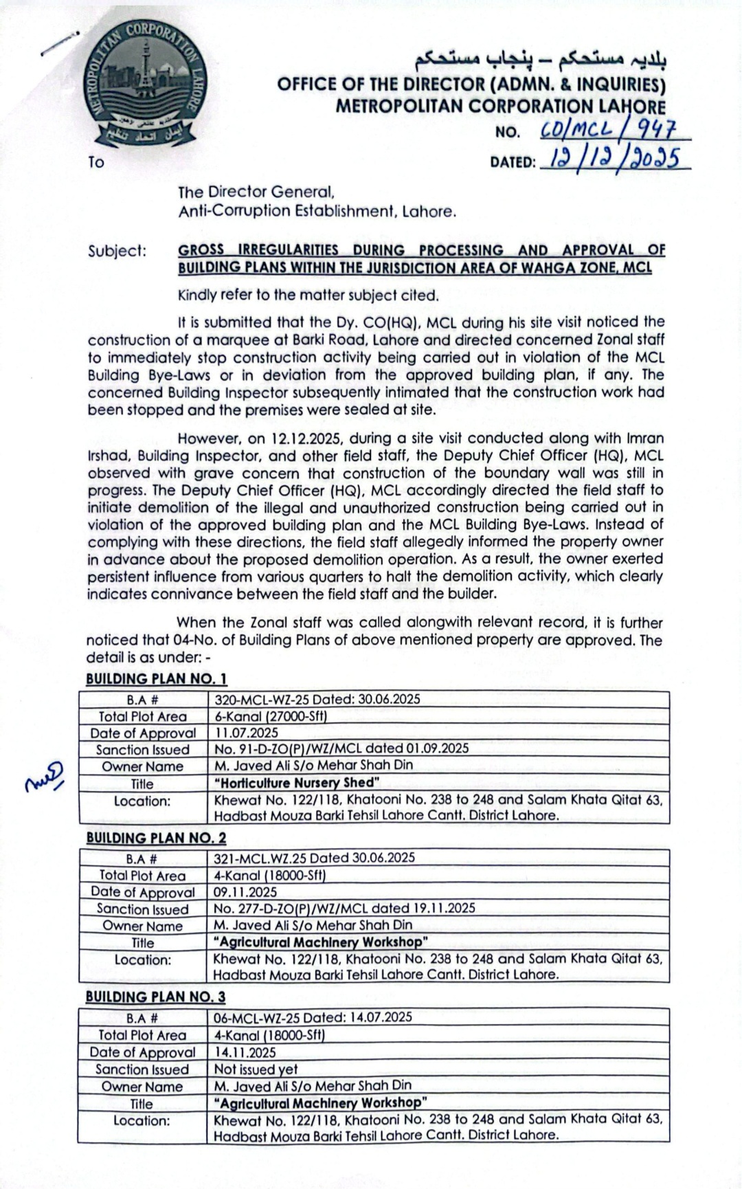 بلدیہ عظمٰی لاہور کے ڈائریکٹر ایڈمن اینڈ انکوائریز کی انکوائری رپورٹ پر محکمہ اینٹی کرپشن نے واہگہ زون کے سابق بلڈنگ انسپکٹر سمیت چار ملازمین کی گرفتاری کے بعد تحقیقات کا دائرہ وسیع کر دیا ہے۔تحقیقاتی رپورٹ میں غیر قانونی تعمیرات، جعل سازی اختیارات کا غلط استعمال،زرعی رقبہ پر کمرشل تعمیرات سمیت مختلف محکمانہ بے ضابطگیوں کی نشاندہی کی گئی ہے