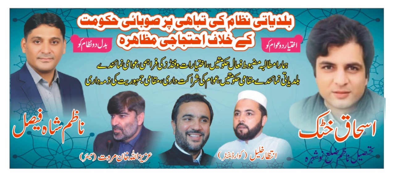 خیبرپختونخوا میں مقامی حکومتوں کے نمائندے 19 دسمبر کو یوم احتجاج کے طور پر منائیں گے کیونکہ خیبرپختونخوا میں پہلے مرحلے کہ انتخابات 19 دسمبر 2021 کو منقعد ہوئے تھے۔انتخابات سے لیکر اج تک خیبر پختونخوا میں بلدیاتی نمایندے اختیارات و ترقیاتی فنڈز سے محروم ہیں۔ 19 دسمبر کو خیبرپختونخوا میں تحصلوں کونسلوں کے اجلاس منقعد ہونگے