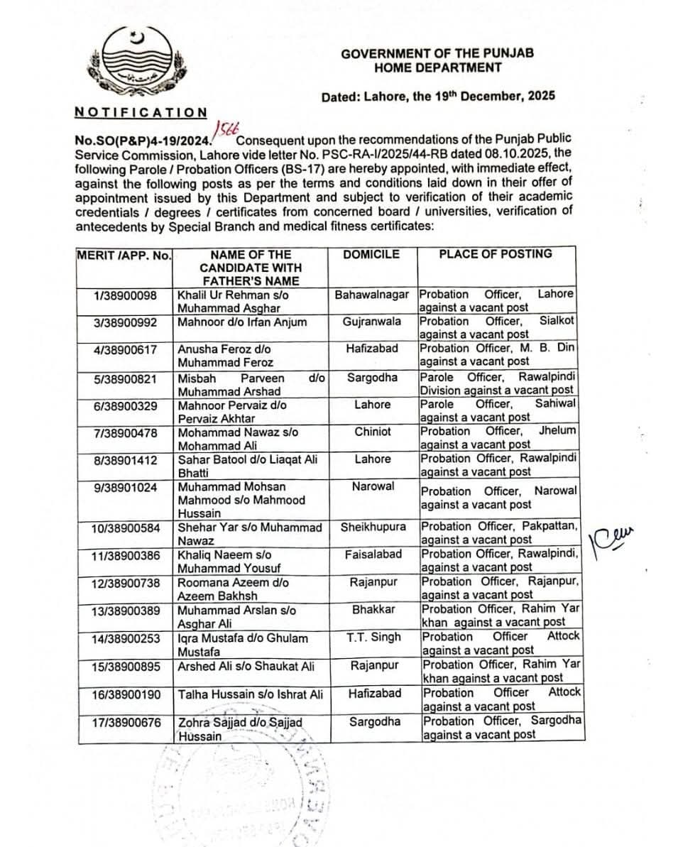 21 پروبیشن اینڈ پیرول افسران کی تعیناتی پنجاب پبلک سروس کمیشن کے ذریعے عمل میں لائی گئی ہے۔پروبیشن افسران حادثاتی مجرمان کی اصلاح کیلئے خدمات سرانجام دیں گے۔پیرول افسران پیرول پر رہا ہونے والے مجرمان کی اصلاح اور دیکھ بھال پر مامور ہوں گے۔محکمہ داخلہ پنجاب کے نوٹیفکیشن کے مطابق خلیل الرحمٰن کو پروبیشن آفیسر لاہور تعینات کر دیا گیا ہے۔ماہنور دختر عرفان بطور پروبیشن آفیسر سیالکوٹ تعینات کیا گیا ہے۔انوشہ فیروز پروبیشن آفیسر منڈی بہاؤالدین،مصباح پروین پیرول آفیسر راولپنڈی ڈویژن،ماہنور پرویز پیرول آفیسر ساہیوال،محمد نواز کو پروبیشن آفیسر جہلم تعینات کیا گیا ہے۔سحر بتول پروبیشن آفیسر راولپنڈی تعینات کردیا گیا ہے۔محمد محسن محمود پروبیشن آفیسر نارووال تعینات کیا گیا ہے۔