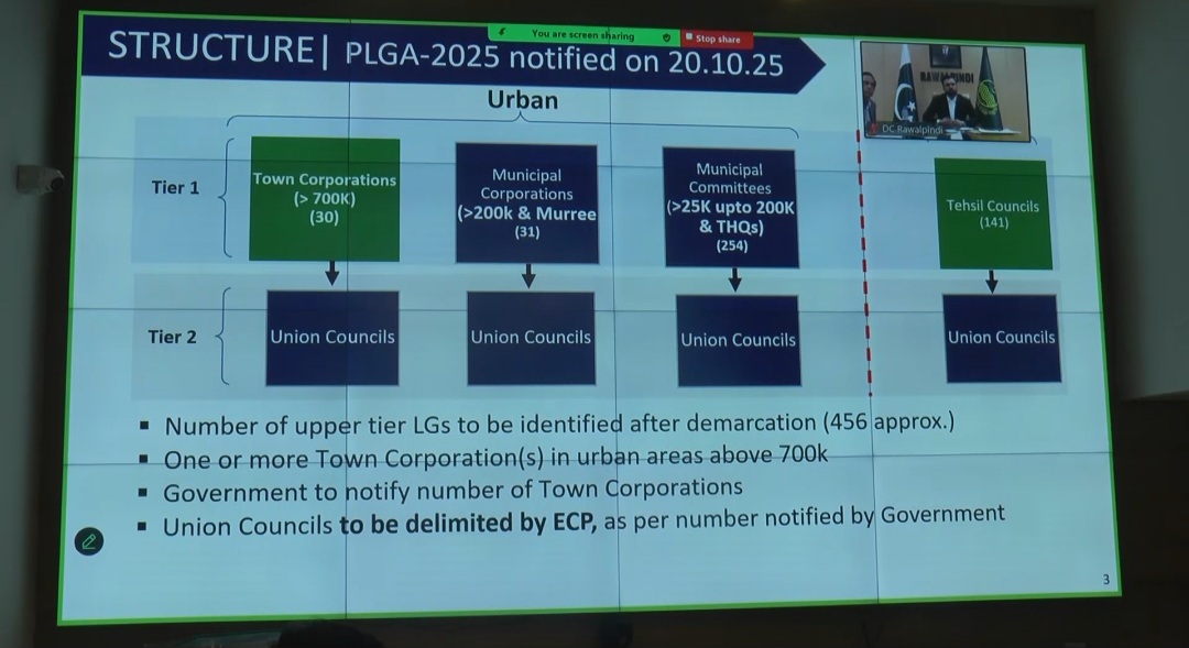انہوں نے کہا کہ مری کو خصوصی طور پر میونسپل کارپوریشن کا درجہ دیا جا رہا ہے۔ انہوں نے ہدایت کی کہ ڈپٹی کمشنرز ڈیمارکیشن کے بعد میونسپل اداروں کے نام تجویز کریں اور تمام عمل مقررہ وقت کے اندر مکمل ہونا چاہیئے۔ ڈیمارکیشن کے بعد الیکشن کمیشن حلقہ بندیوں (ڈی لمیٹیشن) کا کام کرے گا۔ الیکشن کمیشن کی طرف سے جاری ہدایات پر عملدرآمد یقینی بنایا جا رہا ہے۔اس موقع پر سیکرٹری لوکل گورنمنٹ شکیل احمد میاں نے کہا کہ ڈیمارکیشن آفیسر ہر میونسپل ادارے کی حدود کا بھی تعین کریں گے۔ انہوں نے ہدایت کی کہ کابینہ سے منظور شدہ رُولز کے مطابق تمام امور انجام دیے جائیں۔