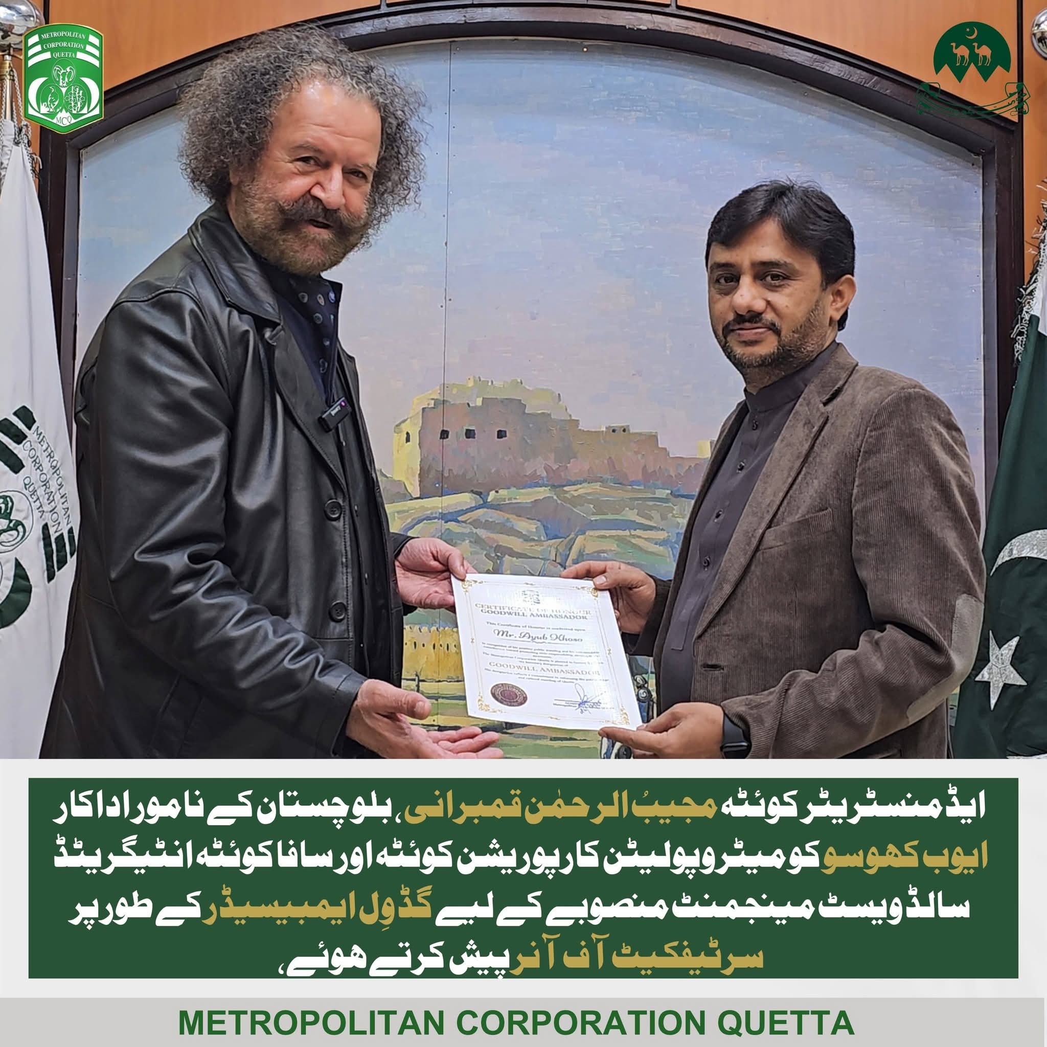 میٹروپولیٹن کارپوریشن کوئٹہ نے بلوچستان کے معروف اداکار ایوب کھوسو Ayub Khoso کو میٹروپولیٹن کارپوریشن کوئٹہ اور سافا کوئٹہ انٹیگریٹڈ سالڈ ویسٹ مینجمنٹ منصوبے کے لیے گڈ وِل ایمبیسیڈر نامزد کر دیا ہے۔یہ نامزدگی ان کی مثبت عوامی ساکھ اور شہری ذمہ داری، ماحولیاتی آگاہی اور عوامی شمولیت کے فروغ میں مؤثر کردار کے اعتراف کے طور پر کی گئی ہے۔