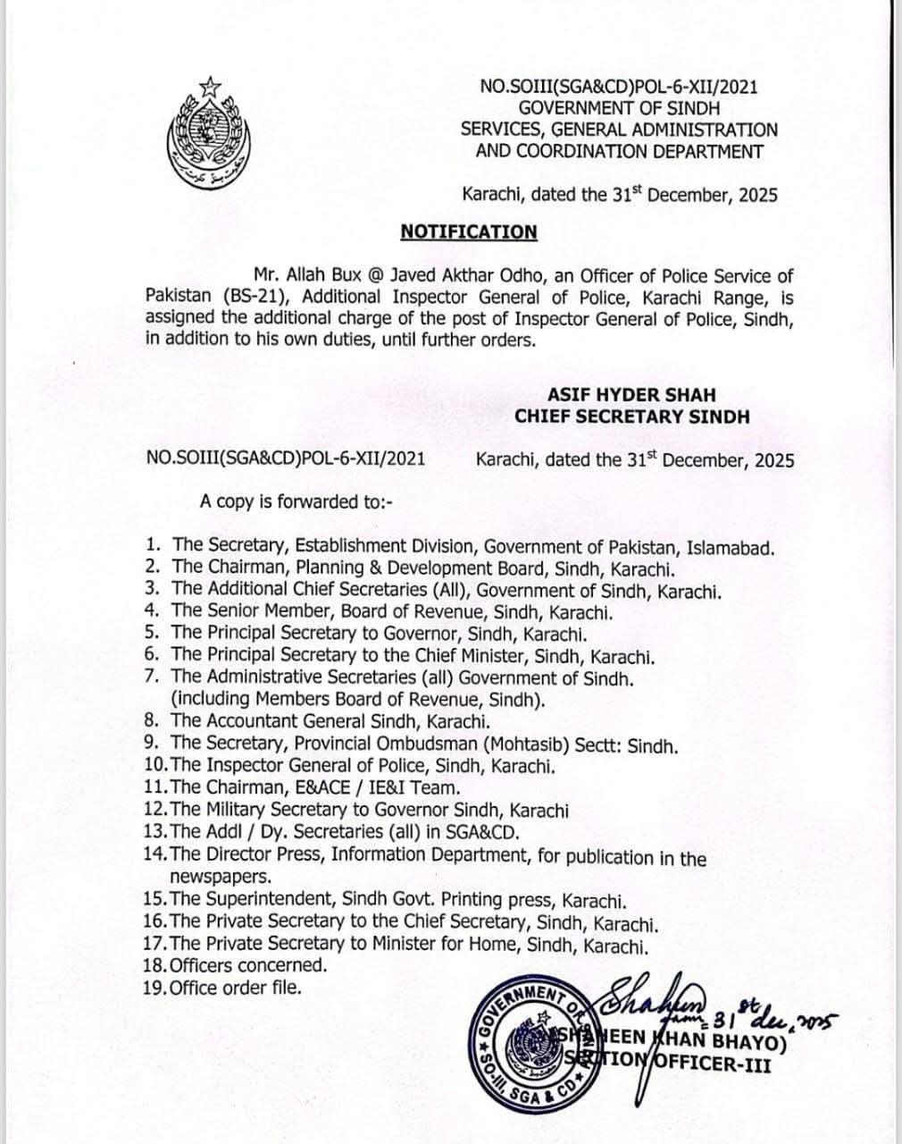 ایڈیشنل آئی جی کراچی جاوید عالم اوڈھو کو انسپکٹر جنرل (آئی جی) سندھ کے عہدے کا اضافی چارج دے دیا گیا ہے۔ اس حوالے سے جاری نوٹیفکیشن کے مطابق آئی جی سندھ غلام نبی میمن مدت ملازمت مکمل ہونے پر ریٹائرڈ ہو گئے، کراچی پولیس چیف جاوید عالم اوڈھو کو قائم مقام آئی جی سندھ تعینات کردیا گیا ہے۔