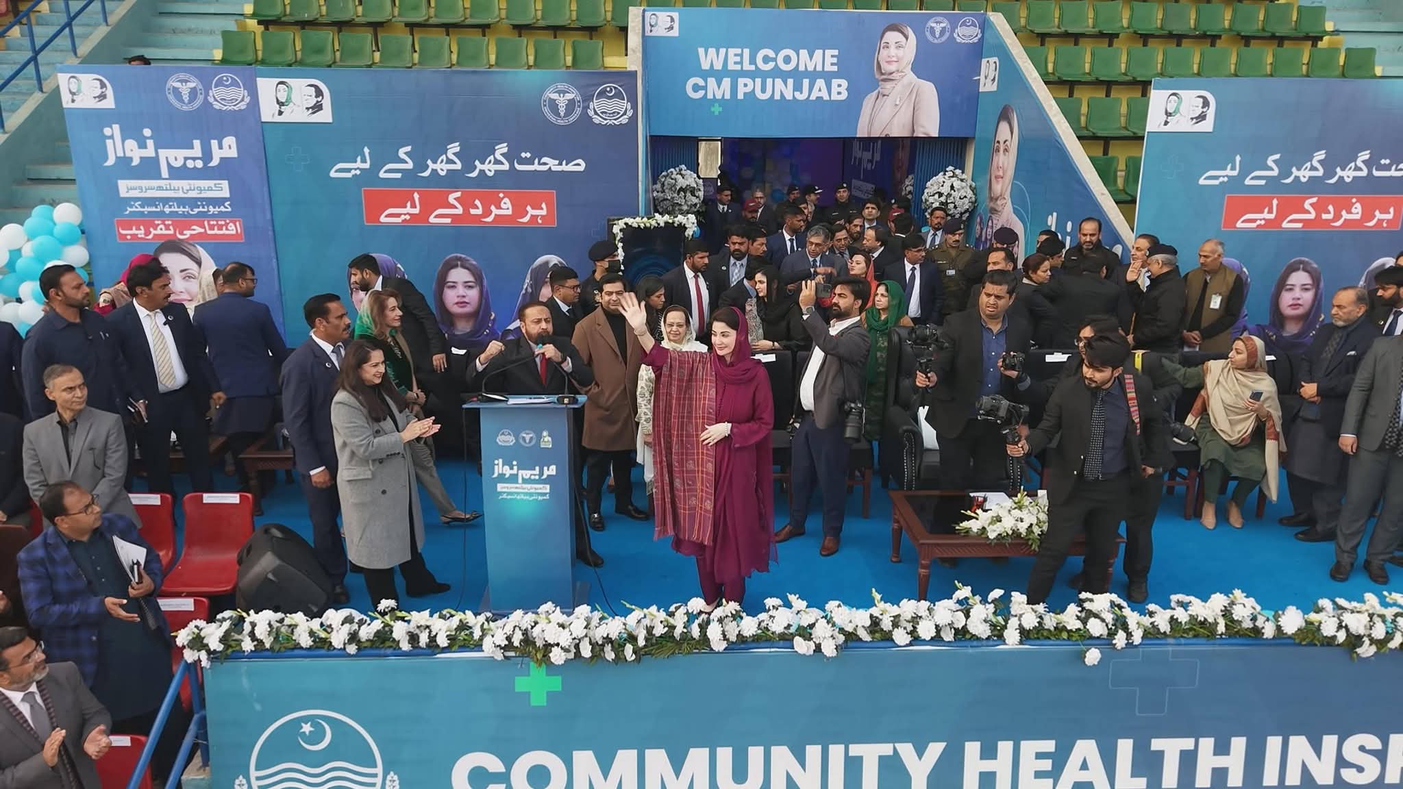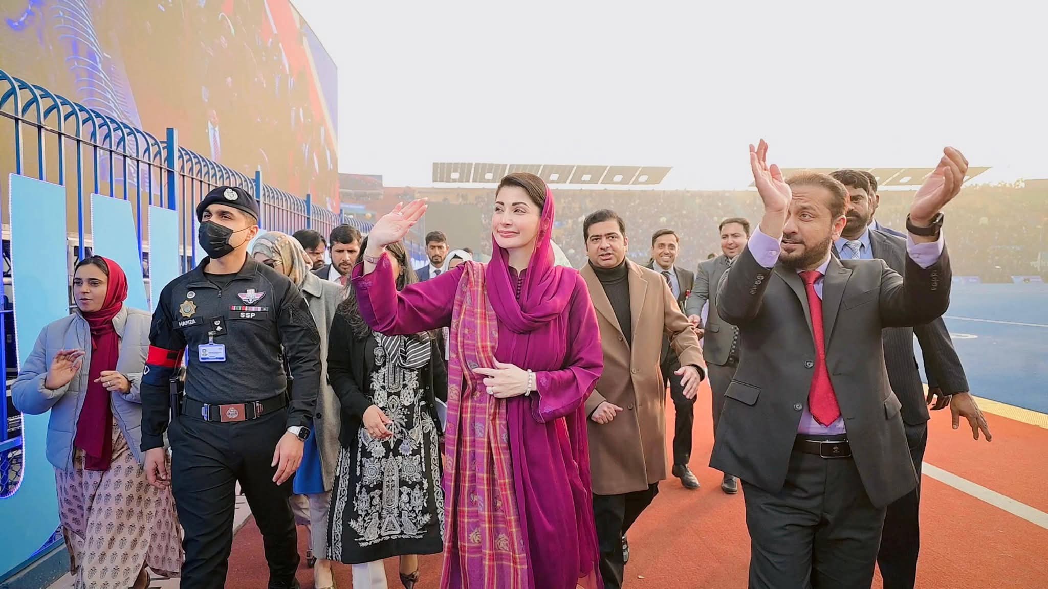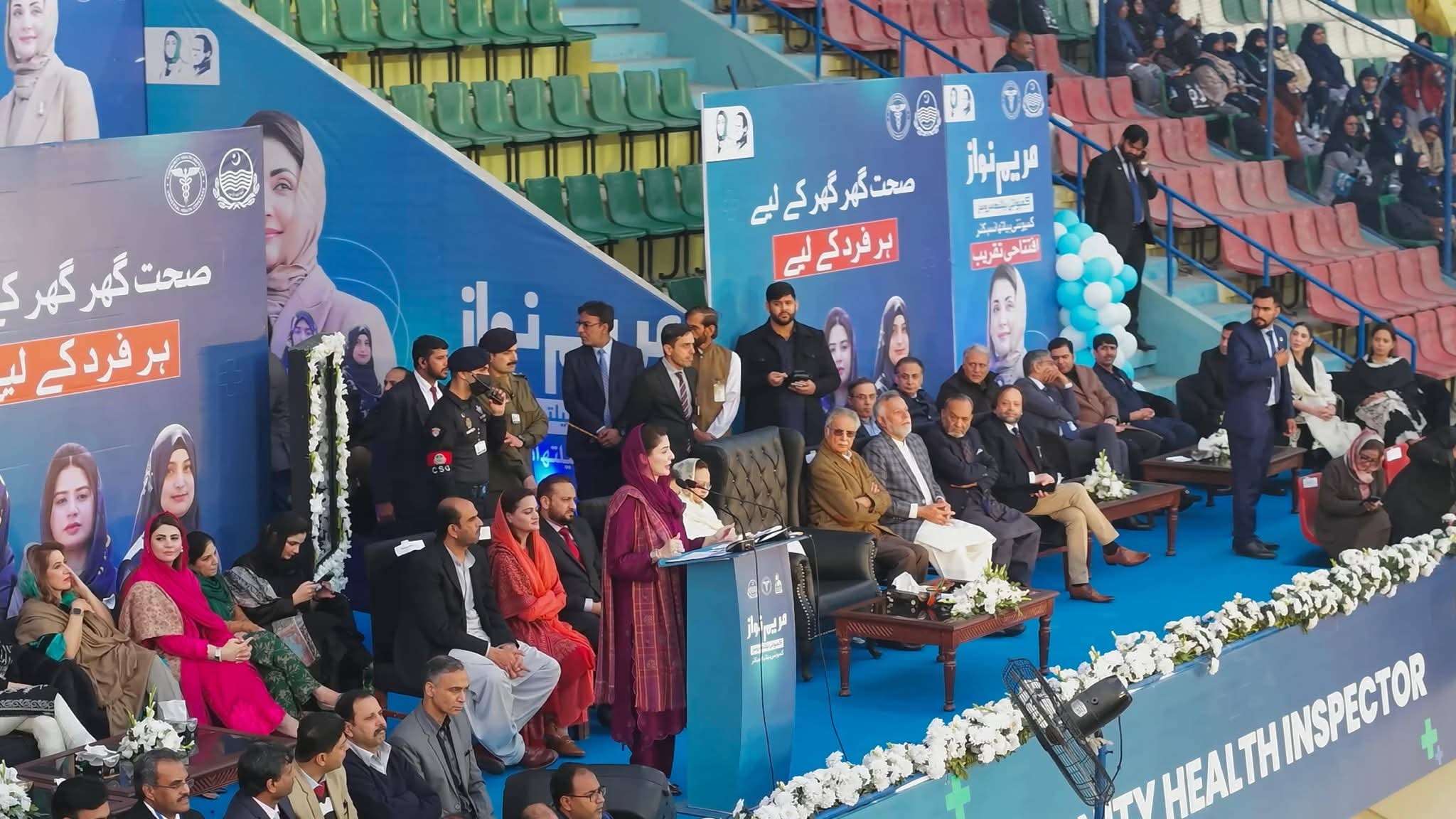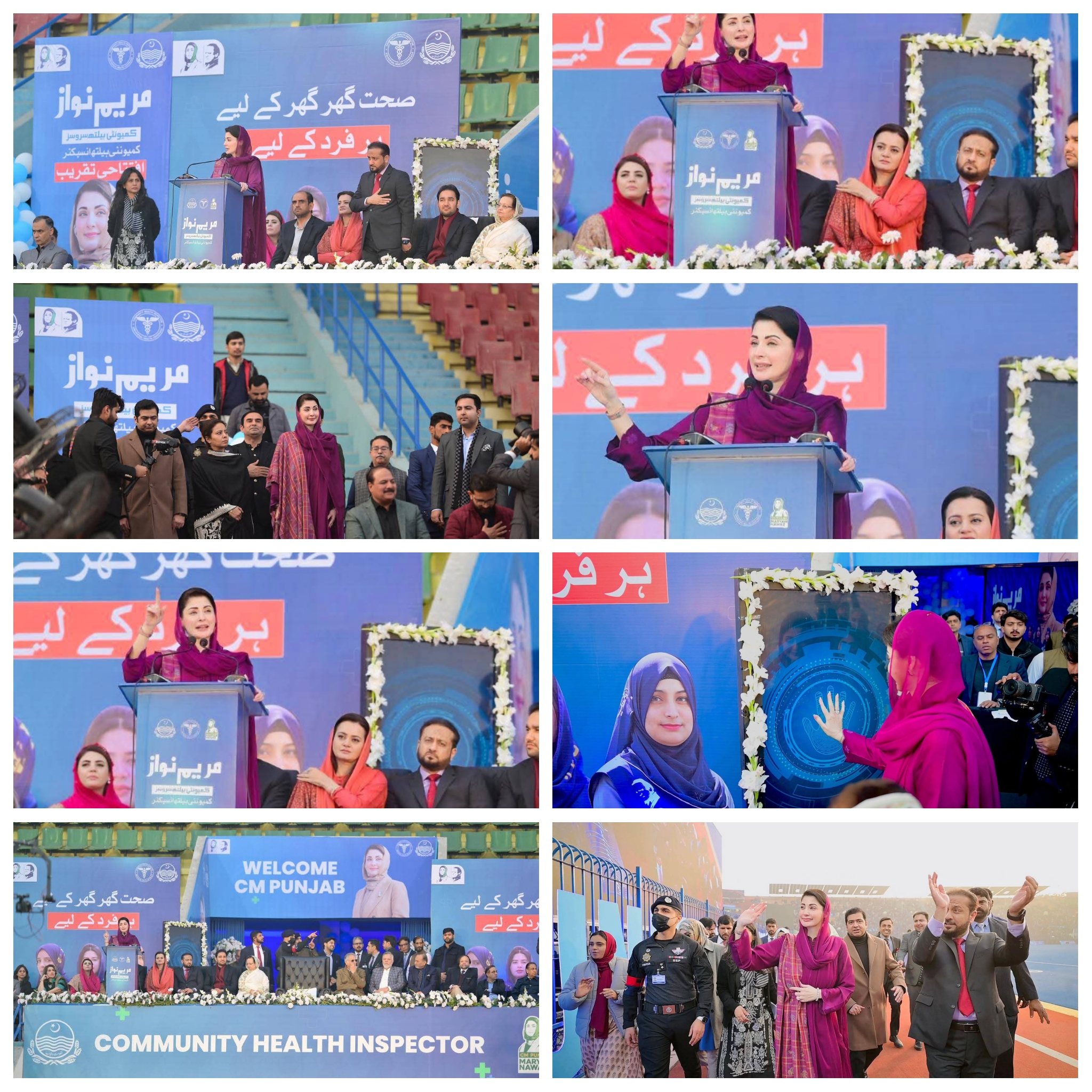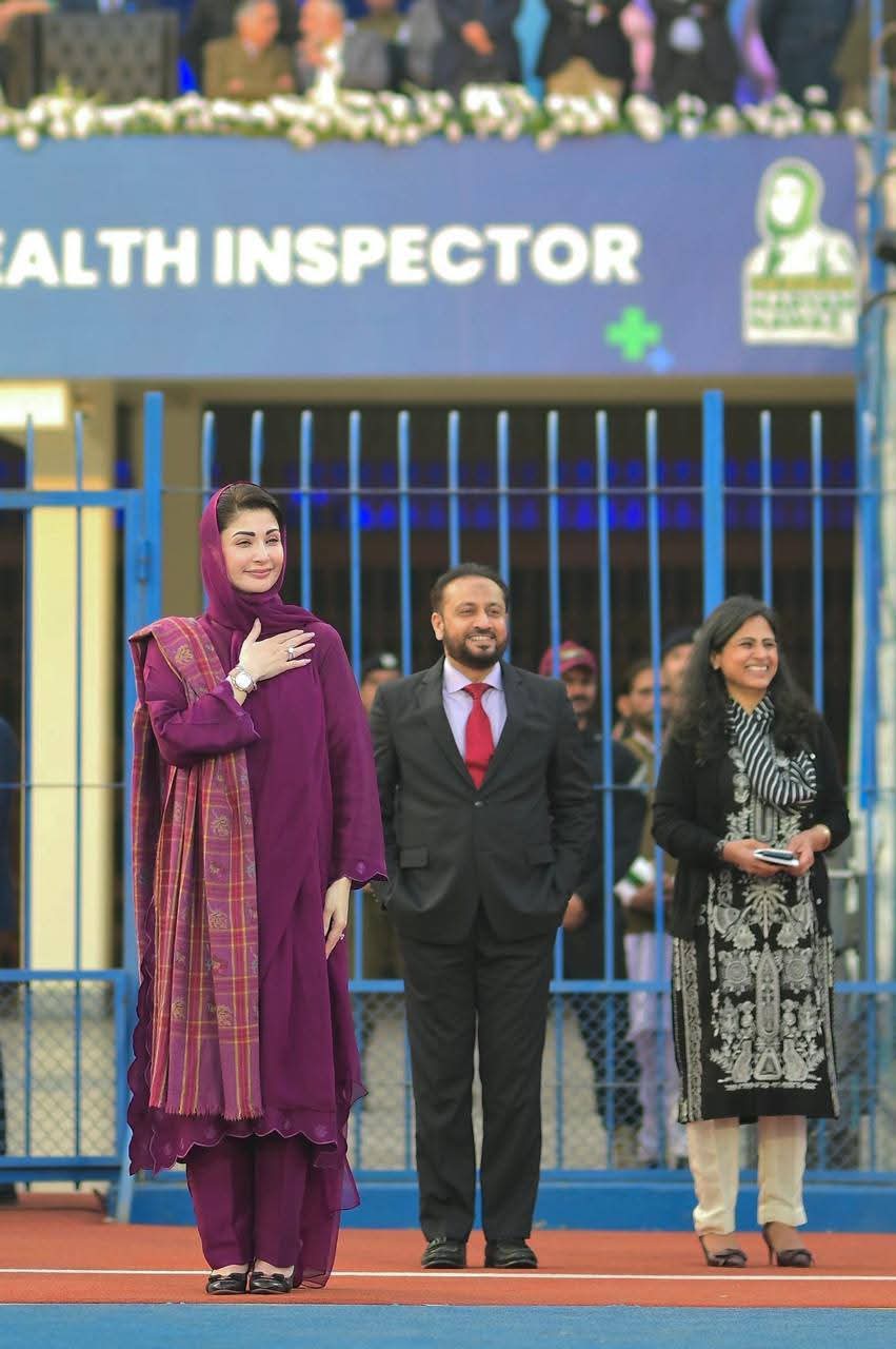 پنجاب ہاکی سٹیڈیم میں صوبے بھر سے 55ہزار کمیونٹی ہیلتھ انسپکٹرز کی تقریب میں شرکت کی۔ وزیراعلیٰ مریم نوازشریف کی پنجاب ہاکی سٹیڈیم آمد پر کمیونٹی ہیلتھ انسپکٹر زنے جوش وخروش نعرے لگائے جس پر وزیراعلیٰ مریم نوازشریف نے کمیونٹی ہیلتھ انسپکٹرز کے نعروں کا ہاتھ ہلا کر جواب دیا۔ وزیراعلیٰ مریم نوازشریف نے کمیونٹی ہیلتھ انسپکٹر ز پراجیکٹ کا ڈیجیٹل افتتاح کیا۔ وزیراعلیٰ مریم نوازشریف حوصلہ افزائی کیلئے ہاکی سٹیڈیم کے ٹریک پر ہر انکلیوژرکے سامنے گئیں۔ وزیراعلیٰ مریم نوازشریف نے ہاکی سٹیڈیم کے ٹریک پر طویل چکرلگاکرہرضلع سے آنے والی کمیونٹی ہیلتھ انسپکٹرزکا خیر مقدم کیا۔ وزیراعلیٰ مریم نوازشریف نے قائد محمد نوازشریف کا پورٹریٹ تھامے بچی کی خودموبائل فون سے تصویر بنائی۔ تقریب میں دھنیں بکھرتے بینڈ کے پیچھے کمیونٹی ہیلتھ انسپکٹرز کے دستے نے مارچ پاس کیا۔