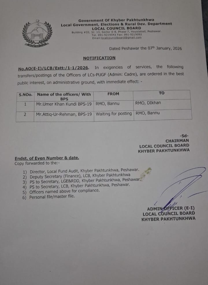 محکمہ بلدیات خیبرپختونخوا،عمر خان کنڈی آر ایم او ڈی آئی خان،عتیق الرحمان آر ایم او بنوں تعینات