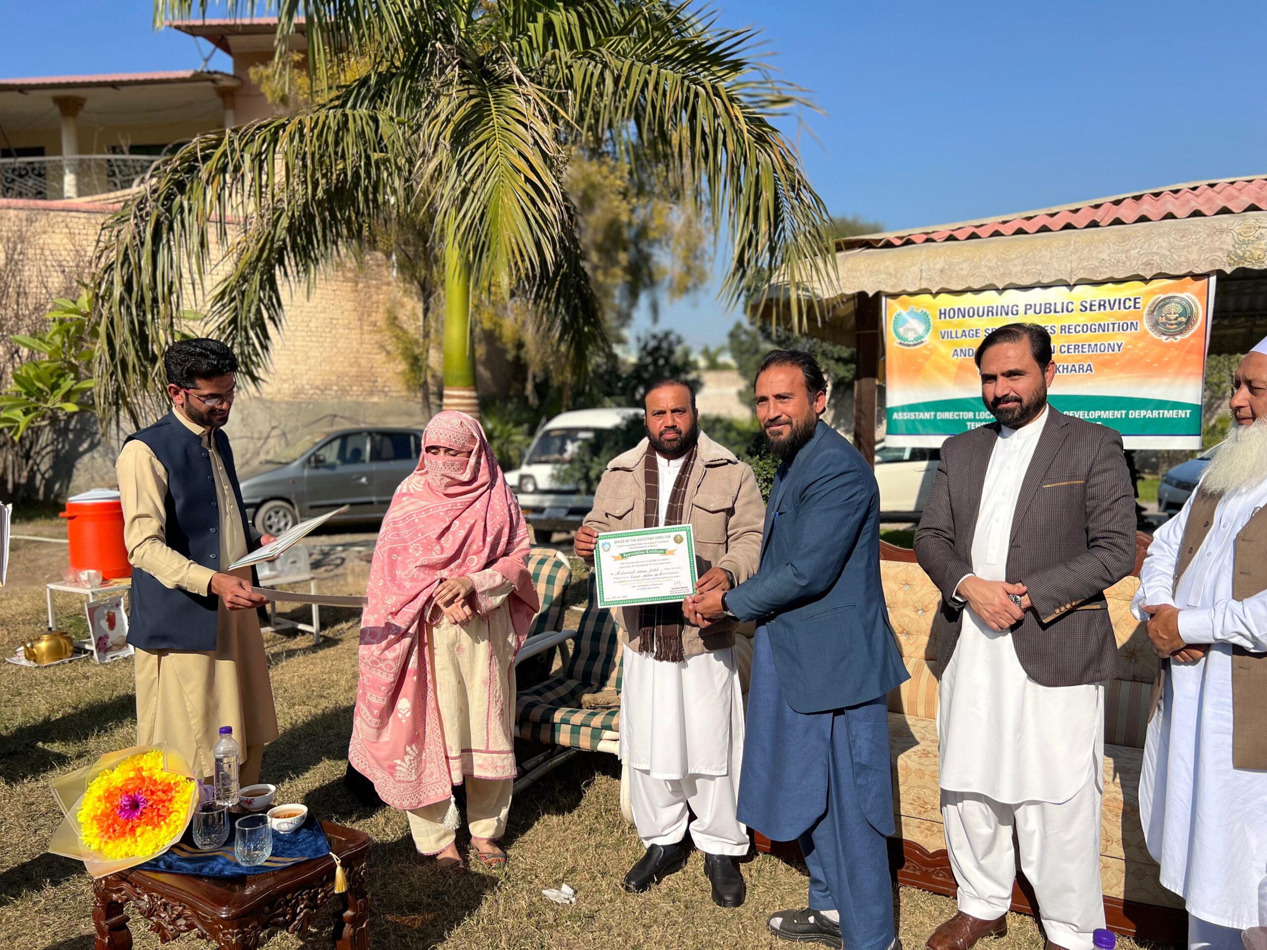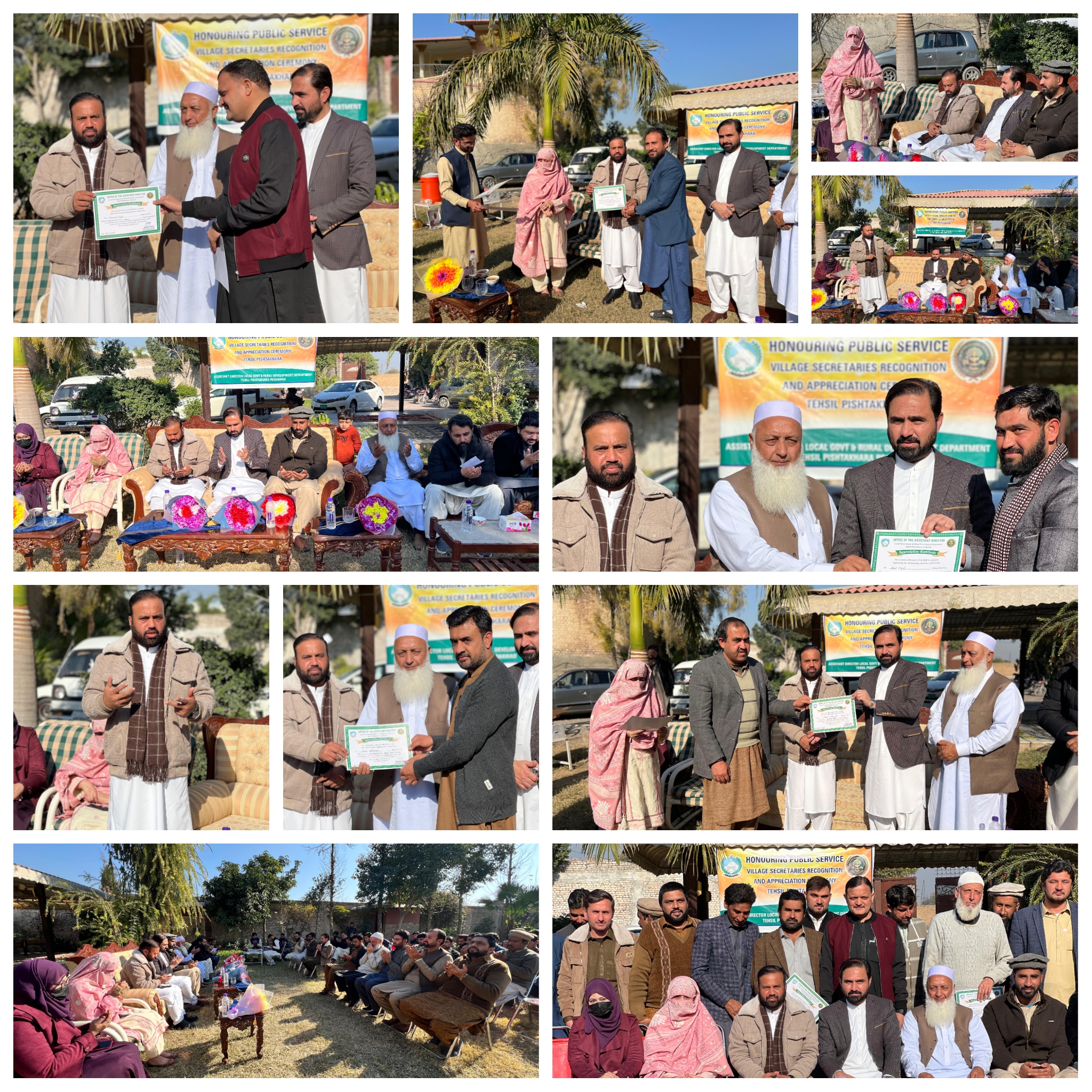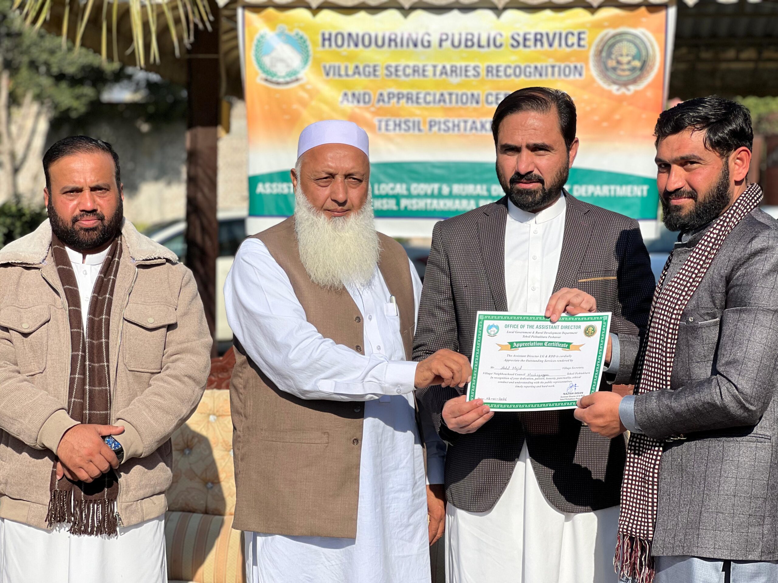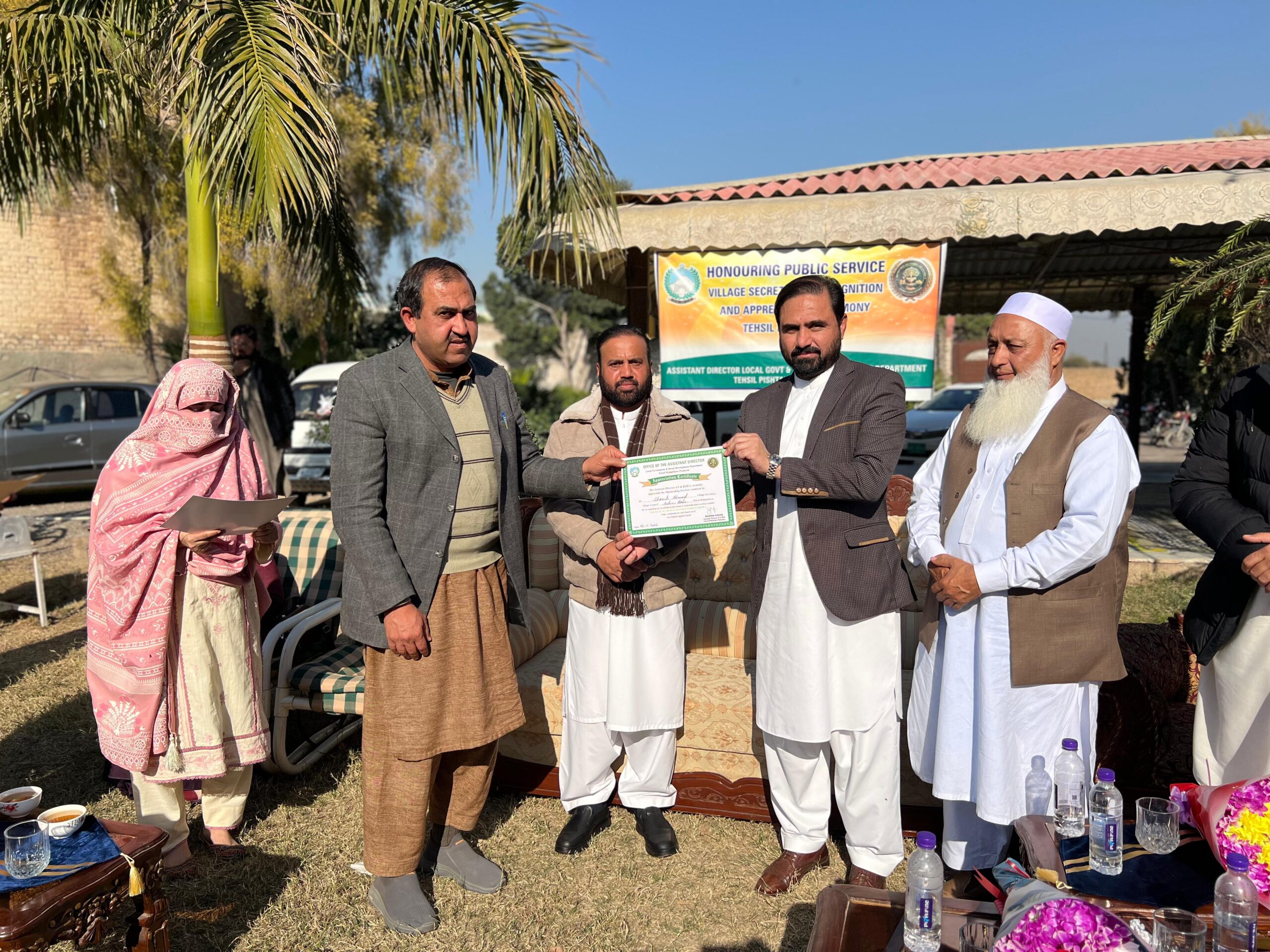محکمہ بلدیات و دیہی ترقی تحصیل پشتخرا کے زیرِاہتمام محکمہ بلدیات کے ملازمین میں سراہتی اسناد کی تقسیم کے حوالے سے ایک سادہ مگر پروقار تقریب منعقد کی گئی۔ تقریب کی صدارت اسسٹنٹ ڈائریکٹر بلدیات تحصیل پشتخرا نازیش احسان نے کی، جبکہ تقریب کے انعقاد میں پراگریس افسر فضلِ خدا، فوکل پرسن ملک فضل الرحمن اور تحصیل کے تمام سیکرٹریز نے کلیدی کردار ادا کیا۔تقریب میں خصوصی مہمان کے طور پر اسسٹنٹ ڈائریکٹر بلدیات و دیہی ترقی تحصیل حسن خیل ملک ارشد خان، اسسٹنٹ ڈائریکٹر تحصیل چمکنی شاہ سعید خان، سب انجینئر کاشف خان، کمپیوٹر آپریٹر وسیم، اکاؤنٹنٹ رمشاء، کفایت اللہ اور دیگر افسران و ملازمین نے شرکت کی۔