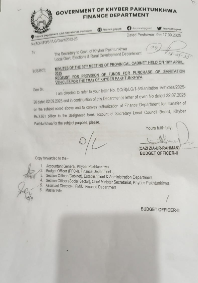 صفائی کے لیے مشینری، لوڈرز کی خریداری کے لیے خیبر پختون خوا کے اسسٹنٹ ڈائریکٹرز کو فنڈز جاری کردیے گئے ہیں لیکن اپریل 2025میں صوبائی کابینہ کے منعقدہ تیسویں اجلاس میں ٹی ایم ایز کے لیے صفائی اور شہروں اور دیہاتوں میں گندگی کو ڈمپ کرنے کے لیے مشینری اور گاڑیوں کی خریداری کے لیے منظوری دیے گئے اور بعدازاں صوبائی کابینہ کی منظوری کے بعد فنانس ڈیپارٹمنٹ خیبر پختون خوا نے بھی فنڈز کی منظوری کی کارروائی کرنے کے بعدفنڈز کے چیک اے جی آفس کی مبینہ ہٹ دھرمی کی وجہ سے جاری نہیں کیے جارہے. عوامی سماجی حلقوں نے اے جی آفس خیبر پختون خوا کی ٹی ایم ایز کے ساتھ زیادتی پر تشویش کا اظہار کرتے ہوئے وزیر اعلٰی سہیل خان آفریدی، وزیر بلدیات مینا خان آفریدی اور چیف سیکرٹری سید شہاب علی شاہ سے مذکورہ فنڈز فوری جاری کرانے کا مطالبہ کیا ہے