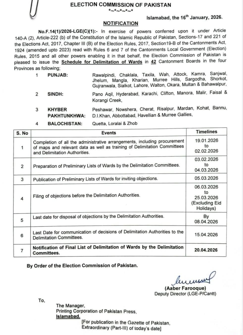 *الیکشن کمیشن آف پاکستان نے42 کنٹونمنٹ بورڈز کے بلدیاتی وارڈز کی نئی حدبندی کا شیڈول جاری کر دیا*
