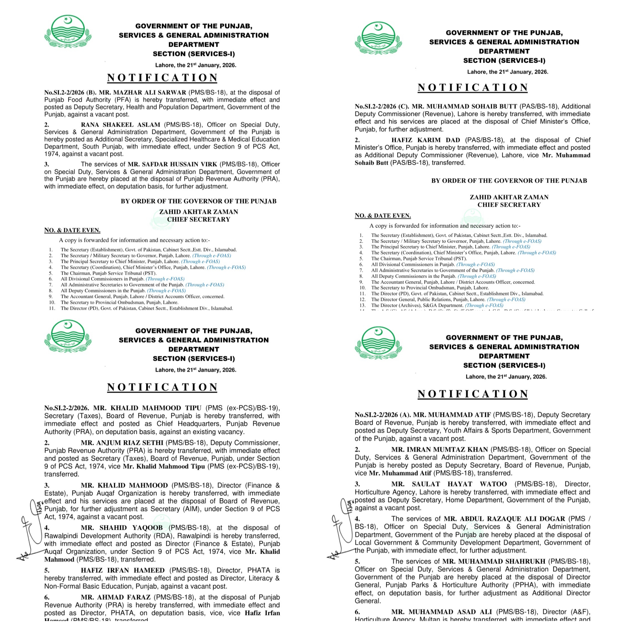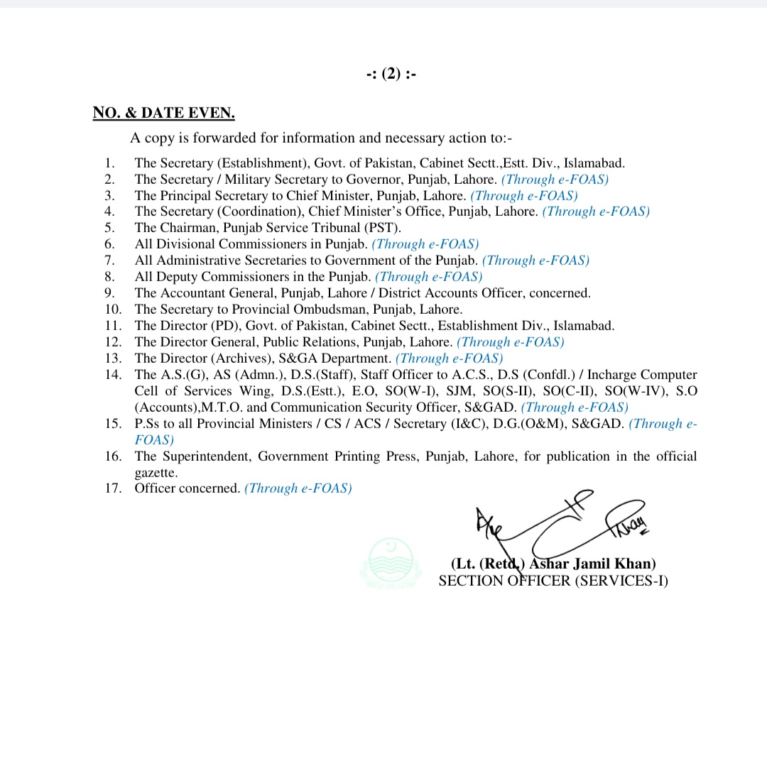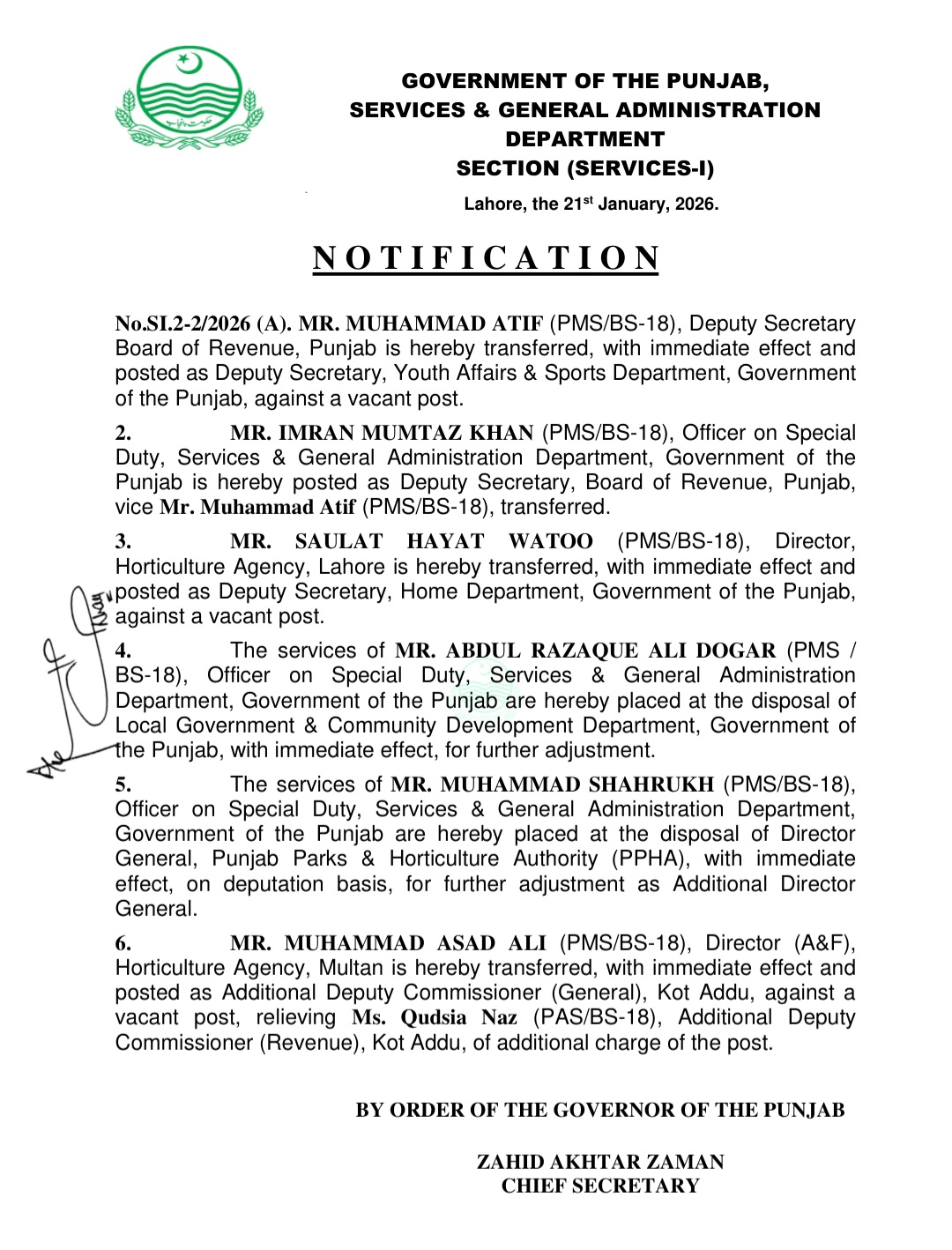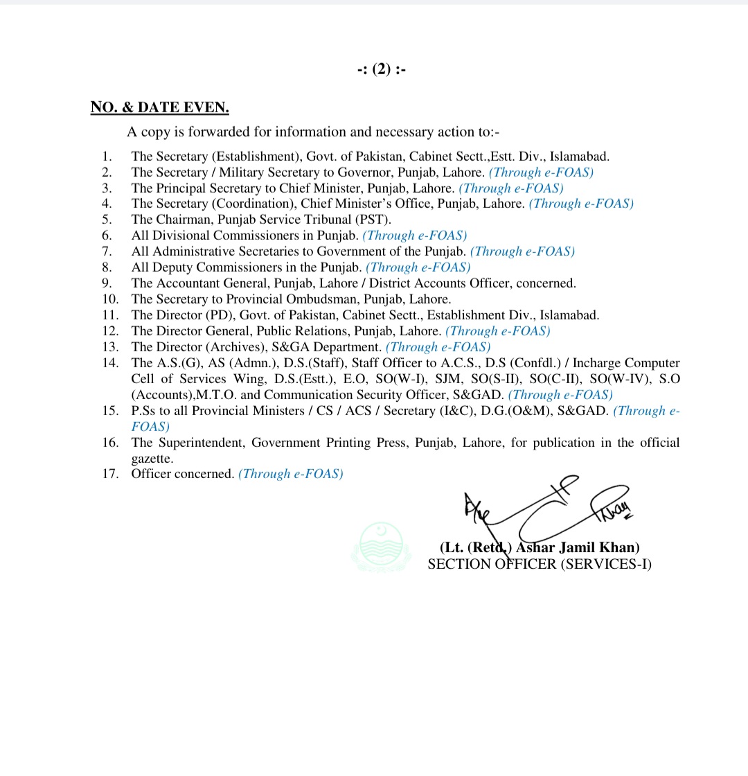 حافظ عرفان حمید کو ڈائریکٹر محکمہ لیٹریسی اینڈ نان فارمل بیسک ایجوکیشن تعینات کیا گیا ہے۔احمد فراز کو ڈائریکٹر فاٹا تعینات کردیا گیا ہے۔مظہر علی سرور کو ڈپٹی سیکرٹری محکمہ صحت تعینات کردیا گیا ہے۔رانا شکیل سرور کو ایڈیشنل سیکرٹری محکمہ سپیشلائڑذ ہیلتھ کیئر تعینات کردیا گیا ہے۔محمد عاطف کو ڈپٹی سیکرٹری محکمہ کھیل تعینات کردیا گیا ہے۔عرفان ممتاز خان کو ڈپٹی سیکرٹری بورڈ آف ریونیو تعینات کردیا گیا ہے۔صولت حیات وٹو کو ڈپٹی سیکرٹری ہوم ڈیپارٹمنٹ تعینات کردیا گیا۔محمد اسد علی کو ایڈیشنل ڈپٹی کمشنر جنرل کوٹ اددو تعینات کردیا گیا ہے۔عبدالرزاق علی ڈوگر کی خدمات محکمہ لوکل گورنمنٹ اینڈ کمیونٹی ڈویلپمنٹ کے سپرد ، محمد شاہ رخ کی خدمات ڈائریکٹر جنرل پنجاب پارکس اینڈ ہارٹی کلچر اتھارٹی کے سپرد۔صفدر حسین ورک کی خدمات پنجاب ریونیو اتھارٹی کے سپرد کر دی گئی ہیں