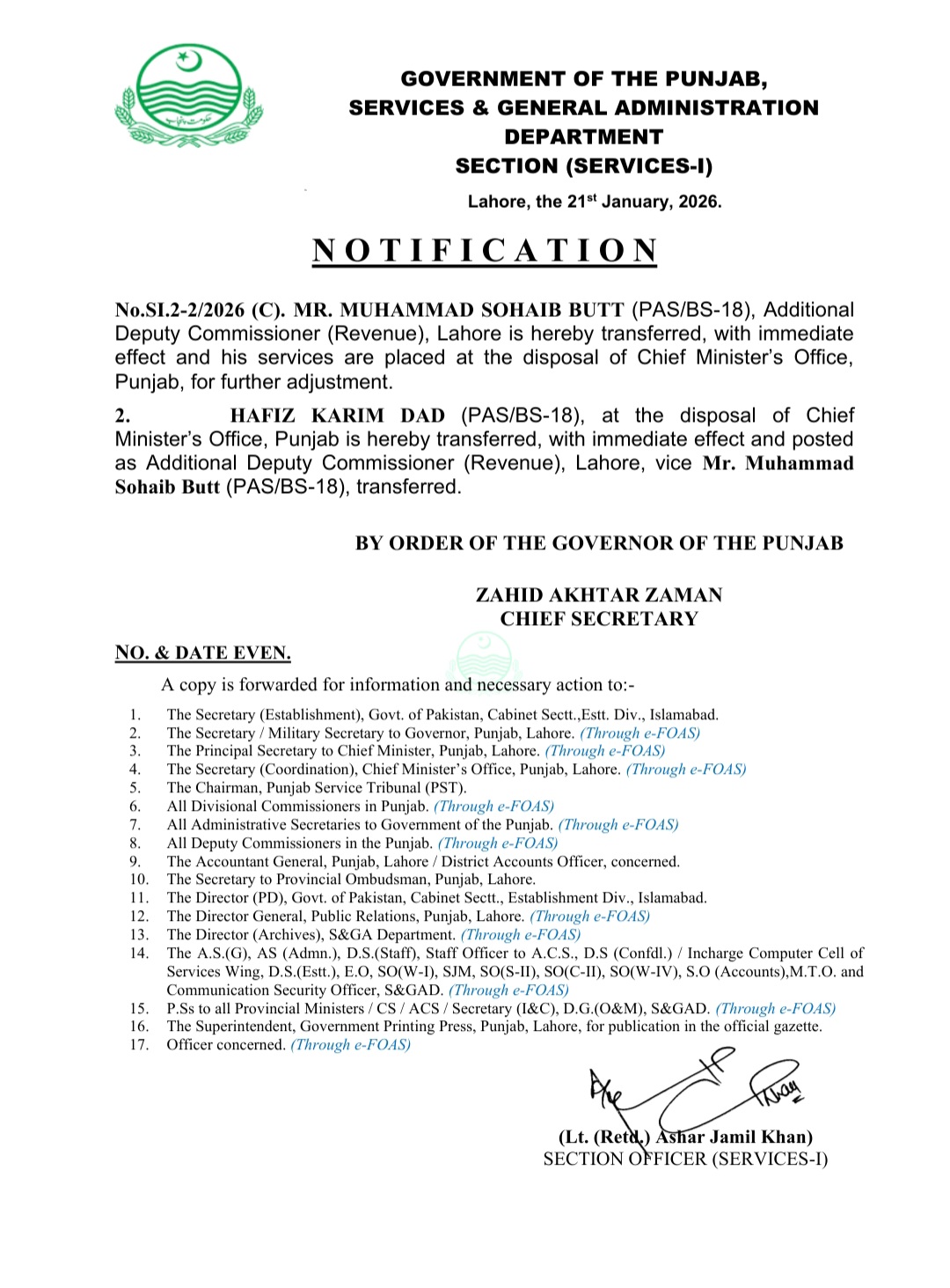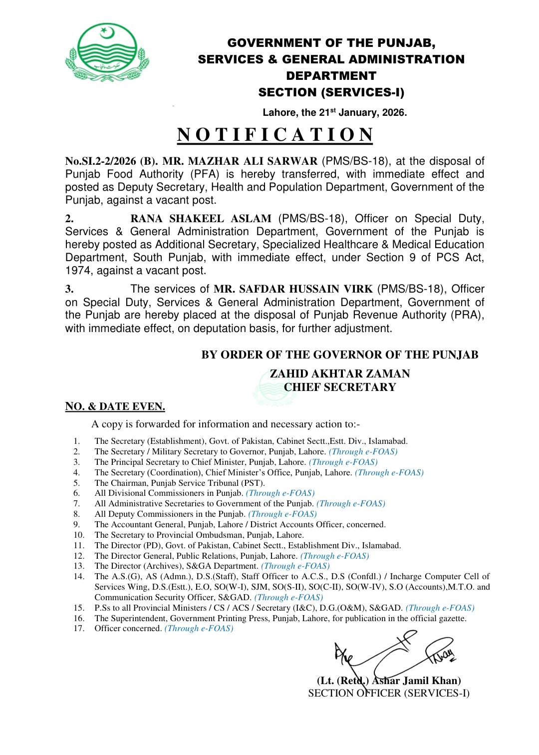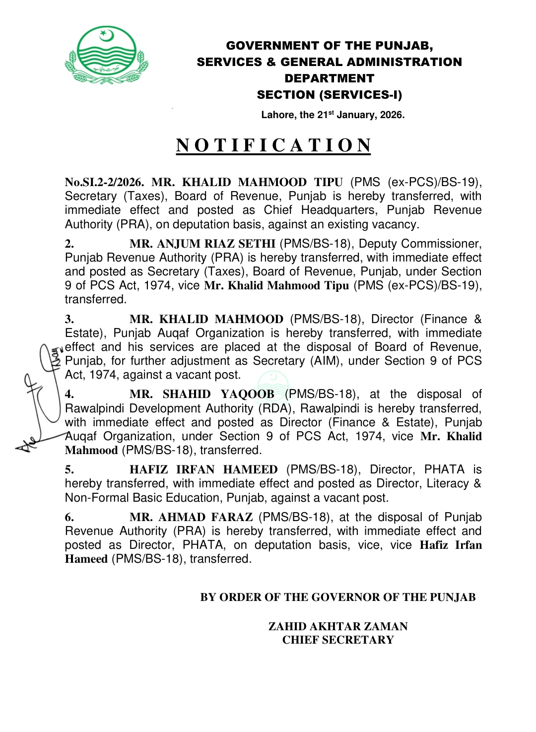 حافظ عرفان حمید کو ڈائریکٹر محکمہ لیٹریسی اینڈ نان فارمل بیسک ایجوکیشن تعینات کیا گیا ہے۔احمد فراز کو ڈائریکٹر فاٹا تعینات کردیا گیا ہے۔مظہر علی سرور کو ڈپٹی سیکرٹری محکمہ صحت تعینات کردیا گیا ہے۔رانا شکیل سرور کو ایڈیشنل سیکرٹری محکمہ سپیشلائڑذ ہیلتھ کیئر تعینات کردیا گیا ہے۔محمد عاطف کو ڈپٹی سیکرٹری محکمہ کھیل تعینات کردیا گیا ہے۔عرفان ممتاز خان کو ڈپٹی سیکرٹری بورڈ آف ریونیو تعینات کردیا گیا ہے۔صولت حیات وٹو کو ڈپٹی سیکرٹری ہوم ڈیپارٹمنٹ تعینات کردیا گیا۔محمد اسد علی کو ایڈیشنل ڈپٹی کمشنر جنرل کوٹ اددو تعینات کردیا گیا ہے۔عبدالرزاق علی ڈوگر کی خدمات محکمہ لوکل گورنمنٹ اینڈ کمیونٹی ڈویلپمنٹ کے سپرد ، محمد شاہ رخ کی خدمات ڈائریکٹر جنرل پنجاب پارکس اینڈ ہارٹی کلچر اتھارٹی کے سپرد۔صفدر حسین ورک کی خدمات پنجاب ریونیو اتھارٹی کے سپرد کر دی گئی ہیں