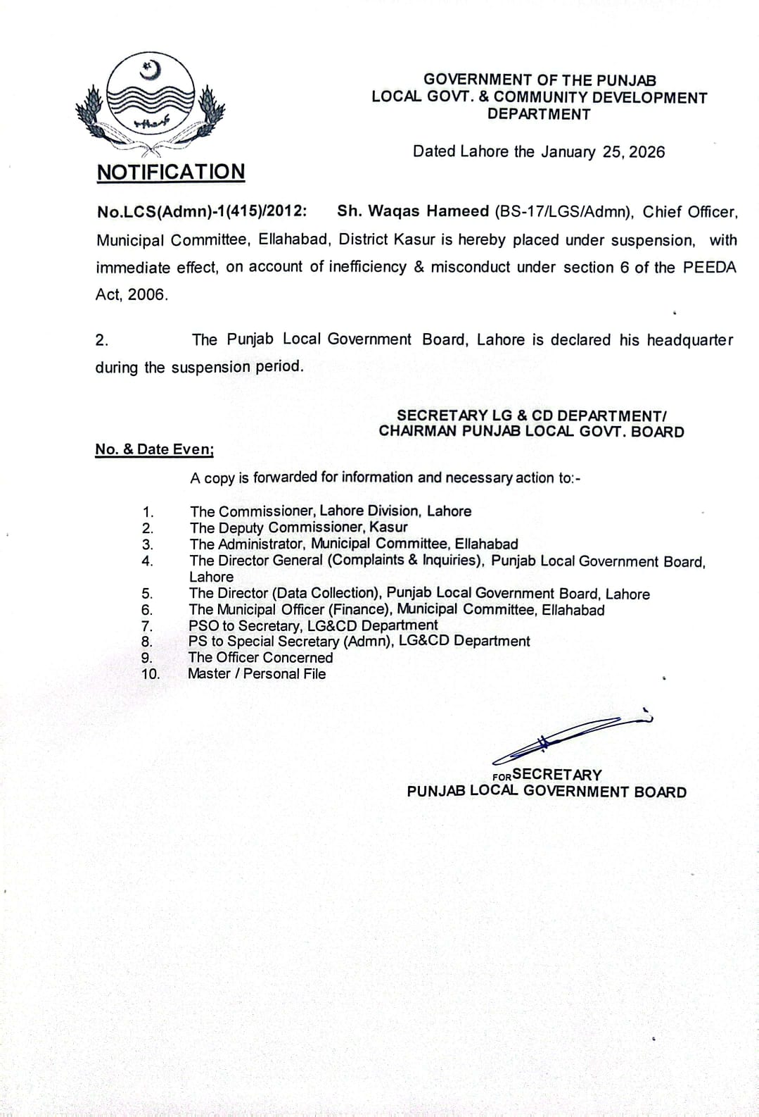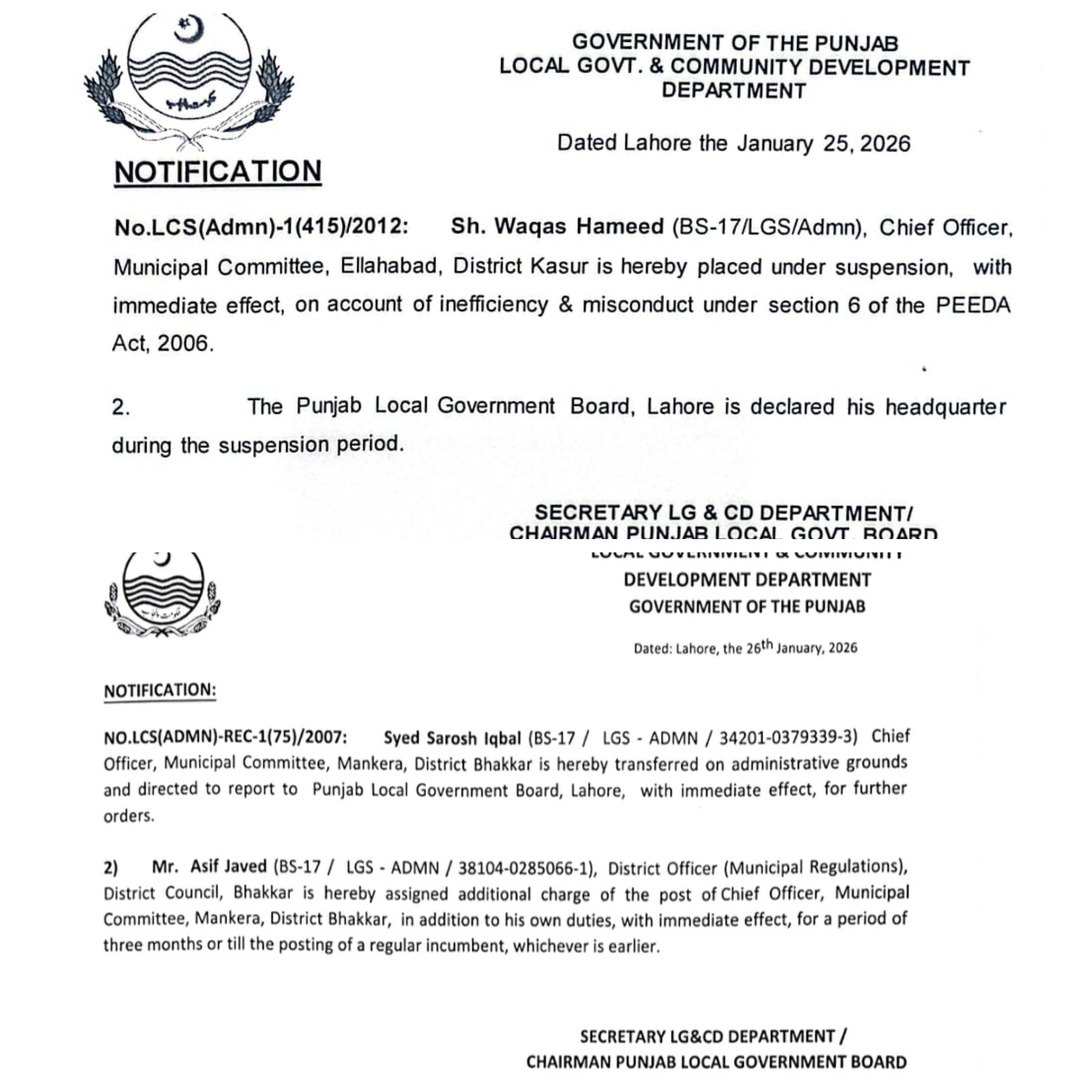 محکمہ بلدیات پنجاب نے نااہلی اور بد انتظامی پر چیف آفیسر میونسپل کمیٹی آلہ آباد ضلع قصور وقاص حمید کو معطل کر دیا ہے۔سیکرٹری لوکل گورنمنٹ شکیل احمد میاں نے پیڈا ایکٹ کے تحت انکوائری کا بھی حکم دے دیا ہے۔چیف آفیسر میونسپل کمیٹی منکیرہ سید سروش اقبال کو او ایس ڈی بنا دیا گیا ہے