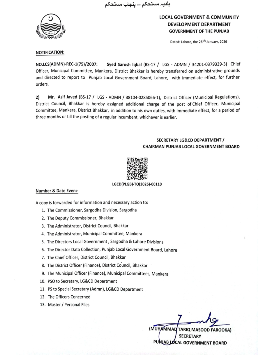 انھیں لوکل گورنمنٹ بورڈ رپورٹ کرنے کی ہدایت کی گئی ہے۔ڈسٹرکٹ آفیسر ریگولیشنز ضلع کونسل بھکر آصف جاوید کو چیف آفیسر ایم سی منکیرہ کا اضافی چارج تفویض کیا گیا ہے۔محکمہ بلدیات کی جانب سے نوٹیفکیشنز جاری کر دیئے گئے ہیں۔