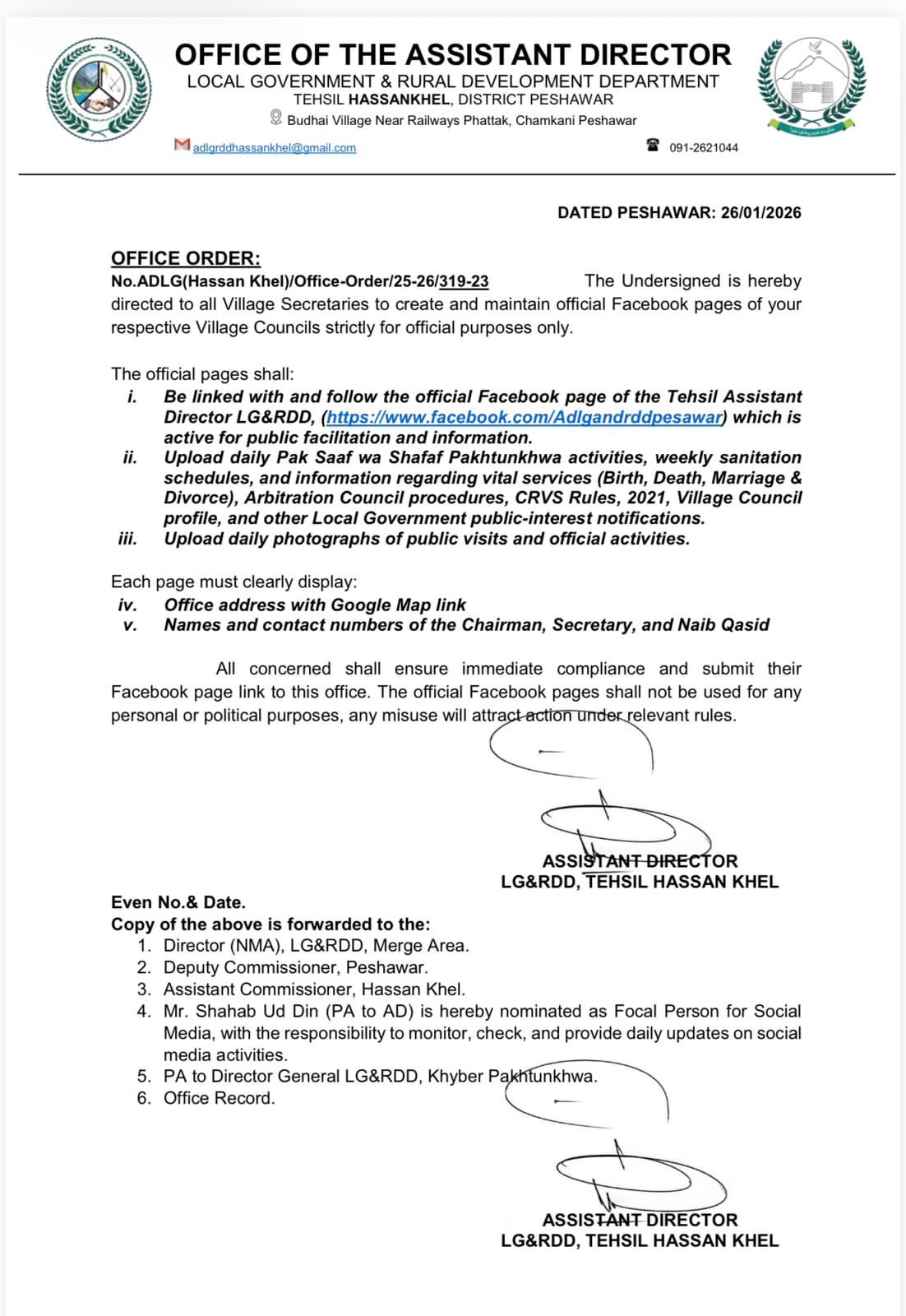 محکمہ بلدیات و دیہی ترقی خیبر پختونخوا نے تحصیل حسن خیل میں مقامی حکومتوں کو عوام کے مزید قریب لانے اور شفافیت کے فروغ کے لیے ایک اہم اور بروقت اقدام اٹھایا ہے۔ اس ضمن میں اسسٹنٹ ڈائریکٹر بلدیات تحصیل حسن خیل ملک ارشد خان کی جانب سے تمام ویلج کونسلوں کے سیکرٹریز کو ہدایت جاری کی گئی ہے کہ وہ اپنی متعلقہ ویلج کونسلوں کے سرکاری فیس بک پیجز قائم کریں اور انہیں صرف سرکاری مقاصد کے لیے استعمال میں لائیں۔جاری کردہ آفس آرڈر کے مطابق تمام ویلج کونسلوں کے سرکاری فیس بک پیجز کو تحصیل اسسٹنٹ ڈائریکٹر بلدیات کے آفیشل فیس بک پیج سے منسلک کرنا لازم ہوگا، جہاں سے عوام کو سہولیات، معلومات اور حکومتی اقدامات سے بروقت آگاہی فراہم کی جائے گی۔ ان پیجز پر روزانہ کی بنیاد پر پاک صاف و شفاف پختونخوا سرگرمیاں، ہفتہ وار صفائی شیڈول، پیدائش، وفات، شادی و طلاق، ثالثی کونسل، CRVS قواعد 2021، اور دیگر عوامی مفاد سے متعلق اطلاعات شیئر کی جائیں گی۔
