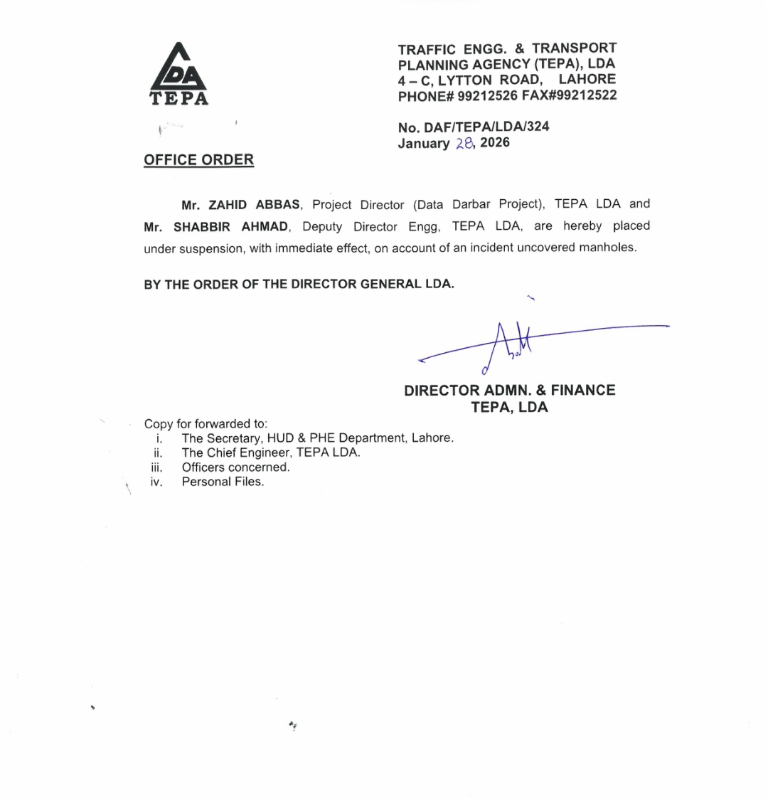 زاہد عباس، پراجیکٹ ڈائریکٹر (داتا دربار پراجیکٹ)، ٹی ای پی اے ایل ڈی اے اورشبیر احمد، ڈپٹی ڈائریکٹر انجینئر، ٹی ای پی اے ایل ڈی اے، کو بھی فوری طور پر، مین ہولز کے بے نقاب ہونے کے واقعے کی وجہ سے معطل کر دیا گیا ہے۔*ترجمان محکمہ ہاؤسنگ پنجاب* کے مطابق بھاٹی کے علاقے میں ماں اور بیٹی کا مین ہول میں گرنے کا واقعہ پروزیر اعلیٰ پنجاب کی ہدایت پر غفلت اور کوتاہی کے مرتکب پراجیکٹ ڈائریکٹر بھی معطل کر دیا گیا ہے۔سیکرٹری ہاؤسنگ نورالامین مینگل نے پراجیکٹ ڈائریکٹر زاہد عباس کی معطلی کے بھی احکامات جاری کر دیئے ہیں