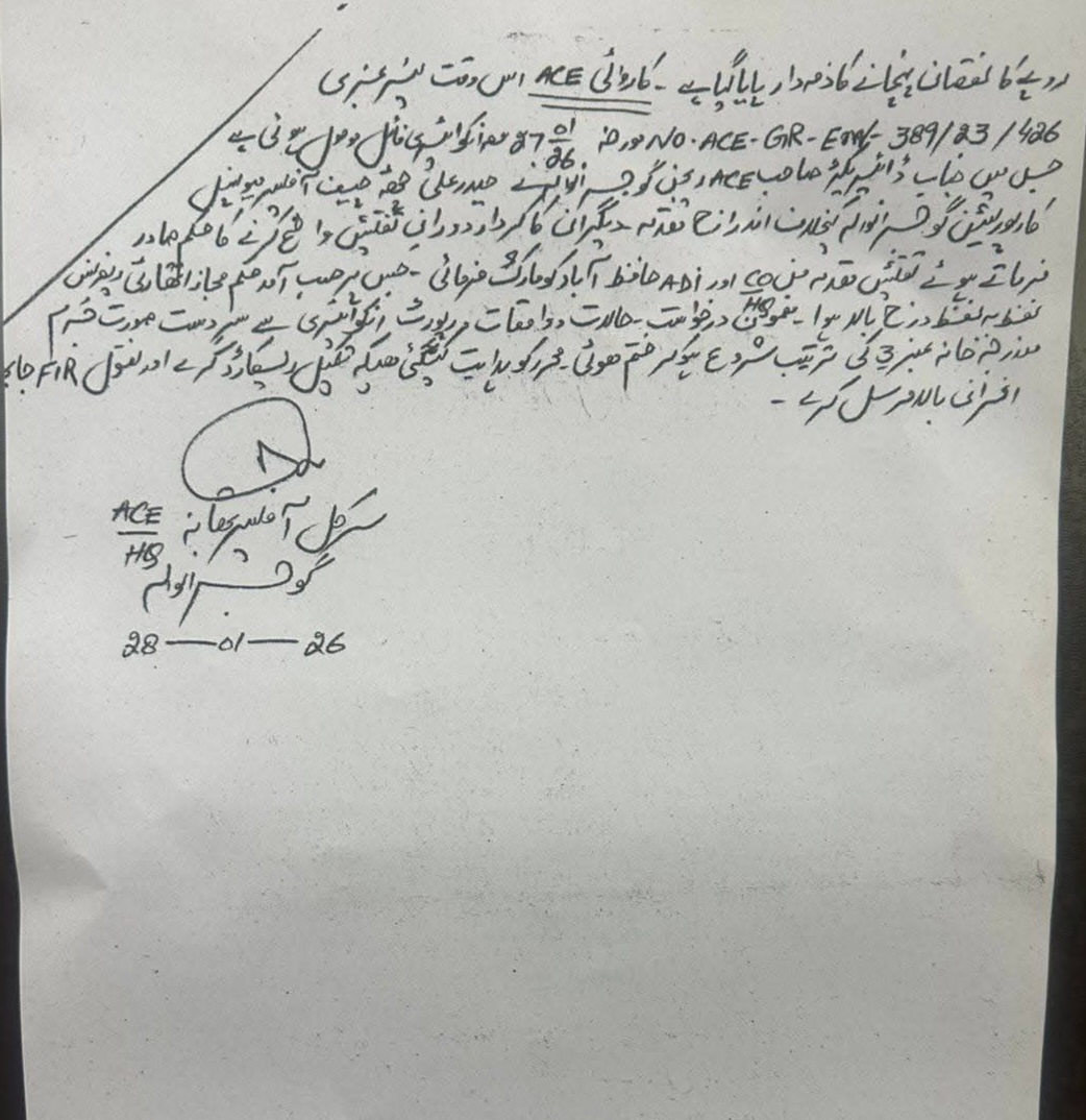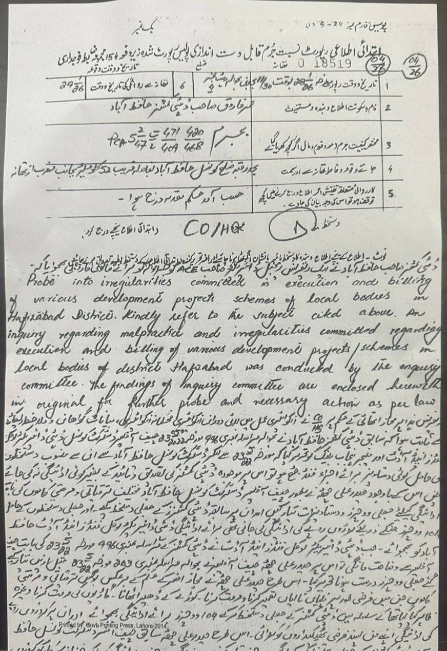 گوجرانوالہ سے موصول ہونے والی ایک میڈیا رپورٹ کے مطابق سابق چیف آفیسر میونسپل کارپوریشن حیدر علی چھٹہ کے خلاف درج آیف آئی آر منظر عام پر آگئی۔۔۔۔۔ حیدر علی چھٹہ کے خلاف سابق ڈپٹی کمشنر حافظ آباد عمر فاروق وڑائچ نے 2022 میں ایک ریفرنس ارسال کیا تھا جس میں کہا گیا تھا کہ حیدر علی چھٹہ نے بطور ضلع کونسل افسر حافظ اباد ڈپٹی کمشنر کے جعلی دستخط کر کے 104 بوگس واؤچرز کے ذریعے ترقیاتی کاموں کے نام پر فنڈز ہڑپ کئے انٹی کرپشن نے ڈپٹی کمشنر کی طرف سے بھیجے جانے والے ریفرنس پر تحقیقات کے بعد مقدمہ درج کیا اور گزشتہ روز انہیں گرفتار کر لیا ۔انٹی کرپشن حکام نے ان کا چار روزہ ریمانڈ حاصل کر لیا ہے۔ابھی تک ان کے خلاف گوجرانوالہ کا کوئی مقدمہ درج نہیں۔۔۔۔۔۔۔۔۔۔