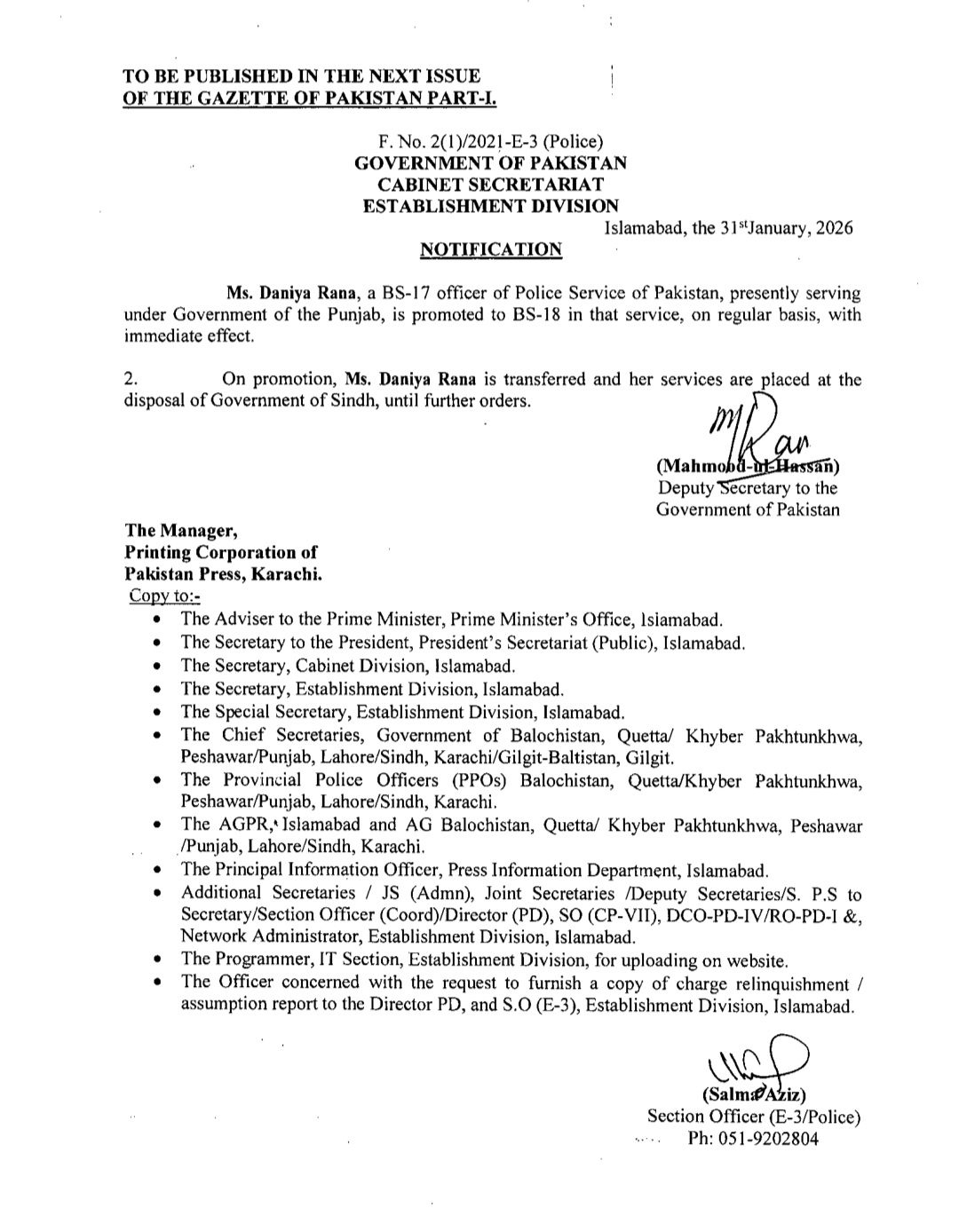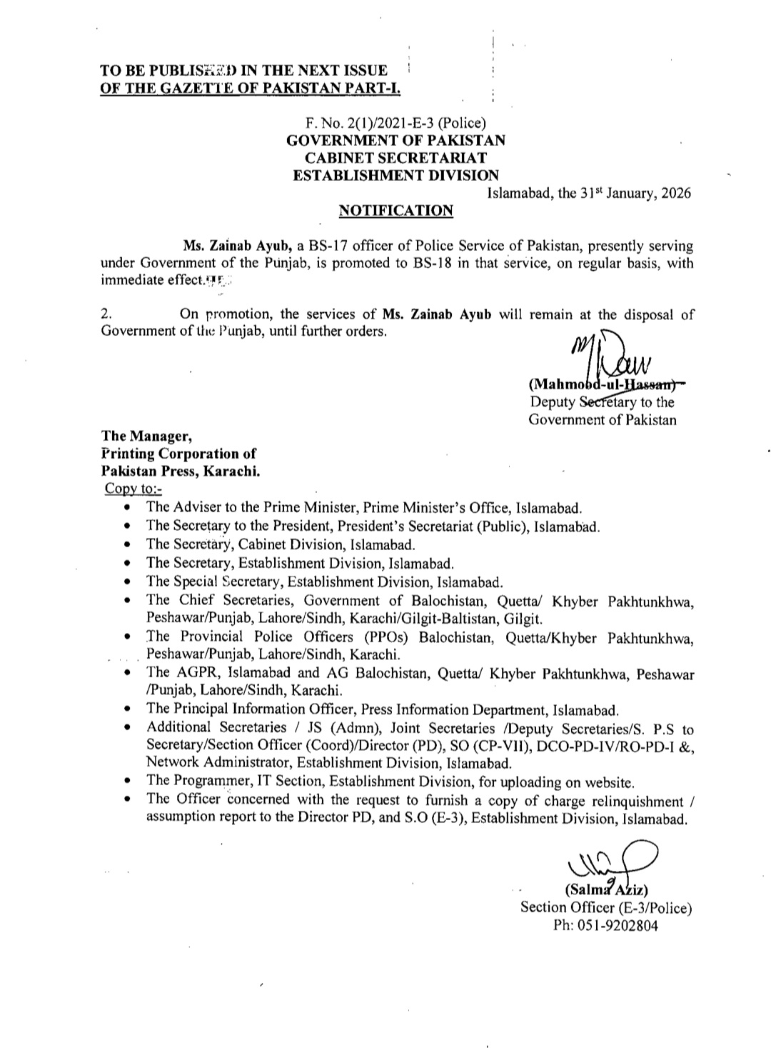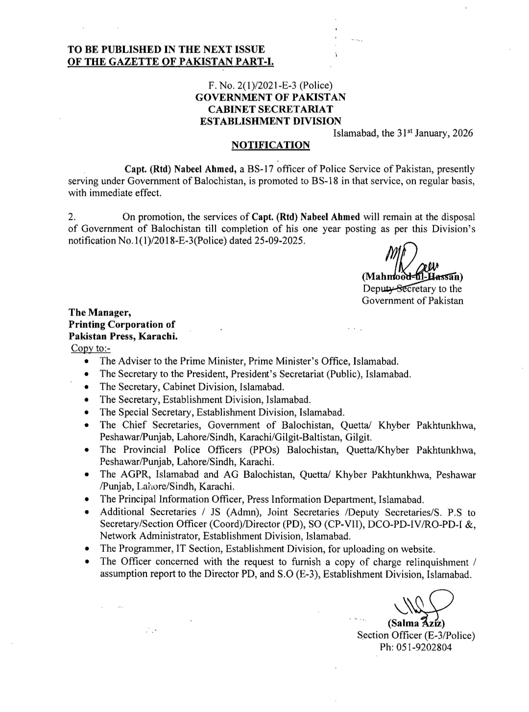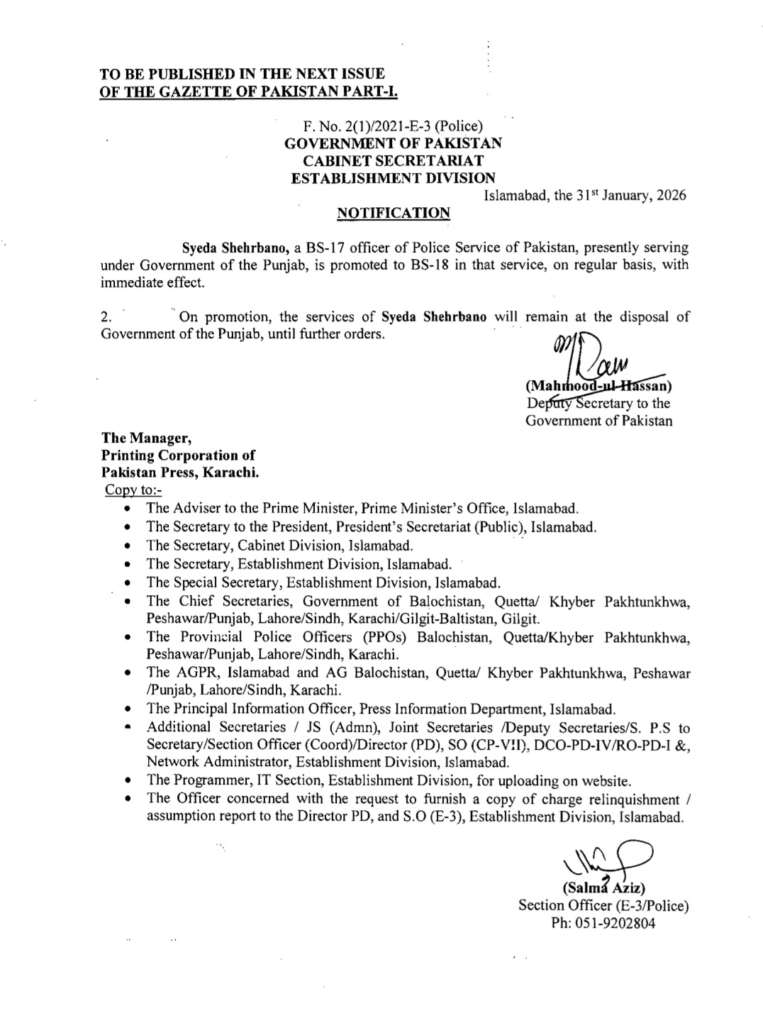 اسٹیبلشمنٹ ڈویژن نے متعدد اے ایس پیز کو ایس پی کے عہدے پر ترقی کا نوٹیفیکیشن جاری کردیا ہے۔ترقی پانے والوں میں ریشم جہانگیر، سیدہ شہر بانو نقوی، زینب ایوب اور دانیہ رانا شامل ہیں۔اس کے علاوہ گریڈ 17 سے18 میں ایس پی کے عہدے پر ترقی پانے والوں میں