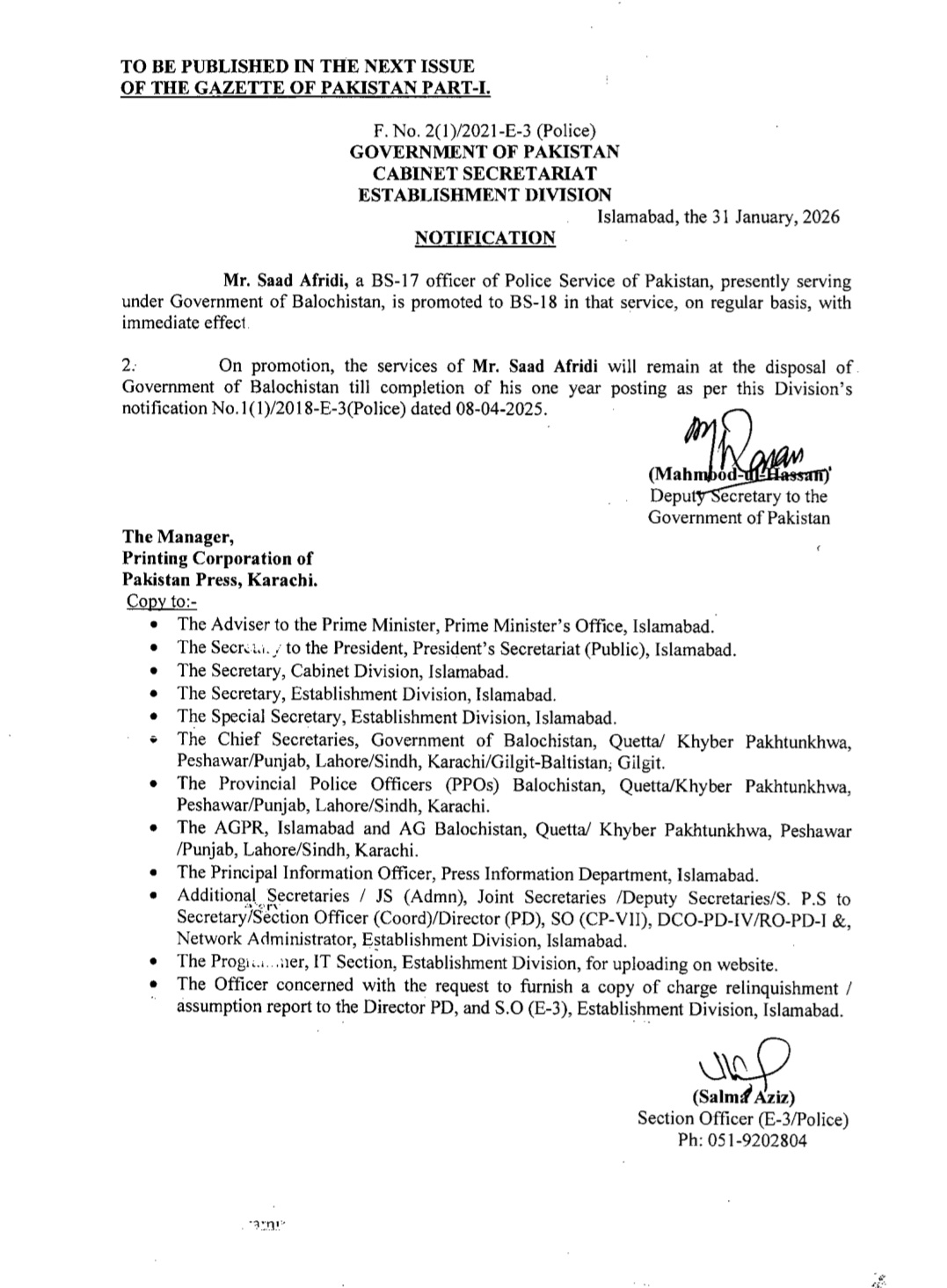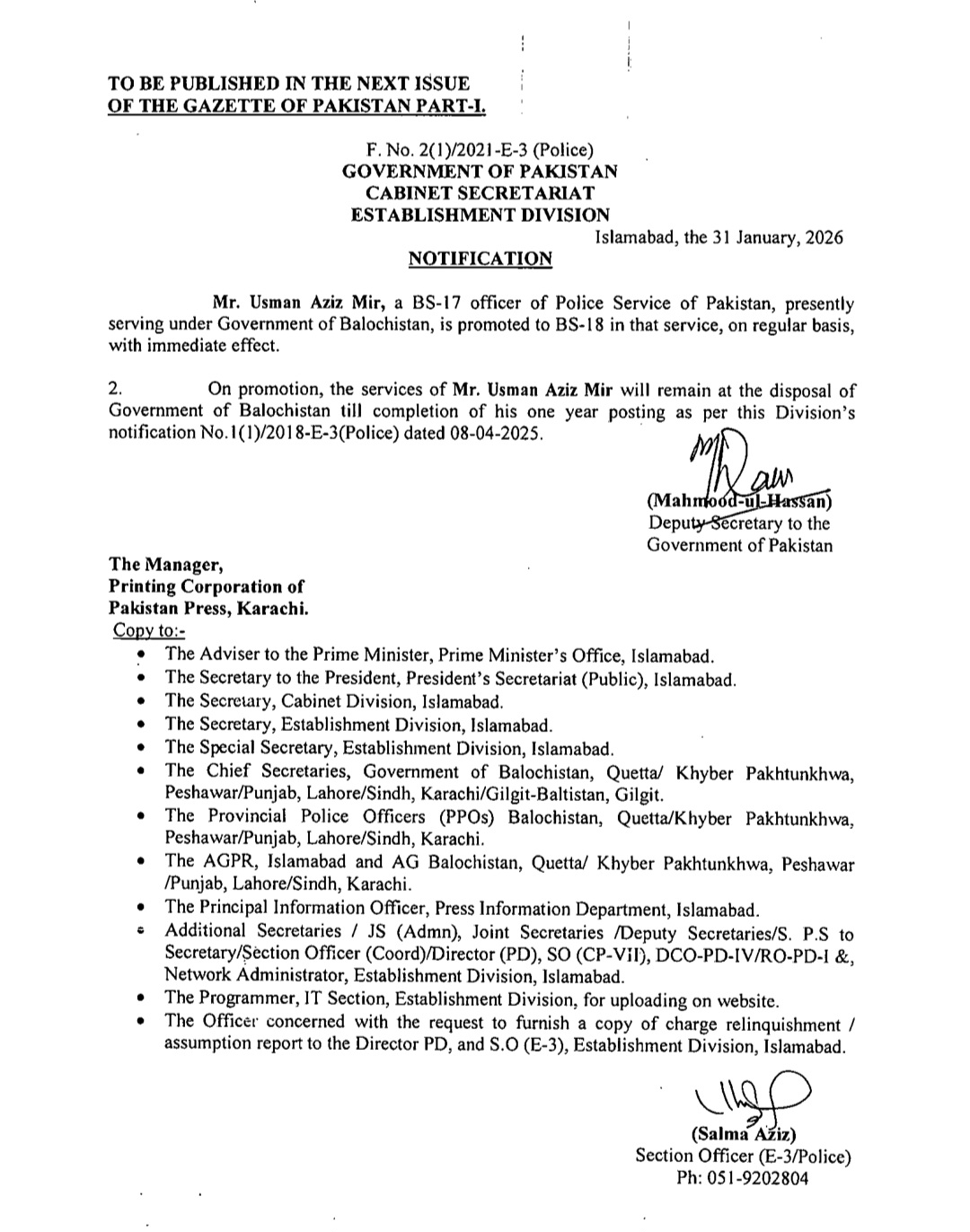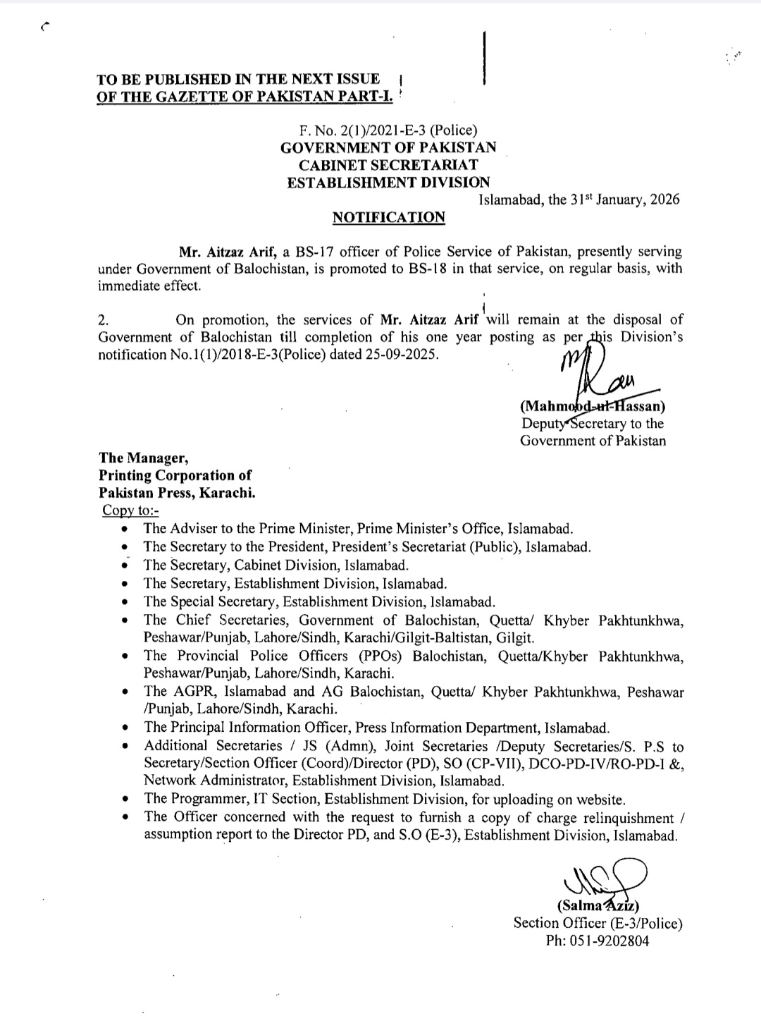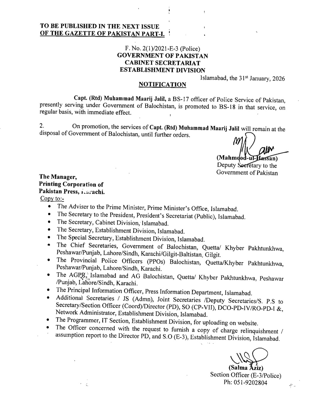اسٹیبلشمنٹ ڈویژن نے متعدد اے ایس پیز کو ایس پی کے عہدے پر ترقی کا نوٹیفیکیشن جاری کردیا ہے۔ترقی پانے والوں میں ریشم جہانگیر، سیدہ شہر بانو نقوی، زینب ایوب اور دانیہ رانا شامل ہیں۔اس کے علاوہ گریڈ 17 سے18 میں ایس پی کے عہدے پر ترقی پانے والوں میں