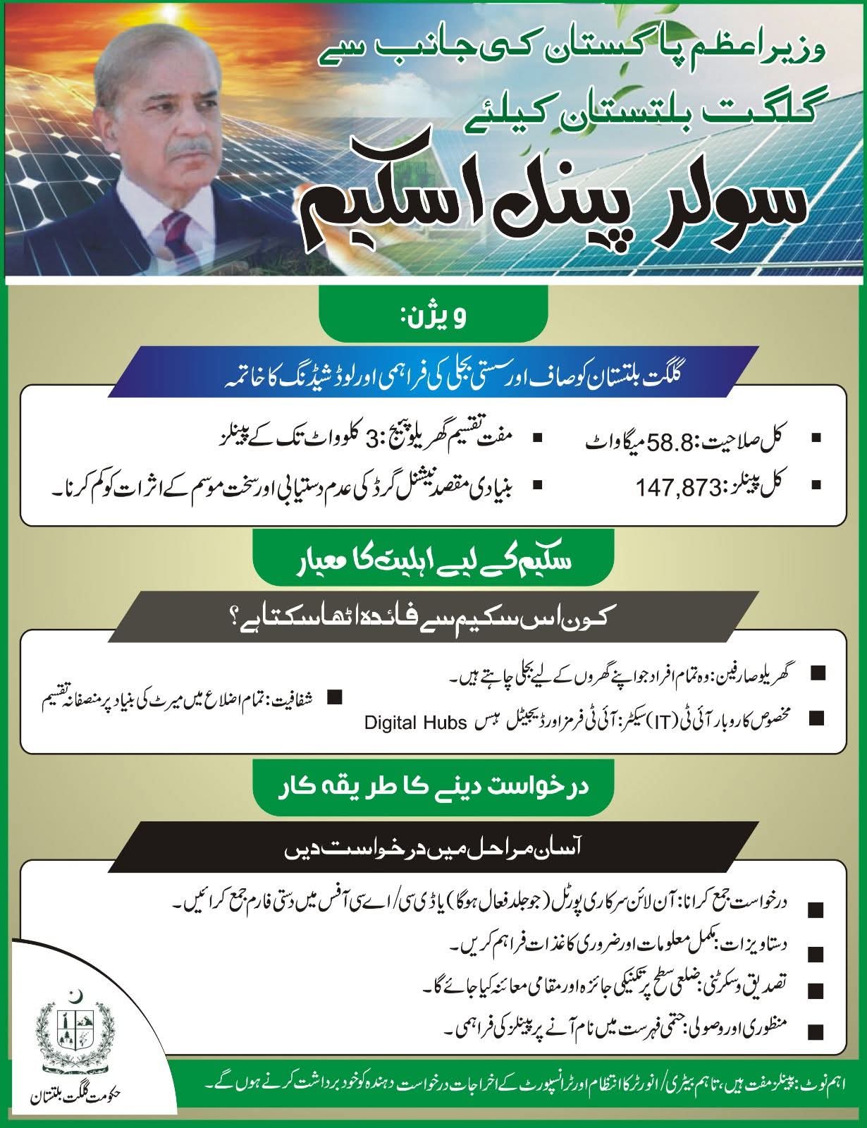 چونکہ گگت بلتستان کو ماضی میں یہاں کے مشکل جغرافیائی اعتبار سے یہاں کے بلند و بالا پہاڑی علاقے، سخت موسمی حالات اور نیشنل گرڈ کی عدم دستیابی کی وجہ سے شدید بجلی کے چیلنجز کا سامنا رہا ہے۔ ان مشکلات کو مدنظر رکھتے ہوئے، وزیراعظم پاکستان نے سولر توانائی کے پروگرام کے نفاذ کی ہدایت کی، جس کے تحت گھریلو صارفین اور چھوٹے و درمیانے کاروباری (SMEs) لوگوں کو آسانی سے بجلی فراہم ہوگی۔ اس سکیم کی کامیابی سے ایندھن پر انحصار بھی کم ہوگا اور ماحول دوست پائیدار ترقی کو فروغ دینے کے لیے کل 58.8 میگاواٹ کی صلاحیت کے سولر پینلز فراہم کیے جائیں گے۔سولر پینلز کی تقسیم کار مکمل جائزہ لینے کے بعد، حتمی اہل درخواست دہندگان میں 147,873 سولر پینلز مفت تقسیم کیے جائیں گے۔ حتمی اہل درخواست دہندگان کو سولر پینلز کے لیے بیٹری/انورٹر کا انتظام خود کرنا ہوگا اور سولر پینلز کی منتقلی کے ٹرانسپورٹ چارجز ادا کرنے ہوں گے۔