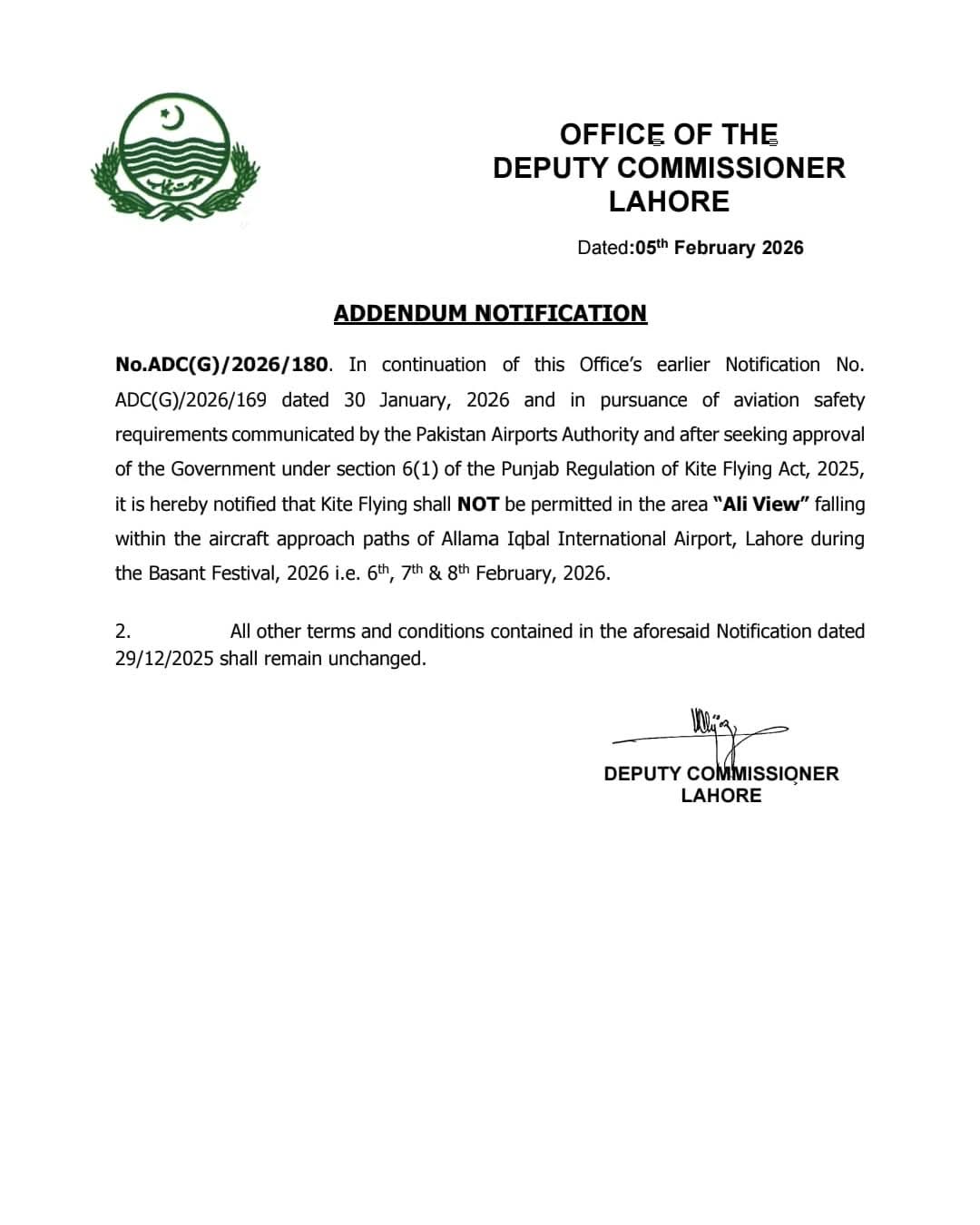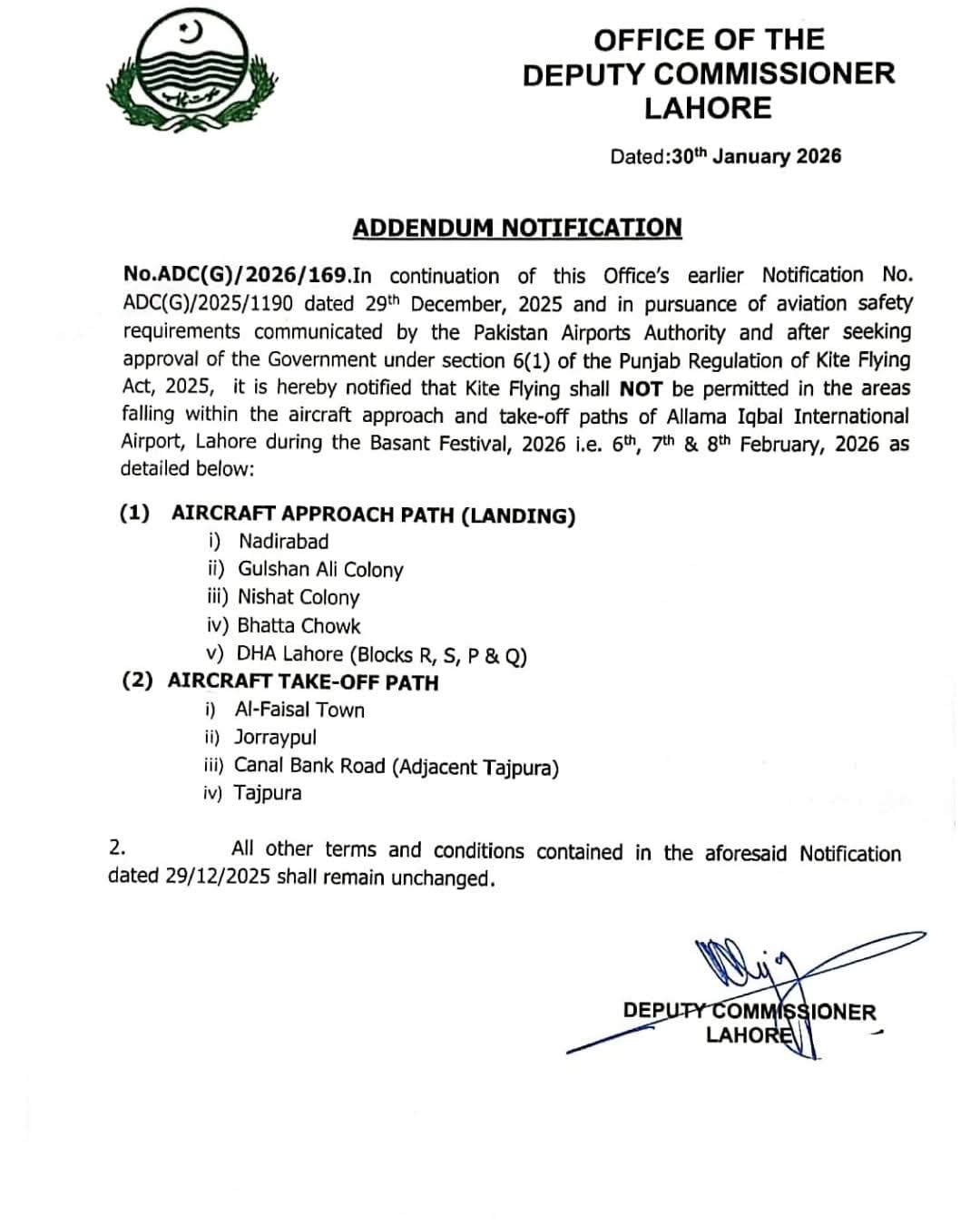 پابندی پاکستان ایئرپورٹس اتھارٹی کی ایوی ایشن سیفٹی کے حوالے سے سفارشات کی روشنی میں عائد کی گئی ہے۔ایئرکرافٹ لینڈنگ ایریا میں نادرآباد، گلشن علی کالونی، نشاط کالونی، بھٹہ چوک اور ڈی ایچ اے لاہور بلاکس P, Q, R اور S شامل ہیں۔ایئرکرافٹ ٹیک آف کے راستے میں الفیصل ٹاؤن، جوڑے پل، تاجپورہ سے ملحقہ کینال بینک روڈ اور تاجپورہ کے علاقے شامل ہیں۔جہازوں کے ٹیک آف اور لینڈنگ کے ان تمام علاقوں میں بسنت کے دوران بھی پتنگ بازی پر مکمل پابندی عائد ہے۔نوٹیفکیشن پنجاب کائٹ فلائنگ ایکٹ 2025 کے سیکشن 6(1) کے تحت حکومتی منظوری کے بعد جاری کیا گیا