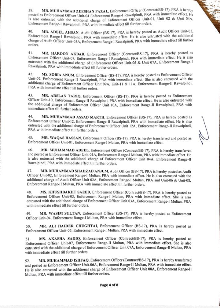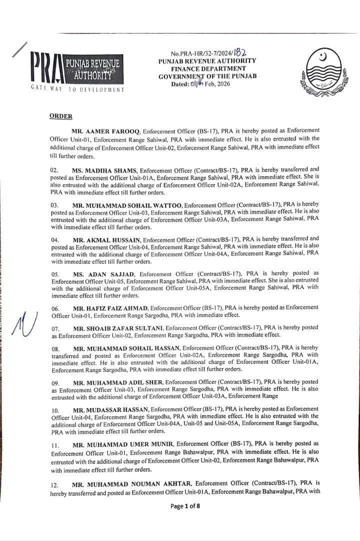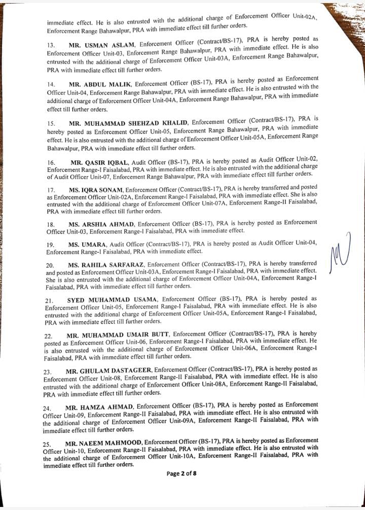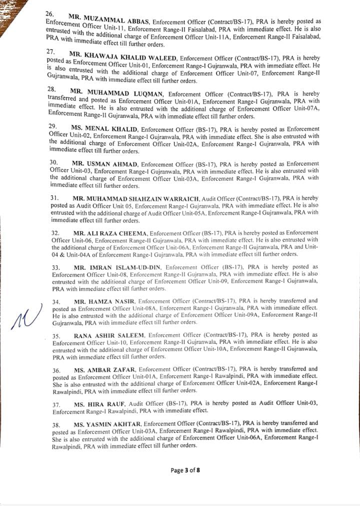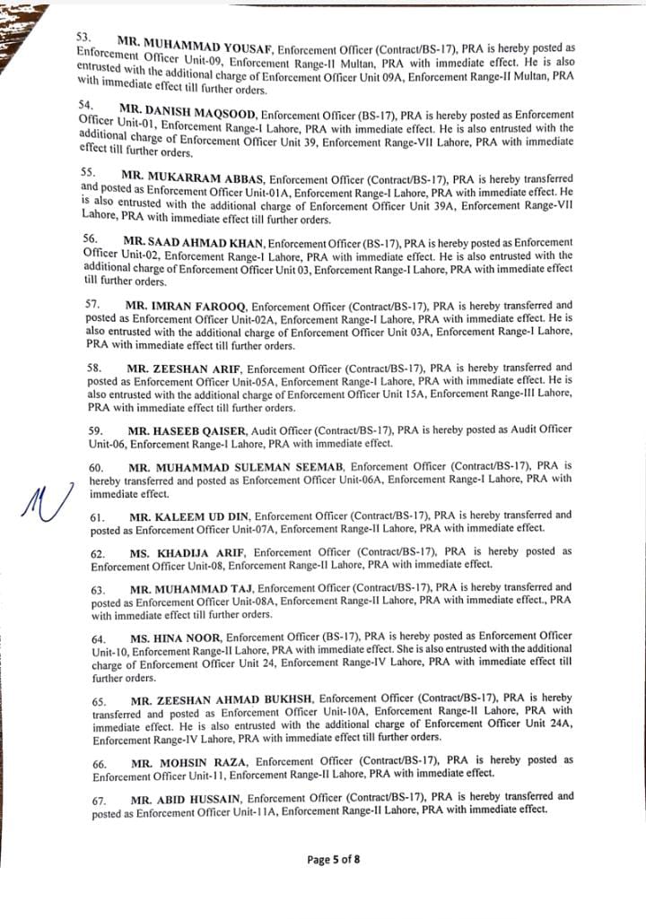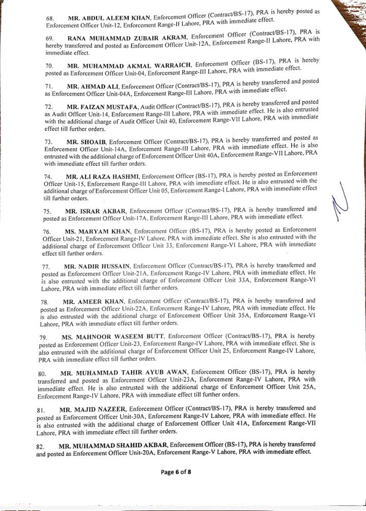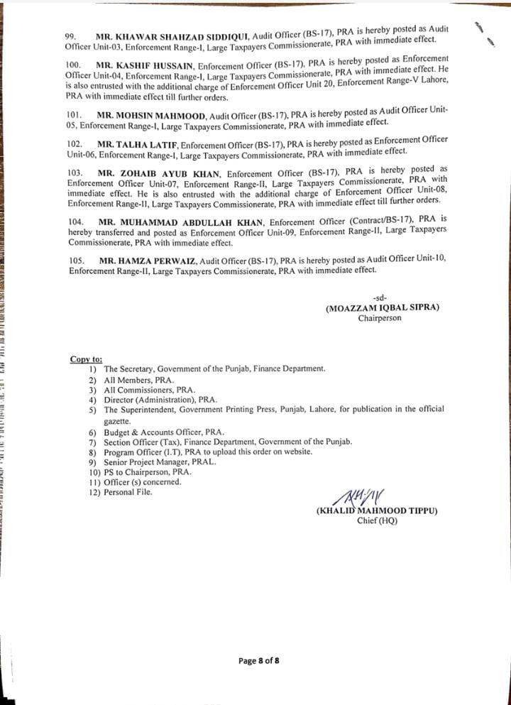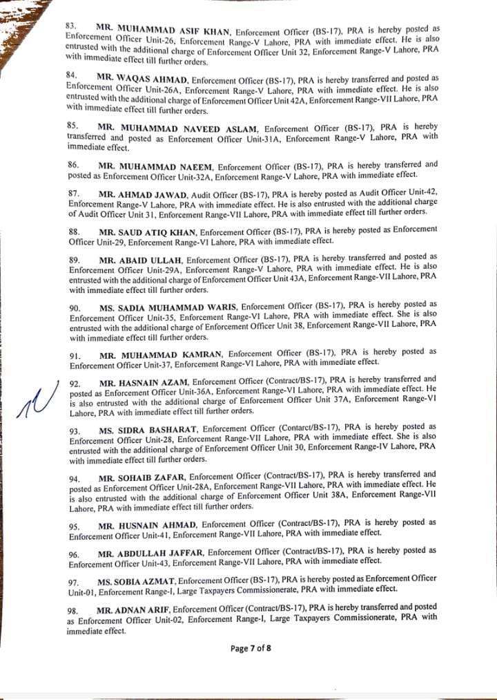 جن میں95 انفورسمنٹ افسران اور 10 آڈٹ افسران شامل ہیں۔لاہور 40، فیصل آباد 12، گوجرانولہ 09،ساہیوال 05 انفورسمنٹ افسران کے تقرر و تبادلے کیے گئے ہیں۔ملتان 08، بہاولپور 05، سرگودھا 05، راولپنڈی 03، بہاولپور 05 افسران کی تعیناتی کی گئی۔ترجمان پنجاب ریونیو اتھارٹی کے مطابق 09 افسران کو لارج ٹیکس پیئر یونٹ میں تعینات کیا گیا ہے۔نئے افسران کی تعیناتی سے فیلڈ آپریشن میں نمایاں اضافہ ہوگا۔